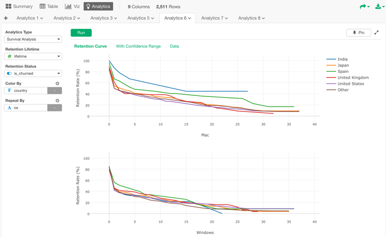 To analyze your retentions or churns better you need Cohort Analysis. And if you want to do it right, you need statistical algorithms like Kaplan-Meier. Cox Regression. With Exploratory, you can easily access them and quickly find which cohorts have the problems and what features are helping your customers retain.