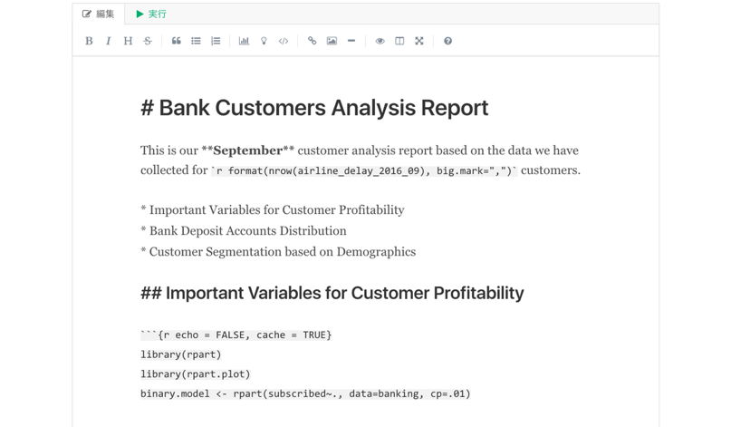 All the effort and time you spent for finding meaningful insights from your data will be lost if you fail to present and communicate them effectively with others. Exploratory makes it easier for you to write stories around your discoveries with the simple markdown editor. Not only you can embed charts and tables from your analysis, but also you can bring your favorite R packages natively to present your insights better.