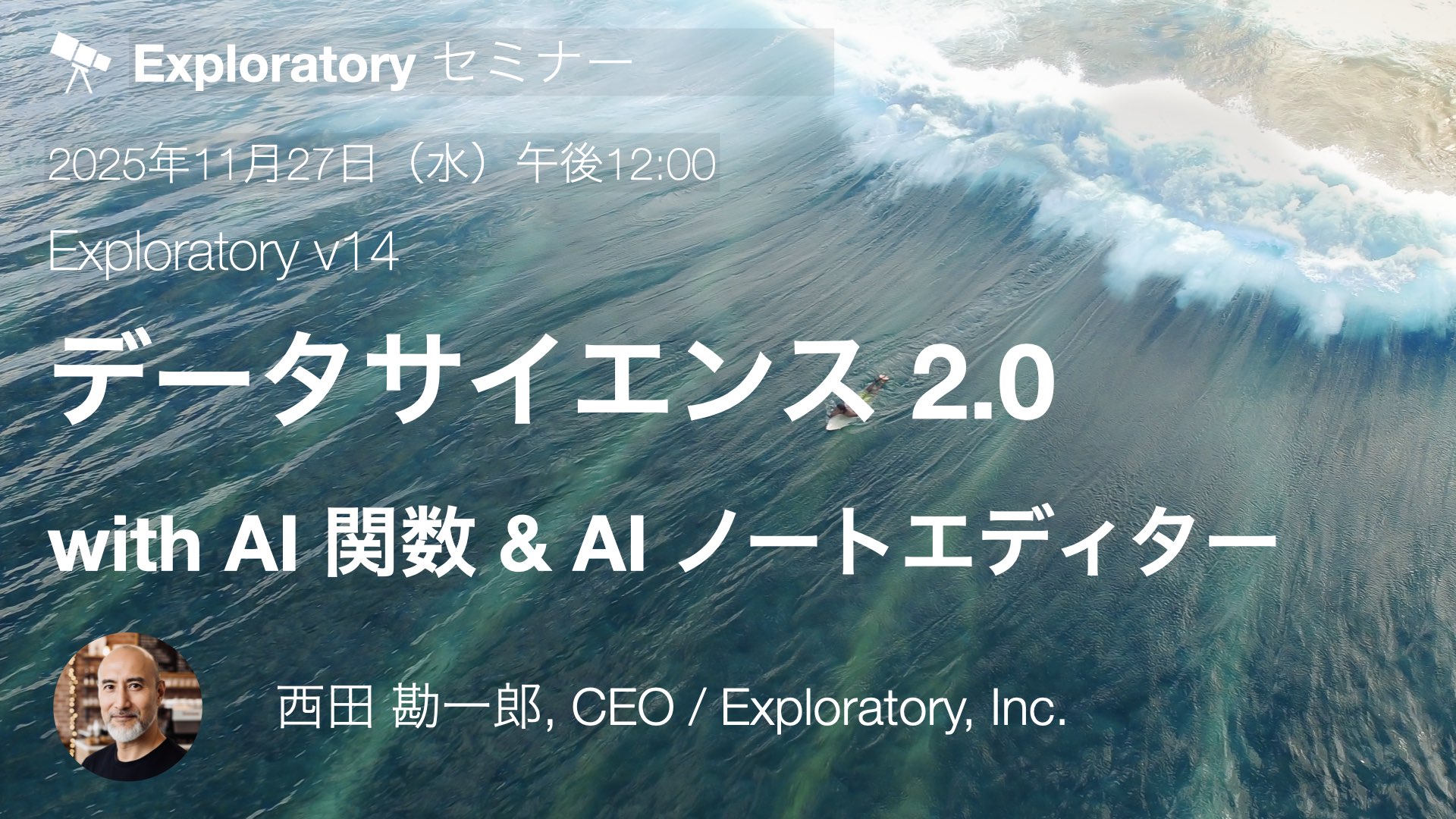 この”進化した新しいデータサイエンス”の恩恵をより多くの人たちが実感できるように、Exploratory v14 では 「AI 関数」 と 「AI ノートエディター」 という2つの強力なAI機能を新しく搭載しました。
