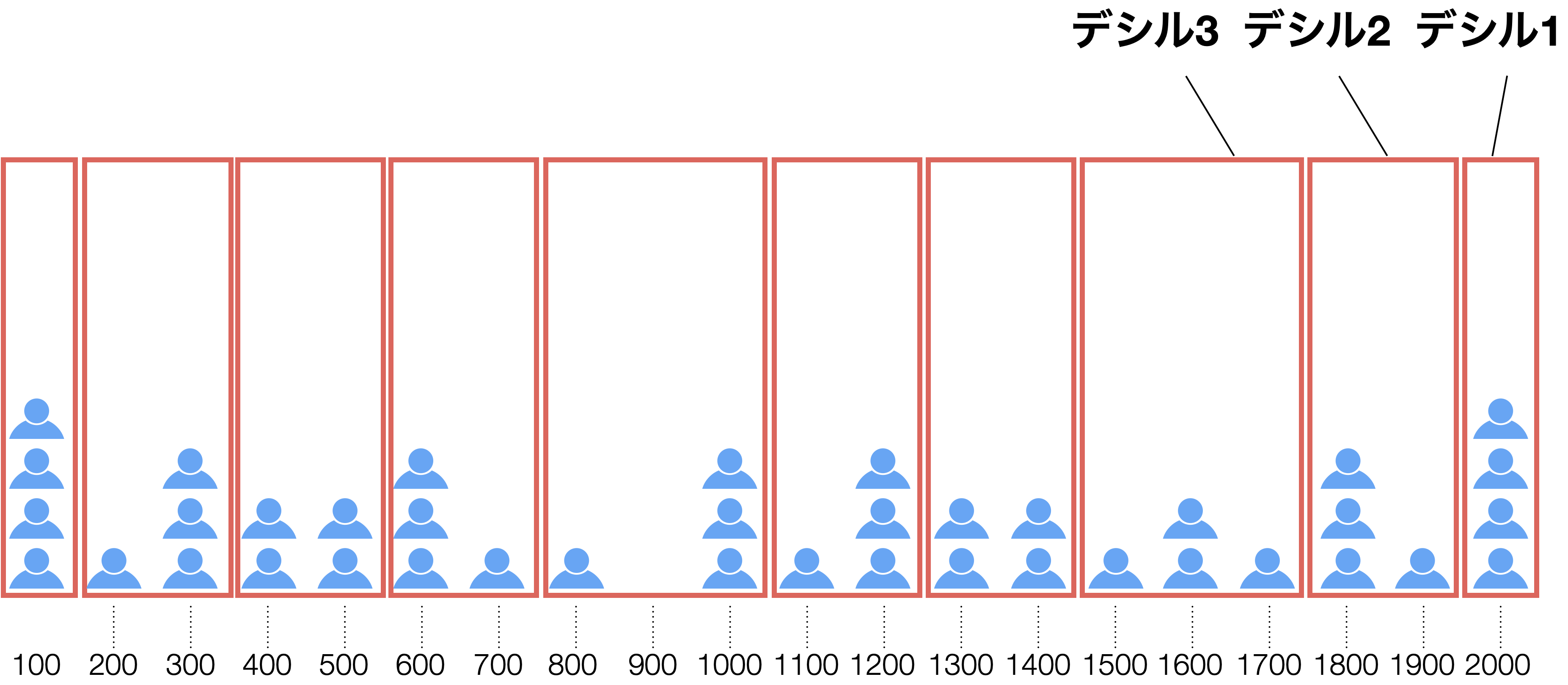 デシル分析は、対象がどれほど多くても、上から10%ずつをひとまとめにした「10本のバー」にする手法です。項目数がどれだけ膨大になっても、結果が常に10項目に整理されるため、全体の中での偏りが一目でわかります。