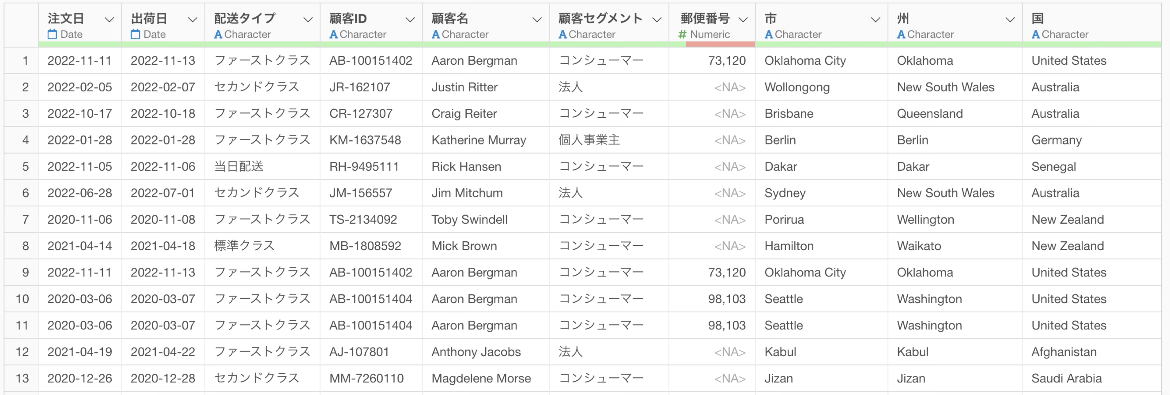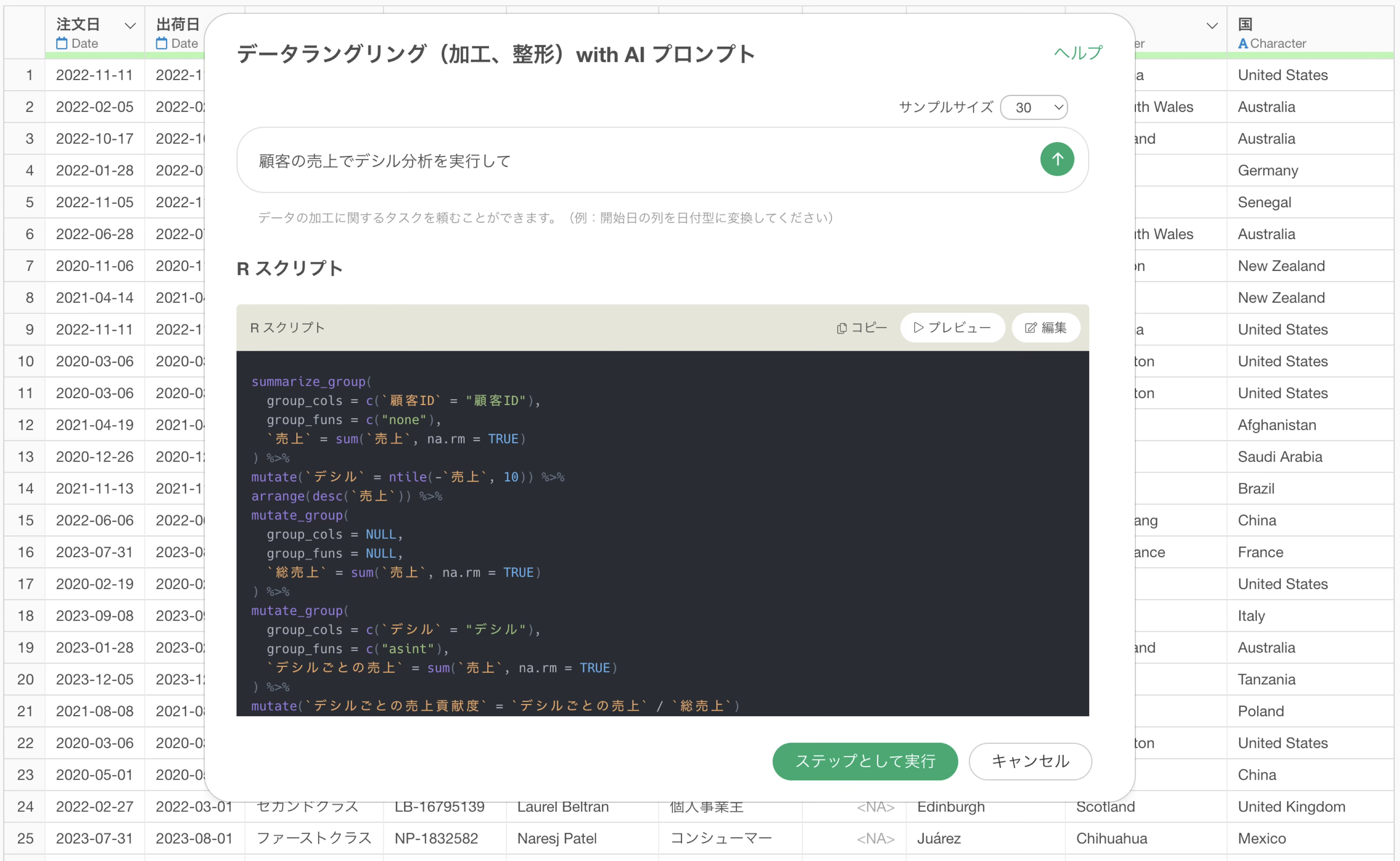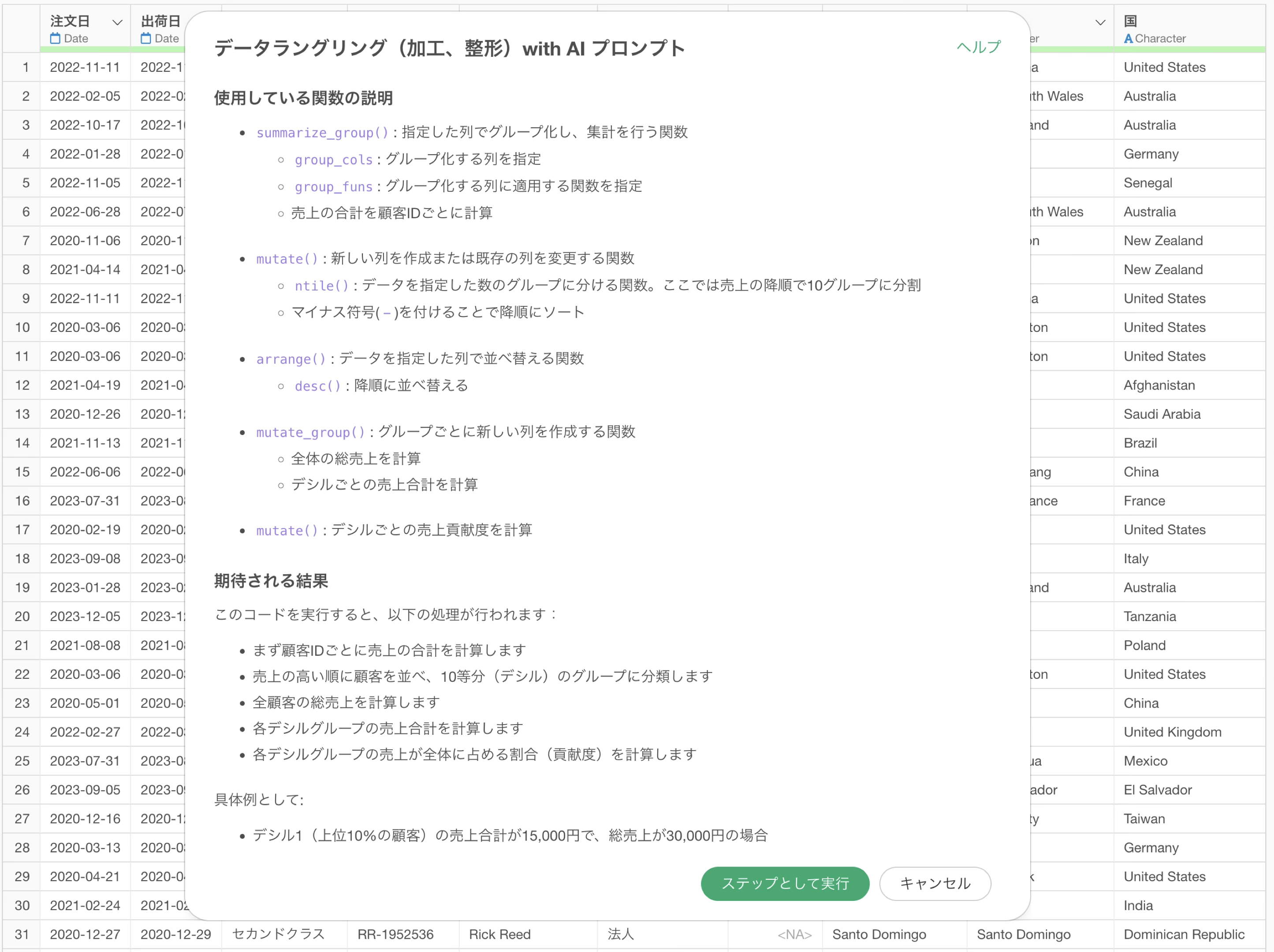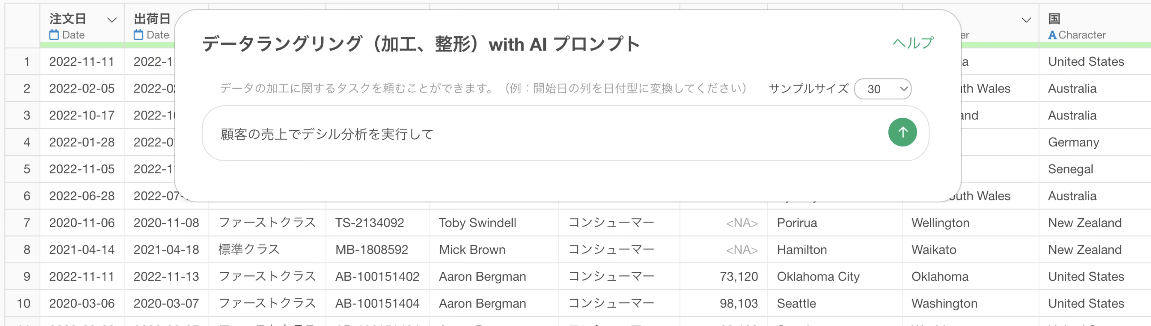 今回は、1行が1つの注文明細を表すデータを使って、AIプロンプトで顧客の売上に対するデシル分析を行います。