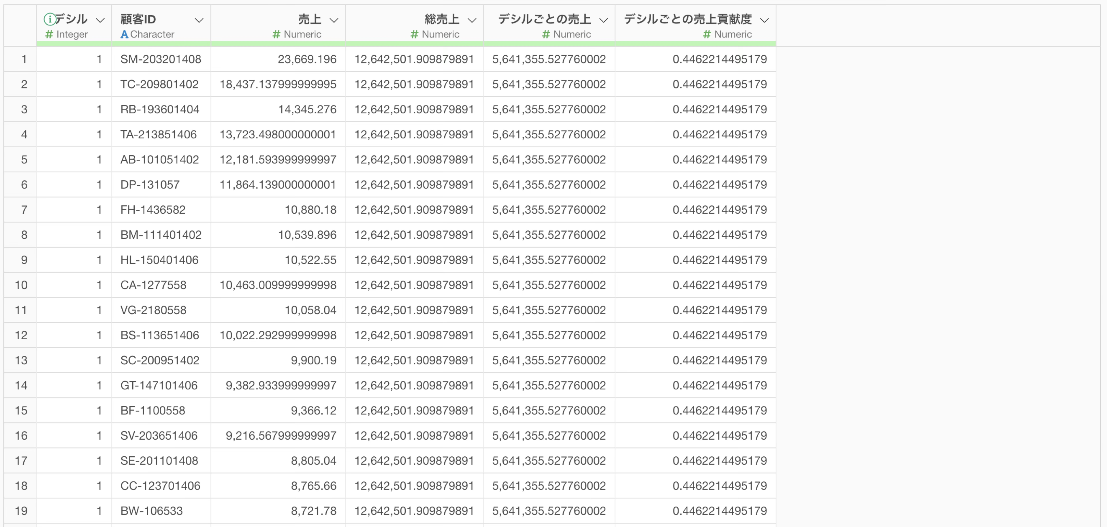 分析の目的に応じて、顧客以外の対象にも適用できます。例えば、製品別のデシル分析を行う場合は製品ID、店舗別の分析では店舗IDなどを使用します。
