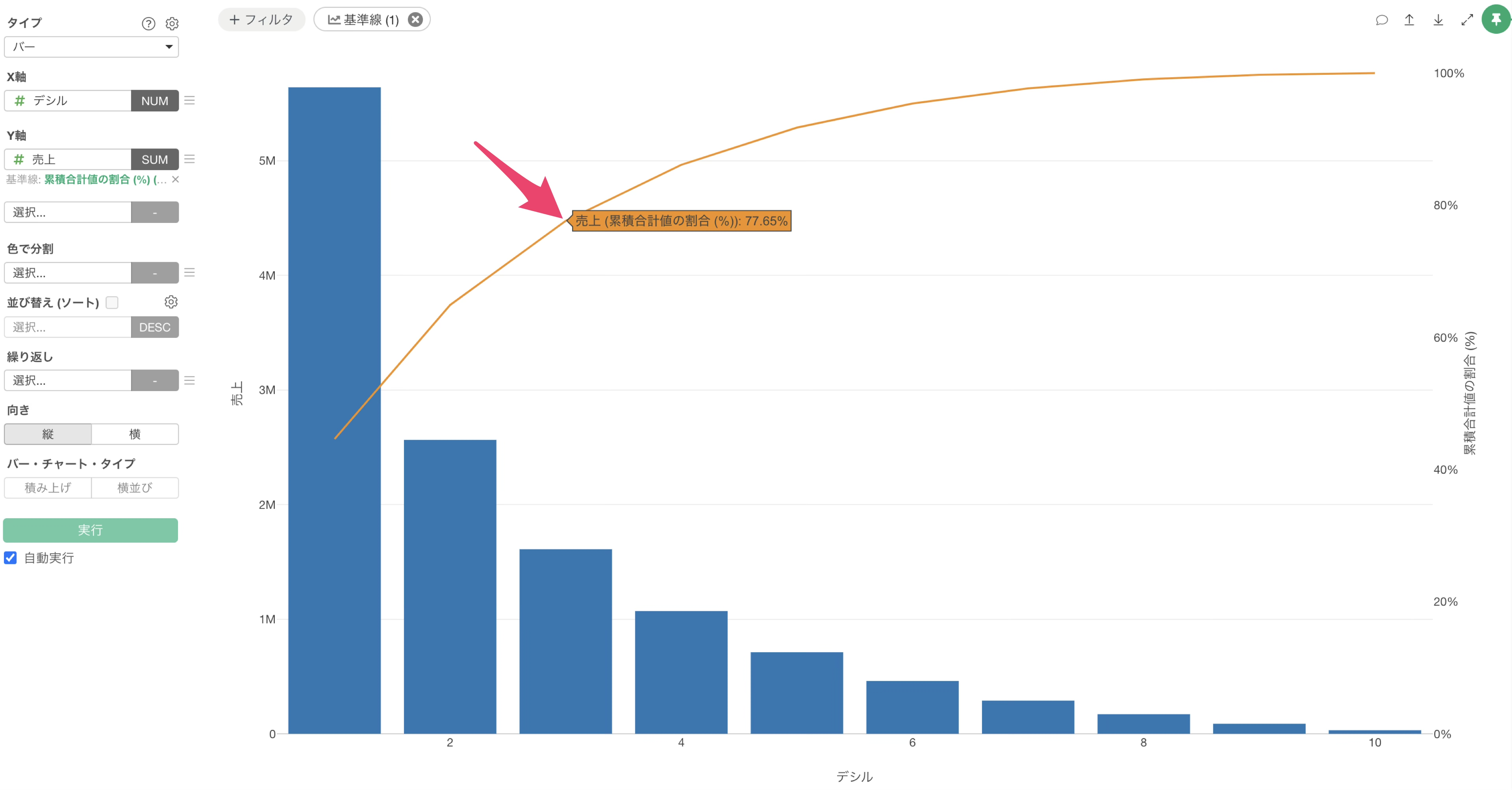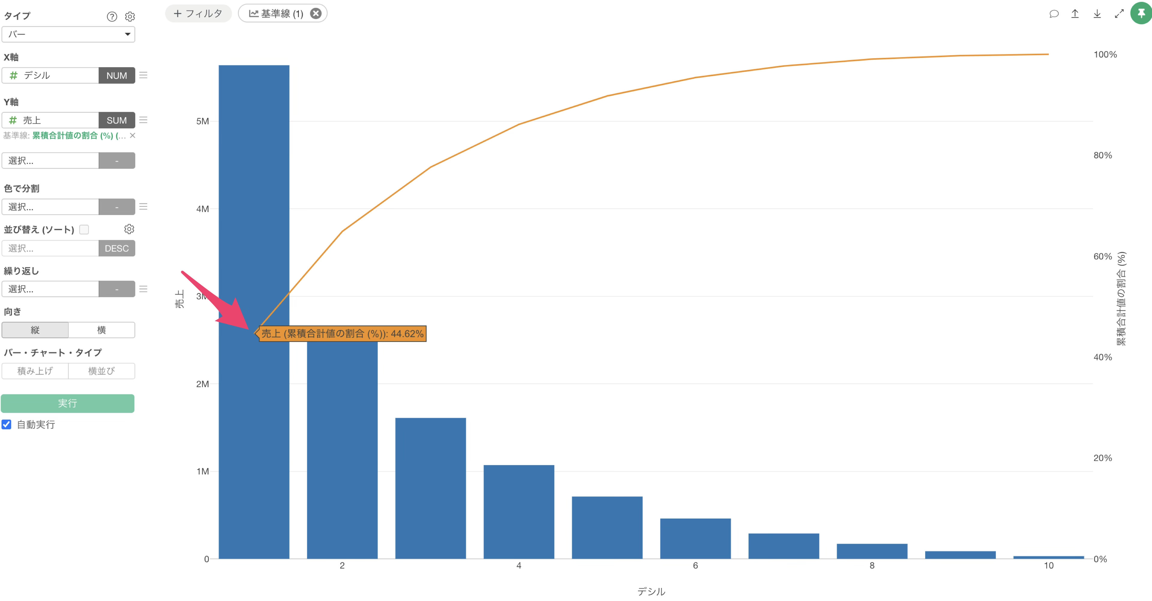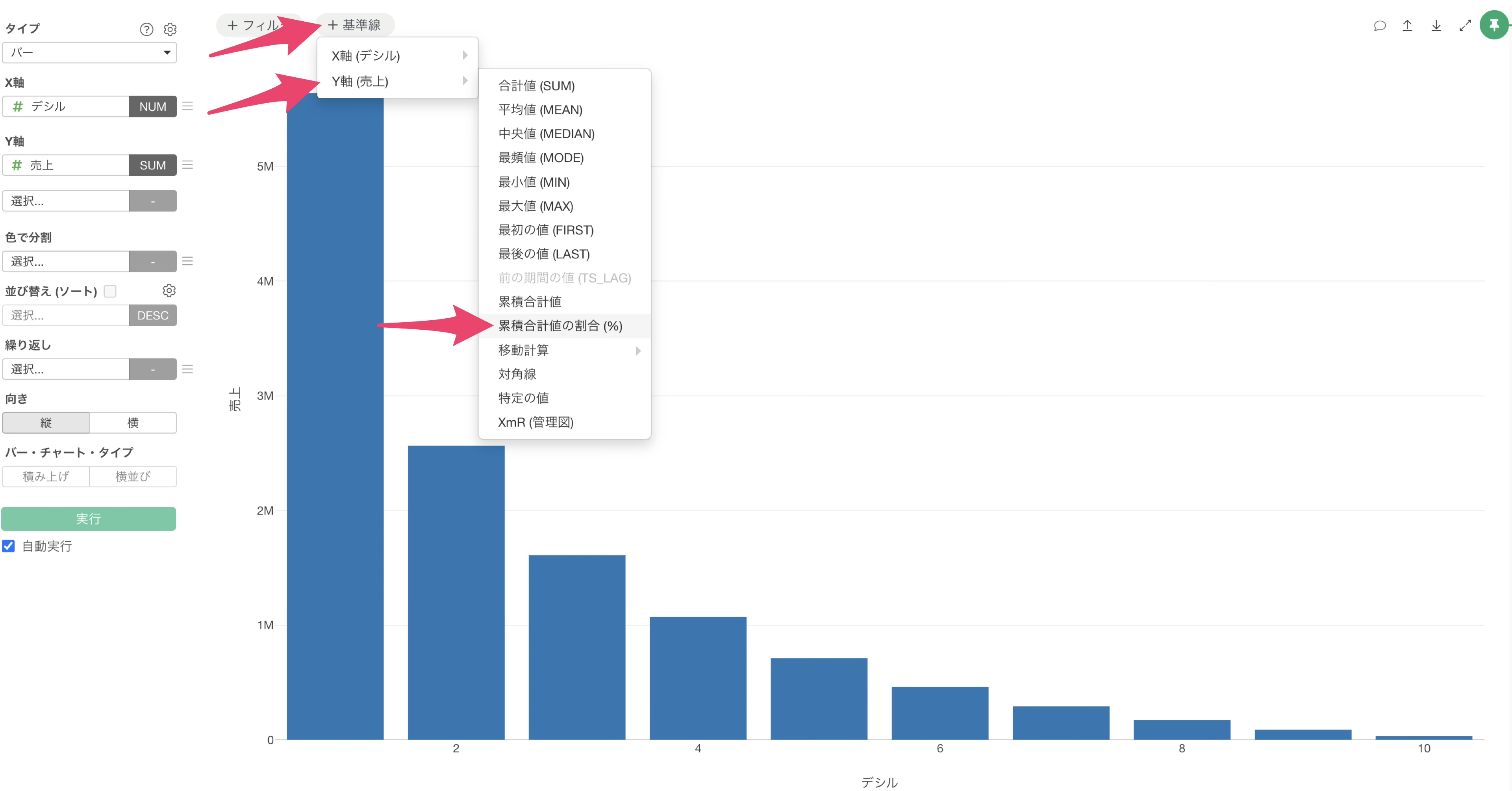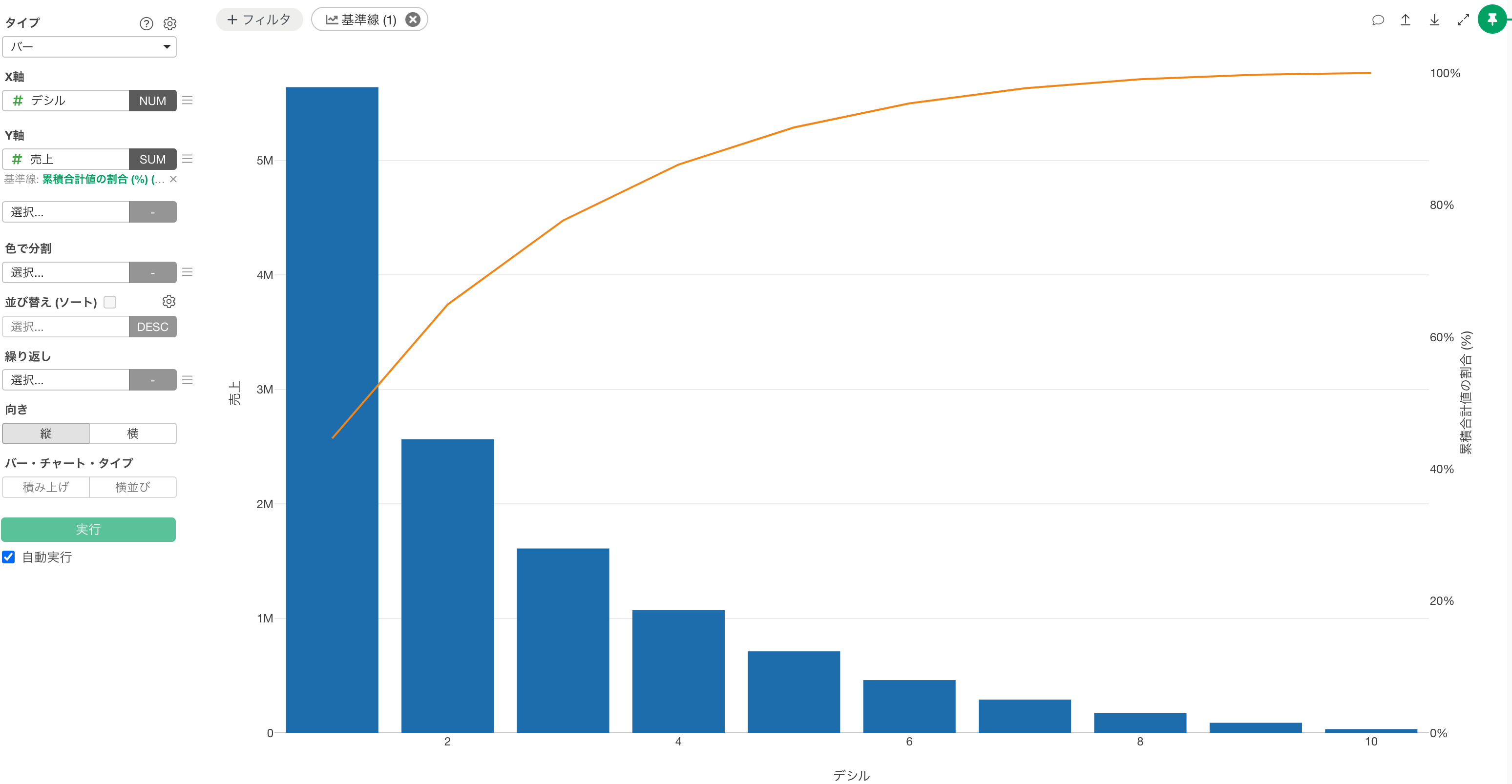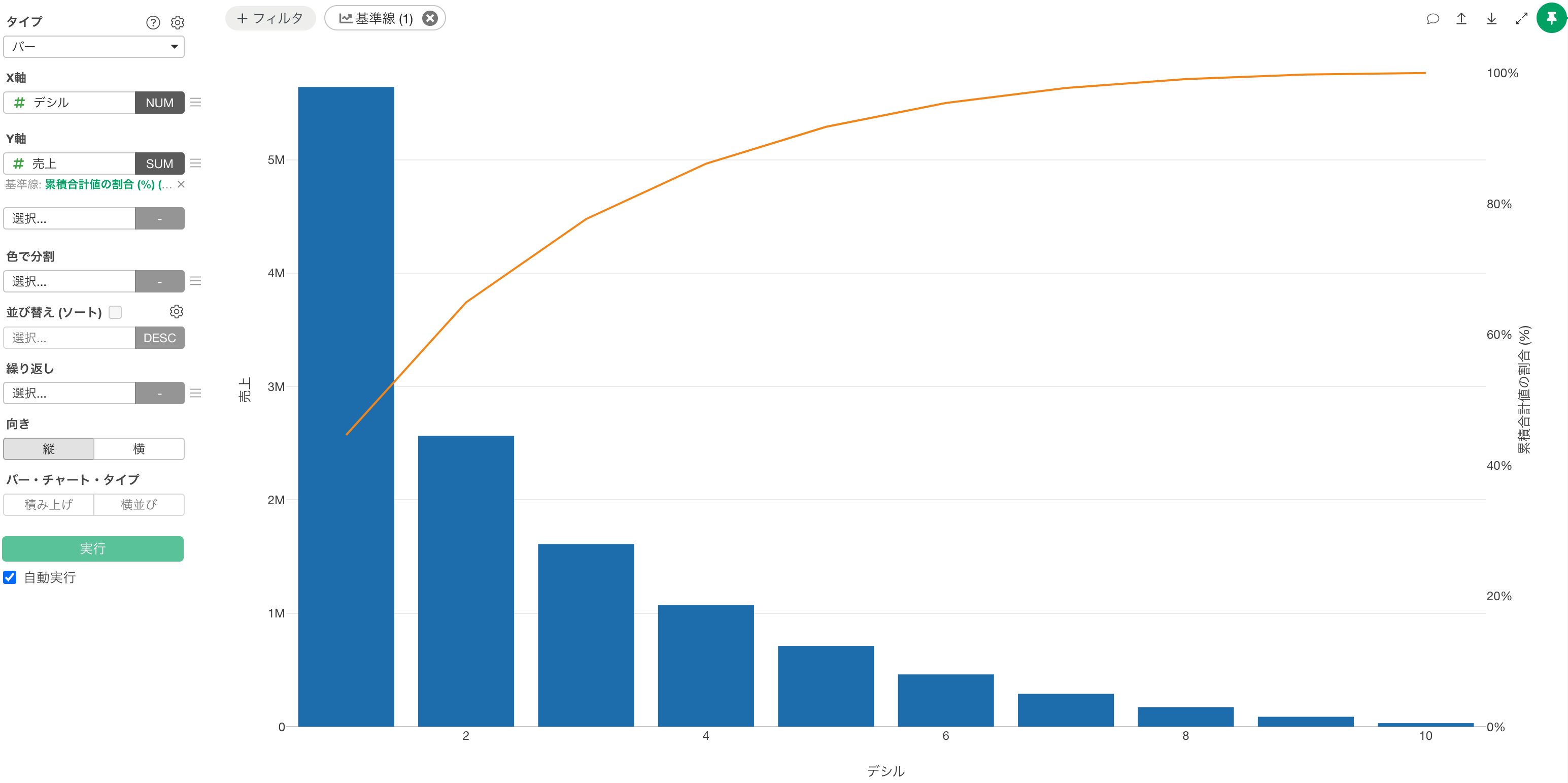 タイプに「バー」、X軸に「デシル」、Y軸に「売上」を選択します。
