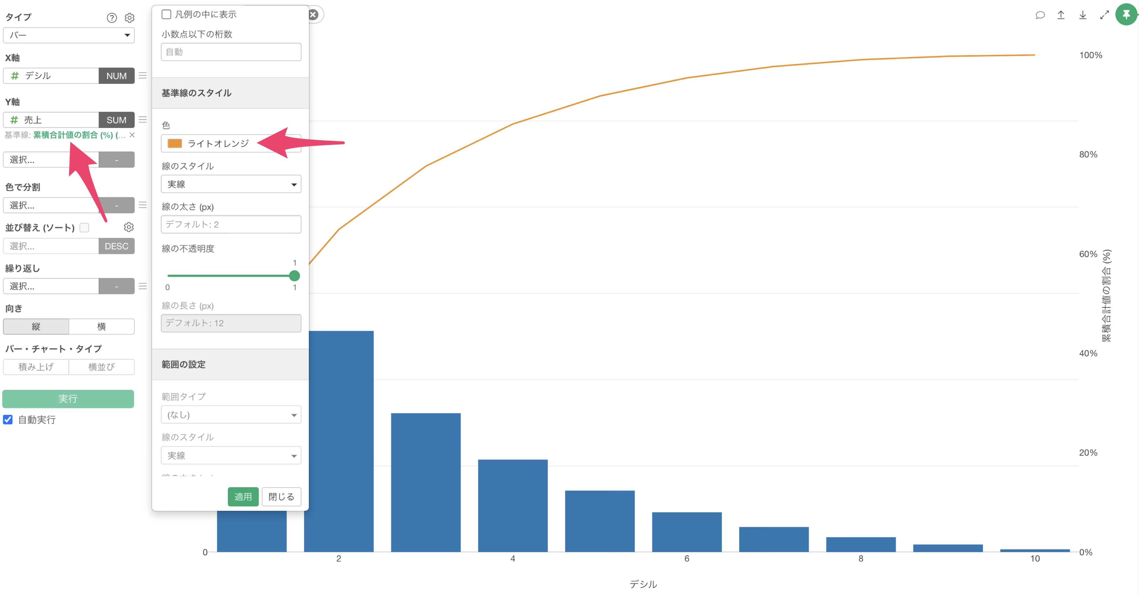 累積合計の割合のラインの色を変更したい場合、基準線の緑色のテキストをクリックし、リファレンスラインの設定ダイアログが表示されたら、基準線のスタイルから色を変更し、適用します。