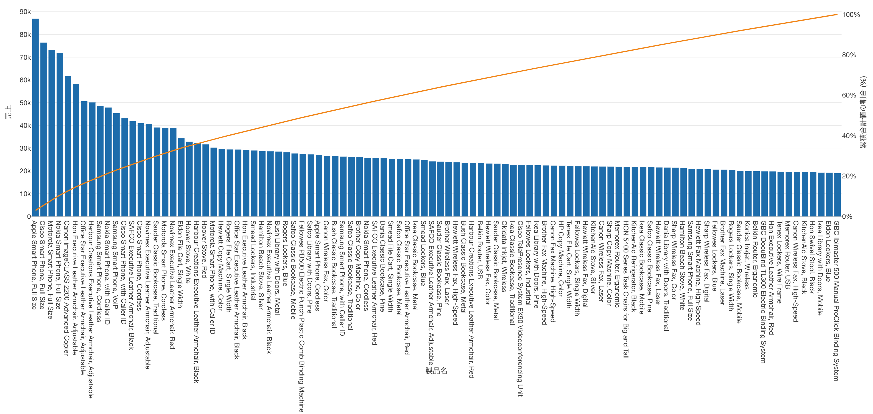 パレート分析やABC分析は、製品や顧客を一つずつ横に並べてグラフを作ります。そのため、対象が数千、数万と増えると、グラフの横軸が埋まってしまい、全体の傾向を読み取ることが難しくなります。