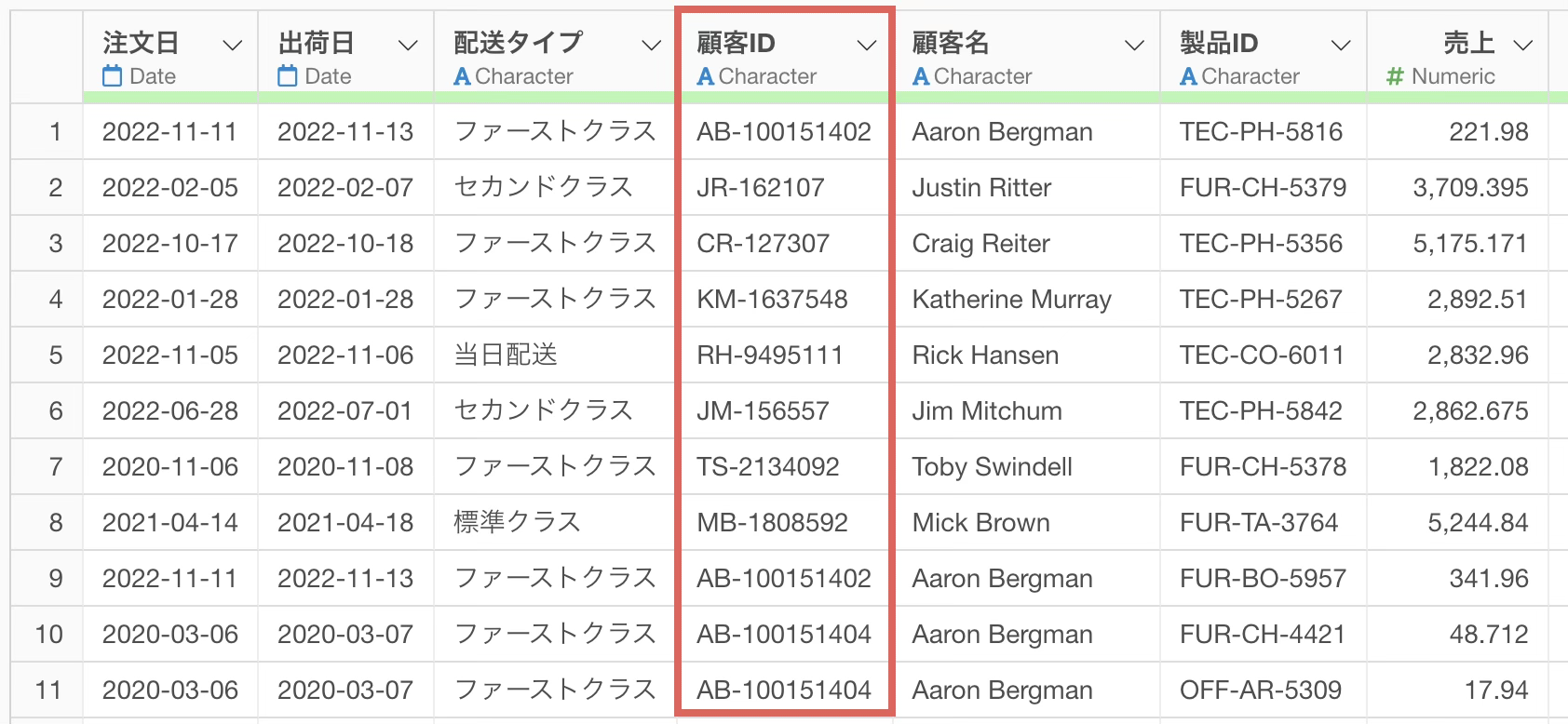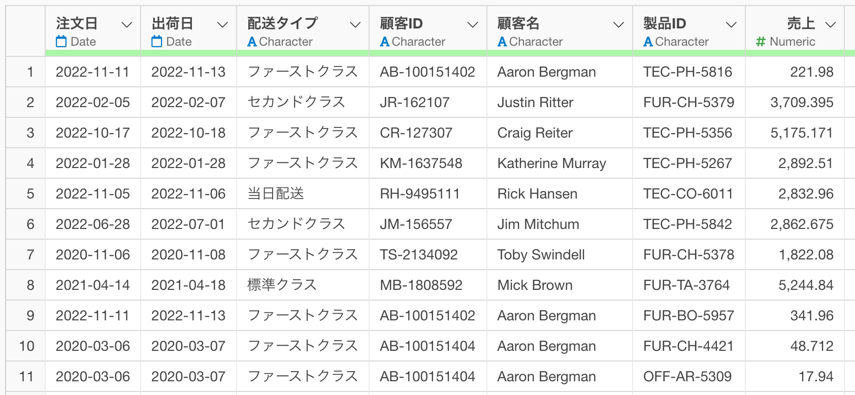 データには、顧客ID、注文日、製品カテゴリー、製品名、売上などの情報が含まれています。