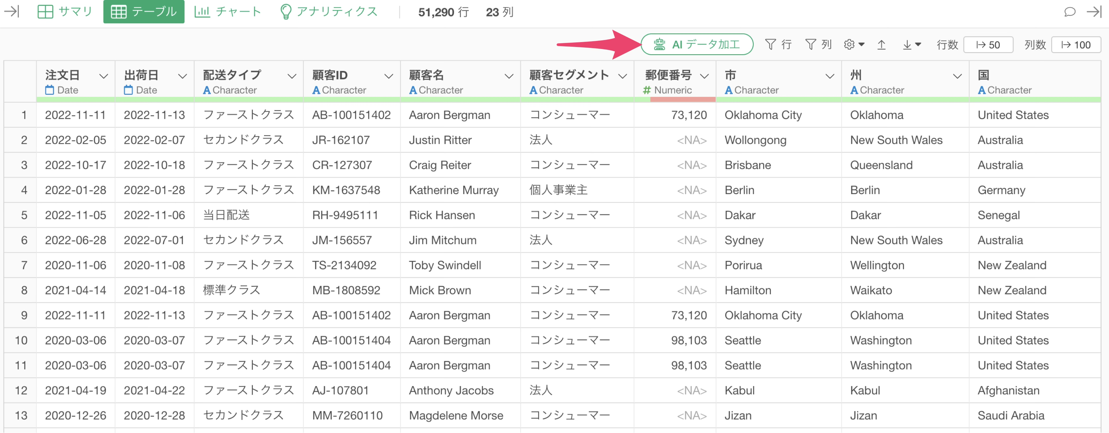 「AI データ加工」のボタンをクリックします。