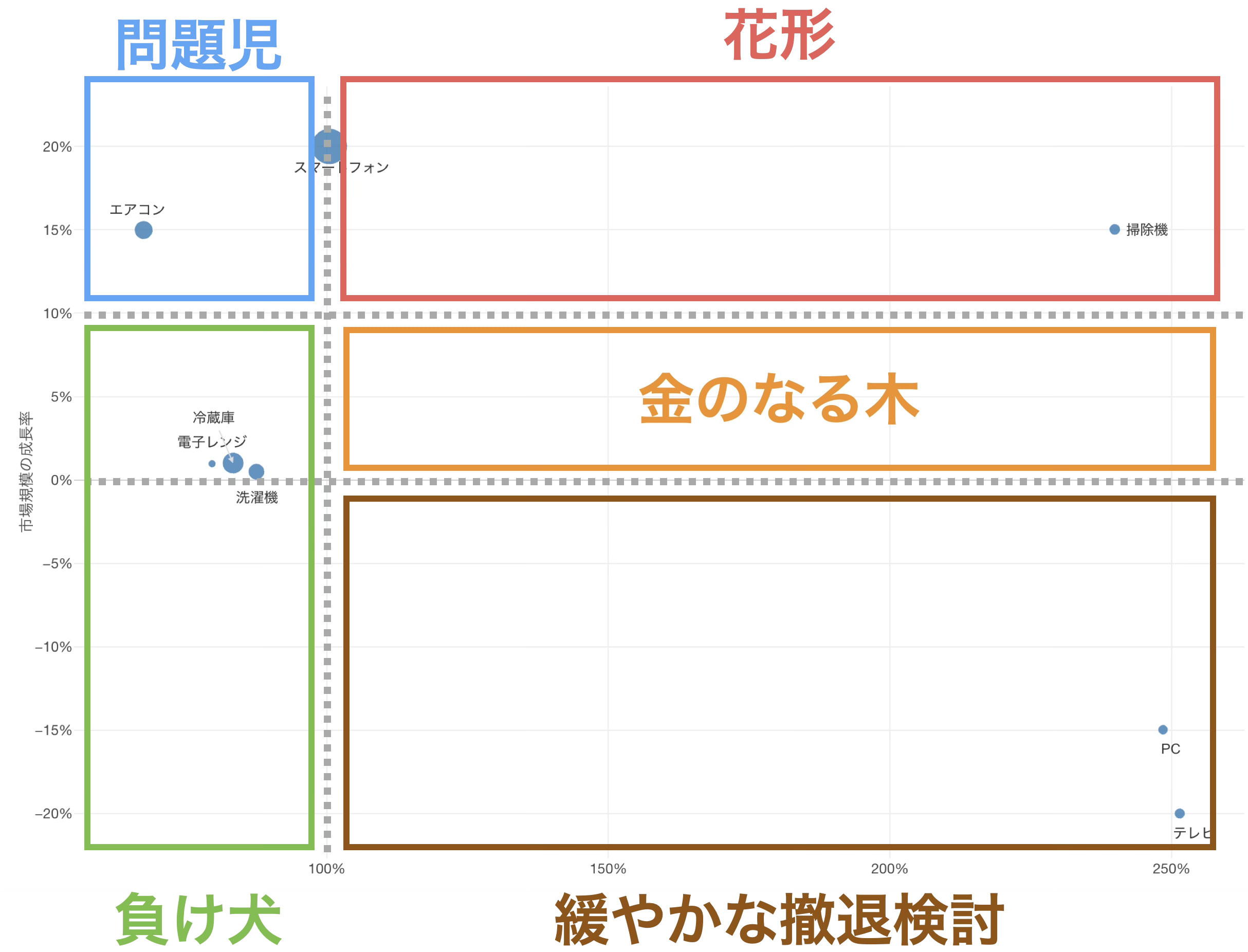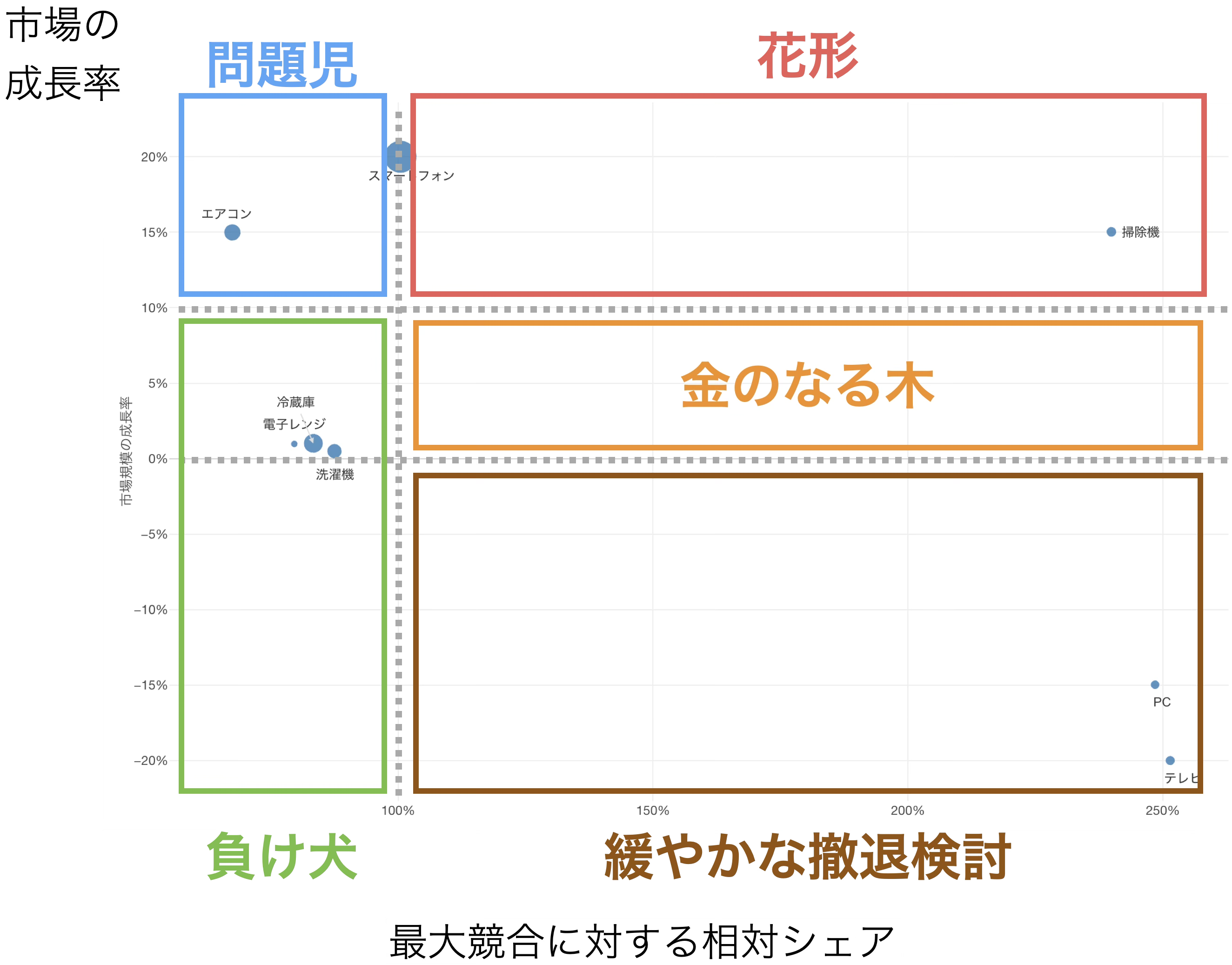 負け犬(相対シェア100%未満かつ成長率10%以下):** **市場成長性が低く、シェアも低い事業です。撤退や縮小、または売却を検討すべき候補となります。特に市場が縮小している場合(成長率0%未満)は、早急な意思決定が必要です。