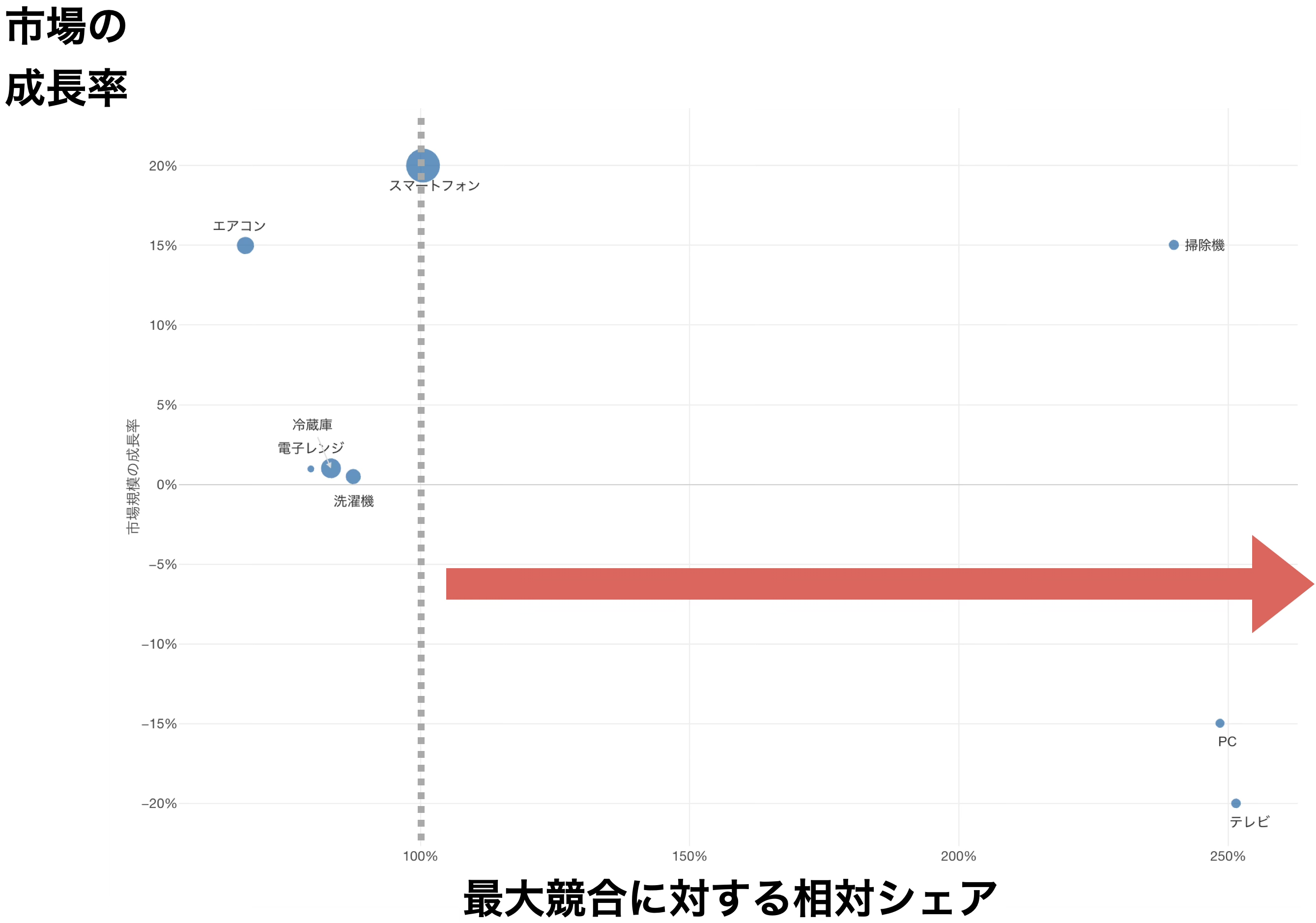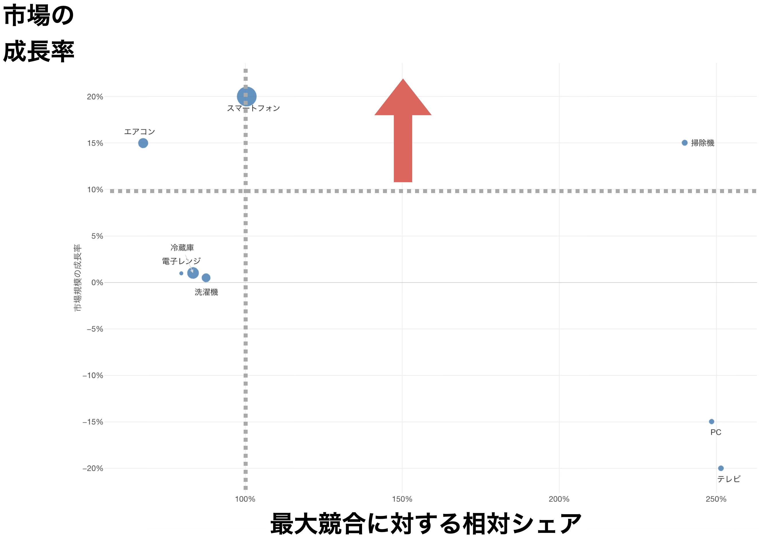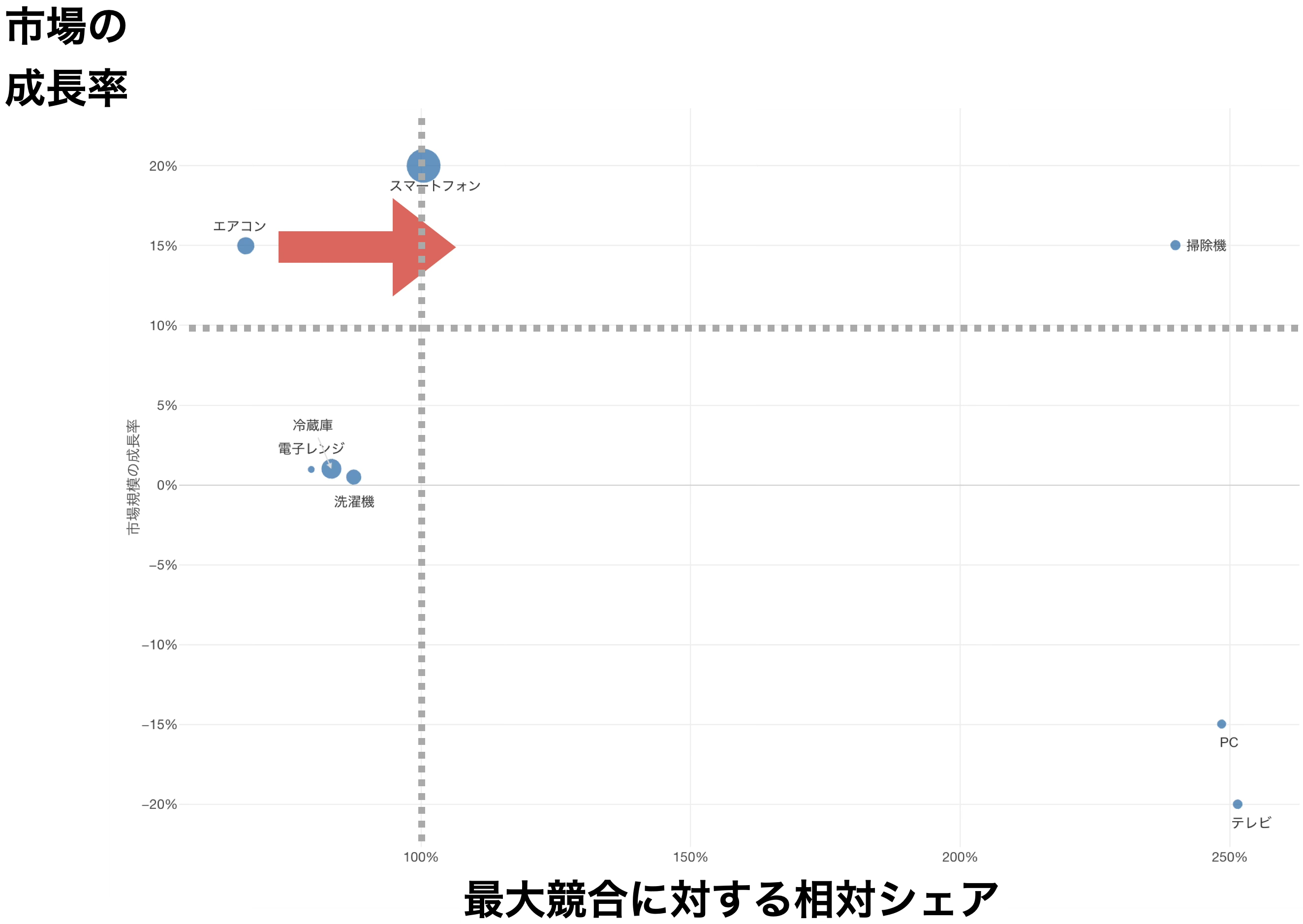 積極投資圏(投資基準より上、例えば10%以上)は、市場が急激に伸びている領域です。
