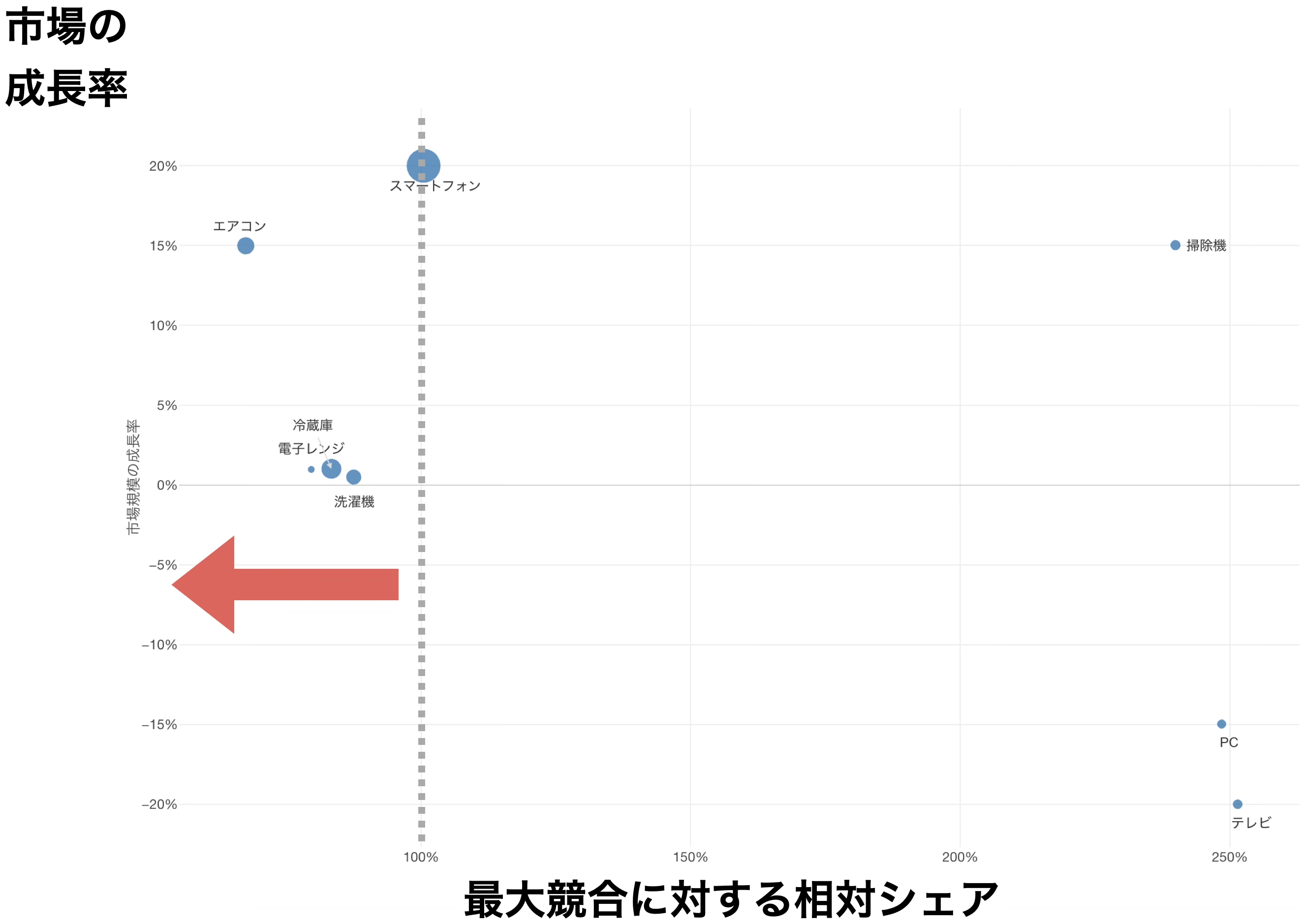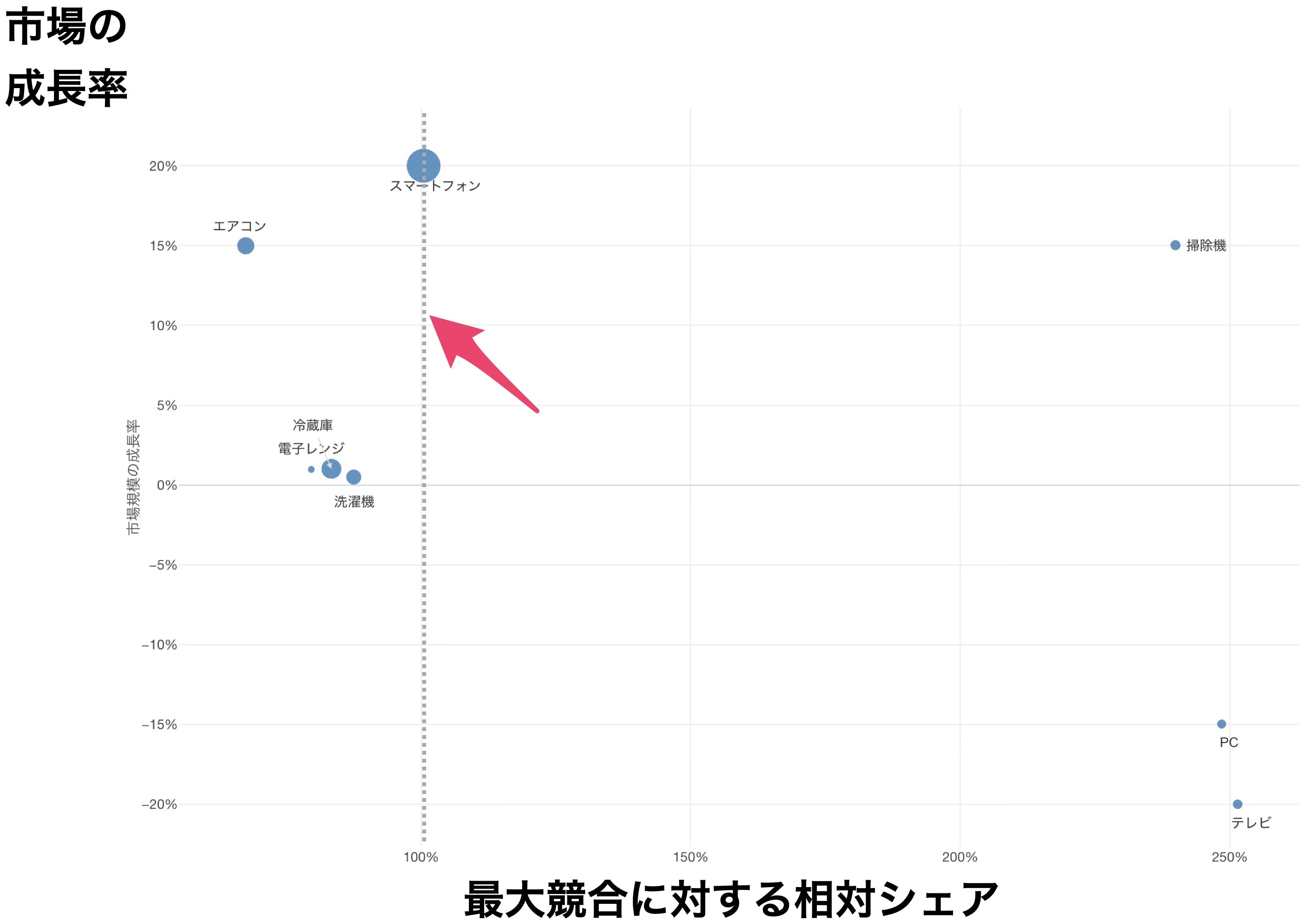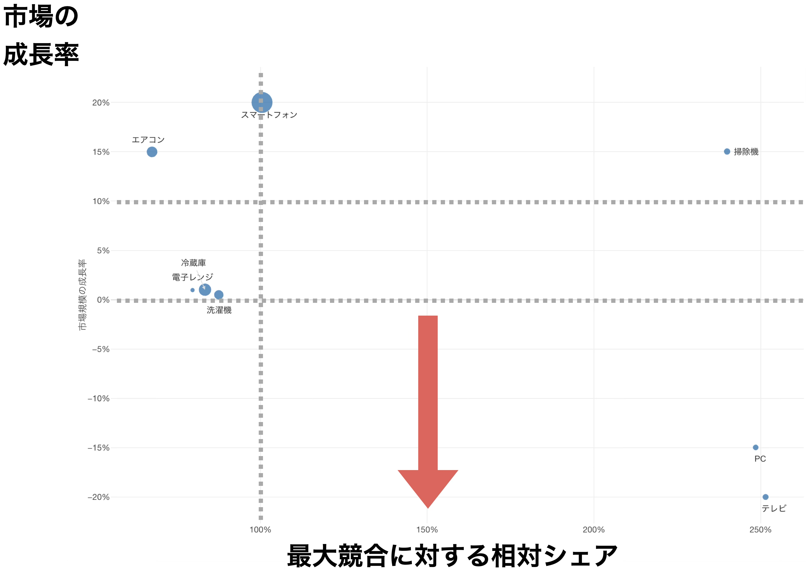 積極投資圏(投資基準より上、例えば10%以上)は、市場が急激に伸びている領域です。