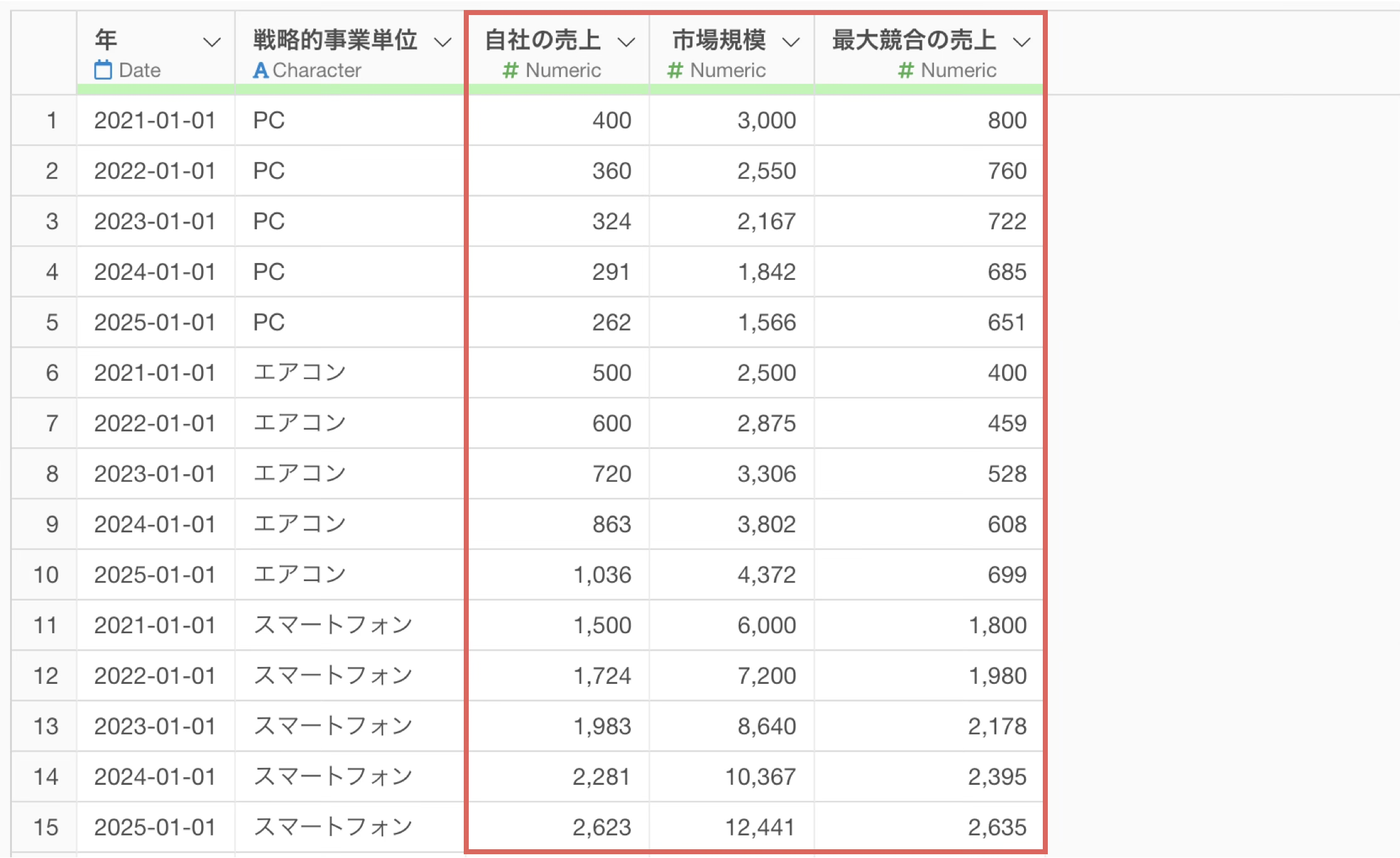 データには、年、製品カテゴリー、市場規模、自社の売上、最大競合の売上などの情報が含まれています。