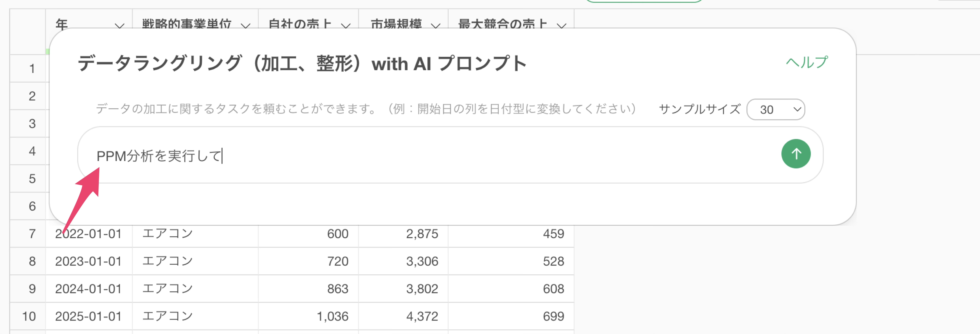 今回は、1行が1つの製品カテゴリーの年次データを表すデータを使って、AIプロンプトで製品カテゴリーごとのPPM分析を行います。(データはこちらからダウンロードいただけます)