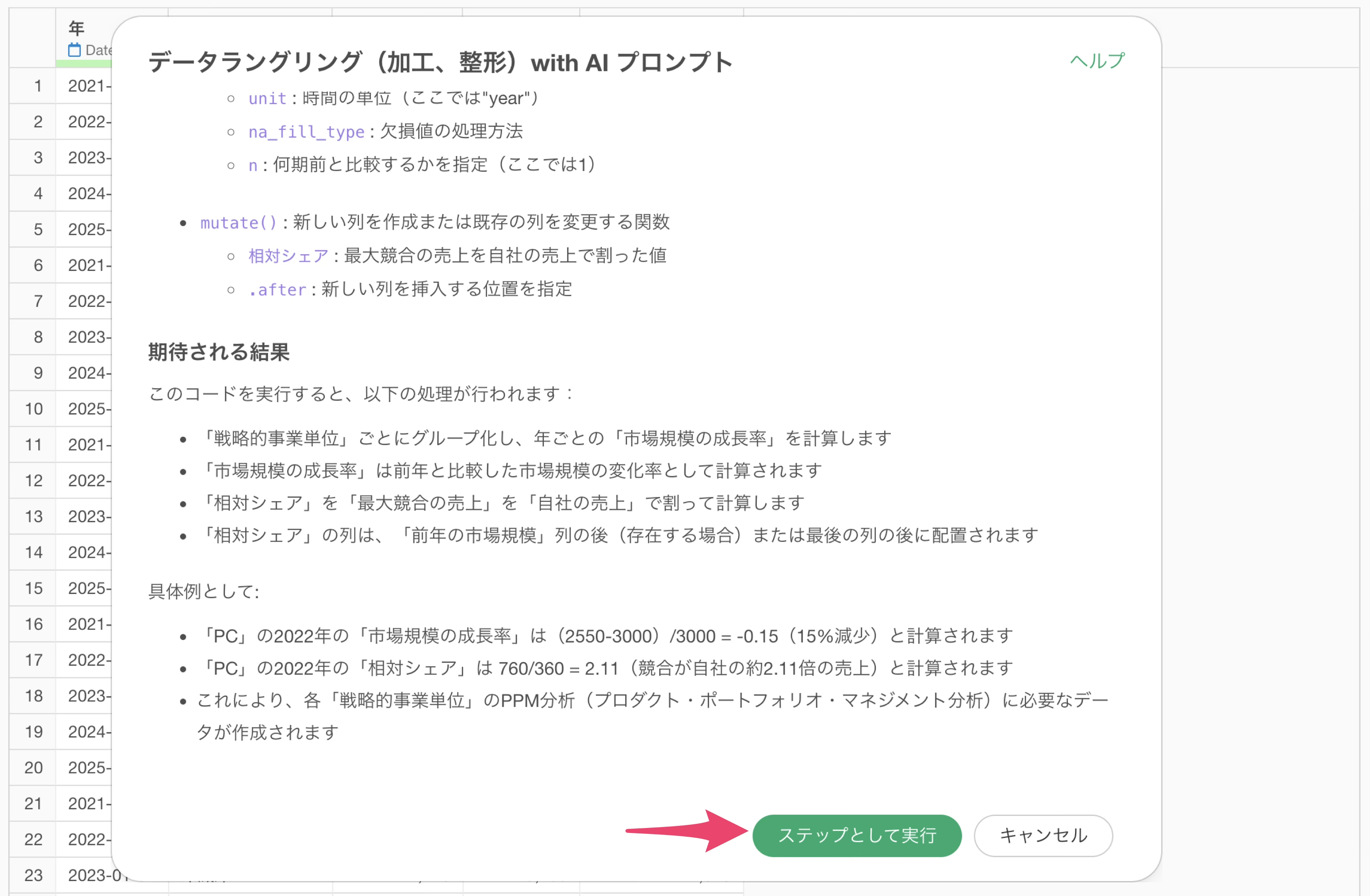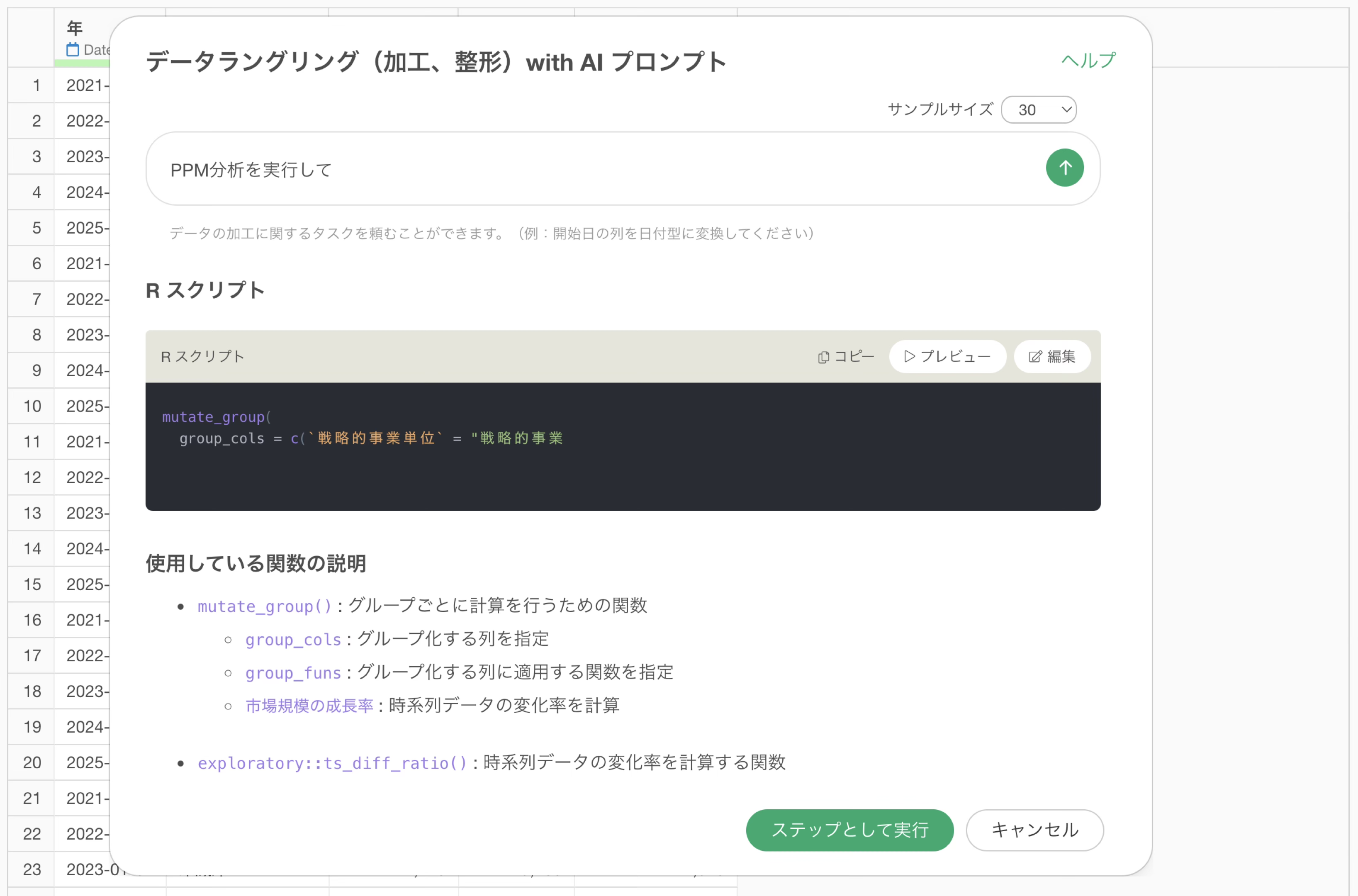 使用している関数の説明や期待される結果を確認し、「ステップとして実行」ボタンをクリックします。