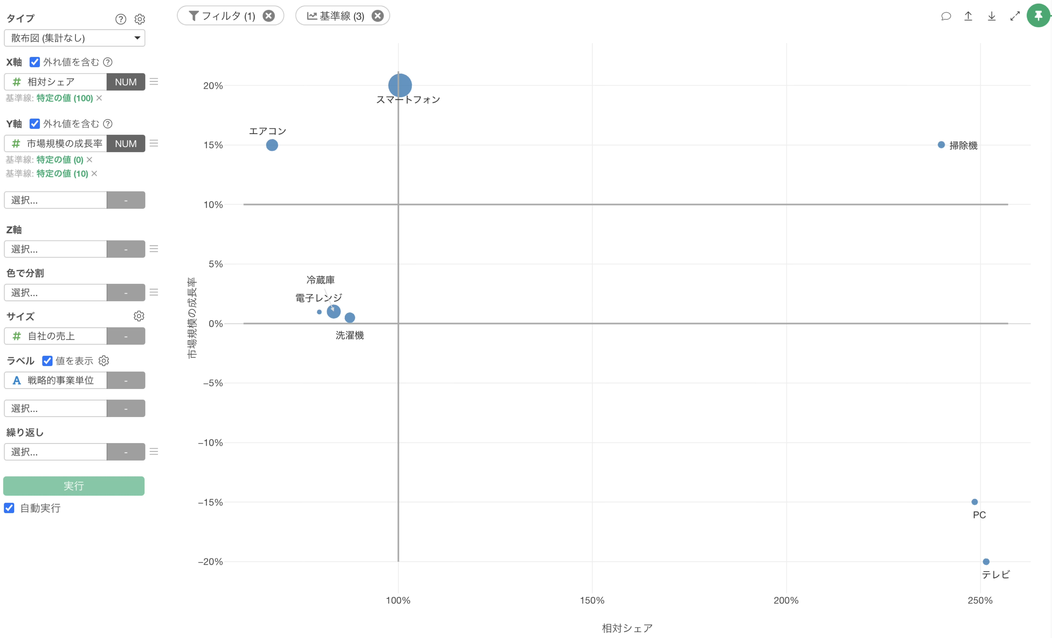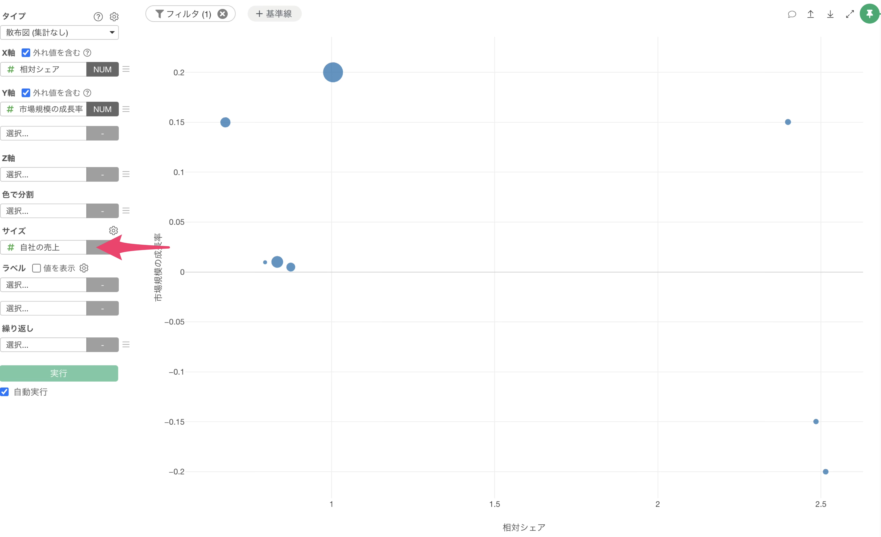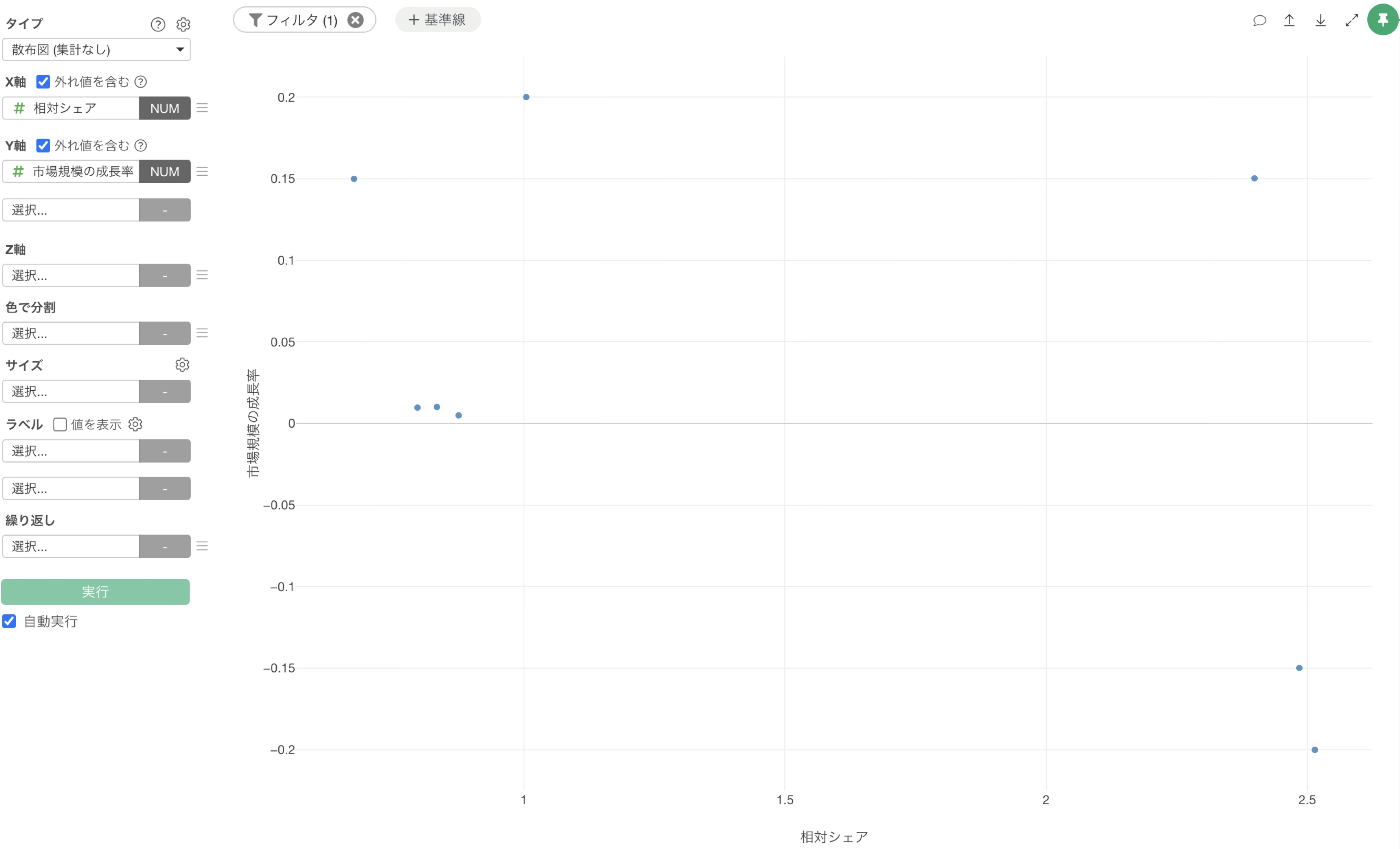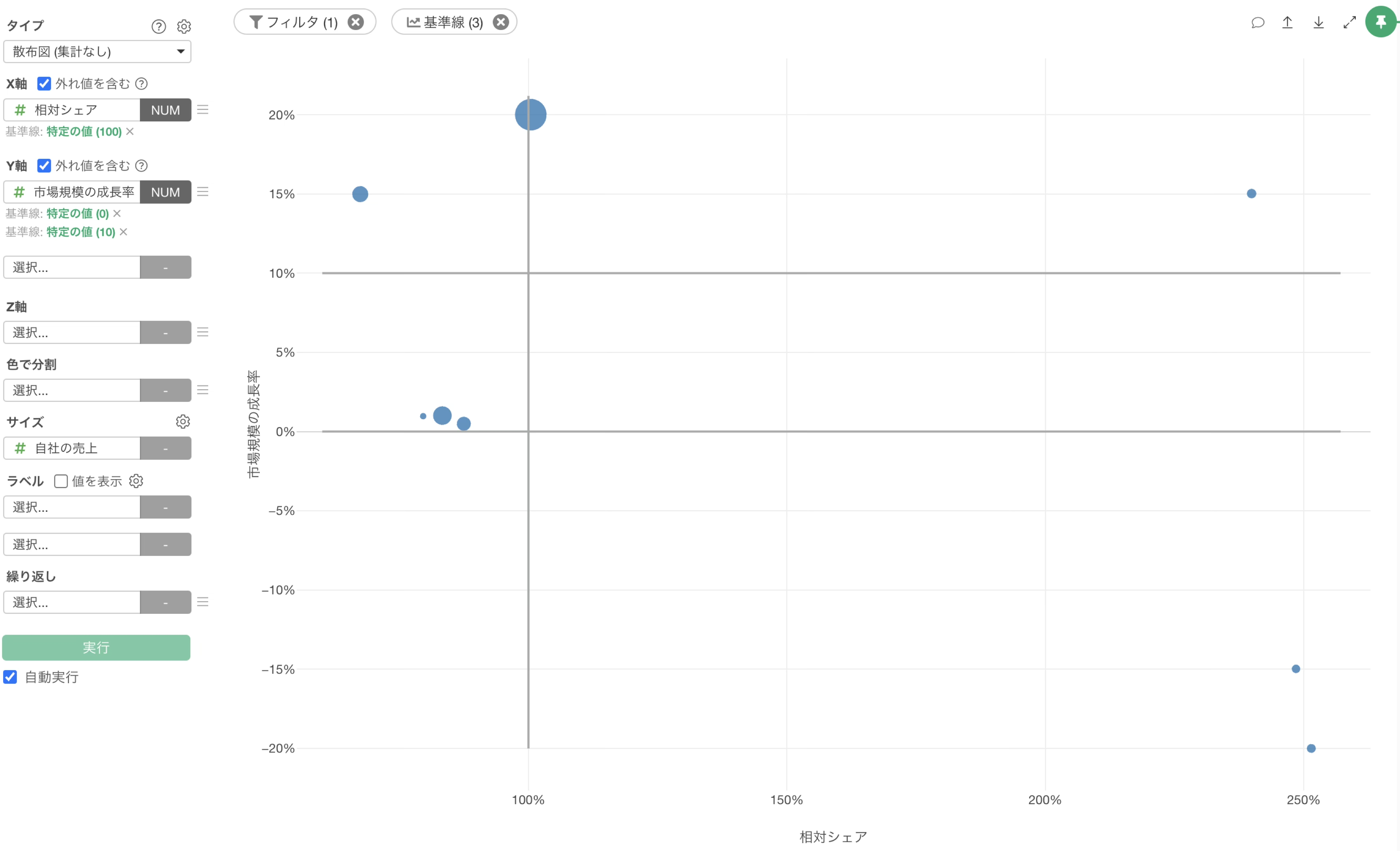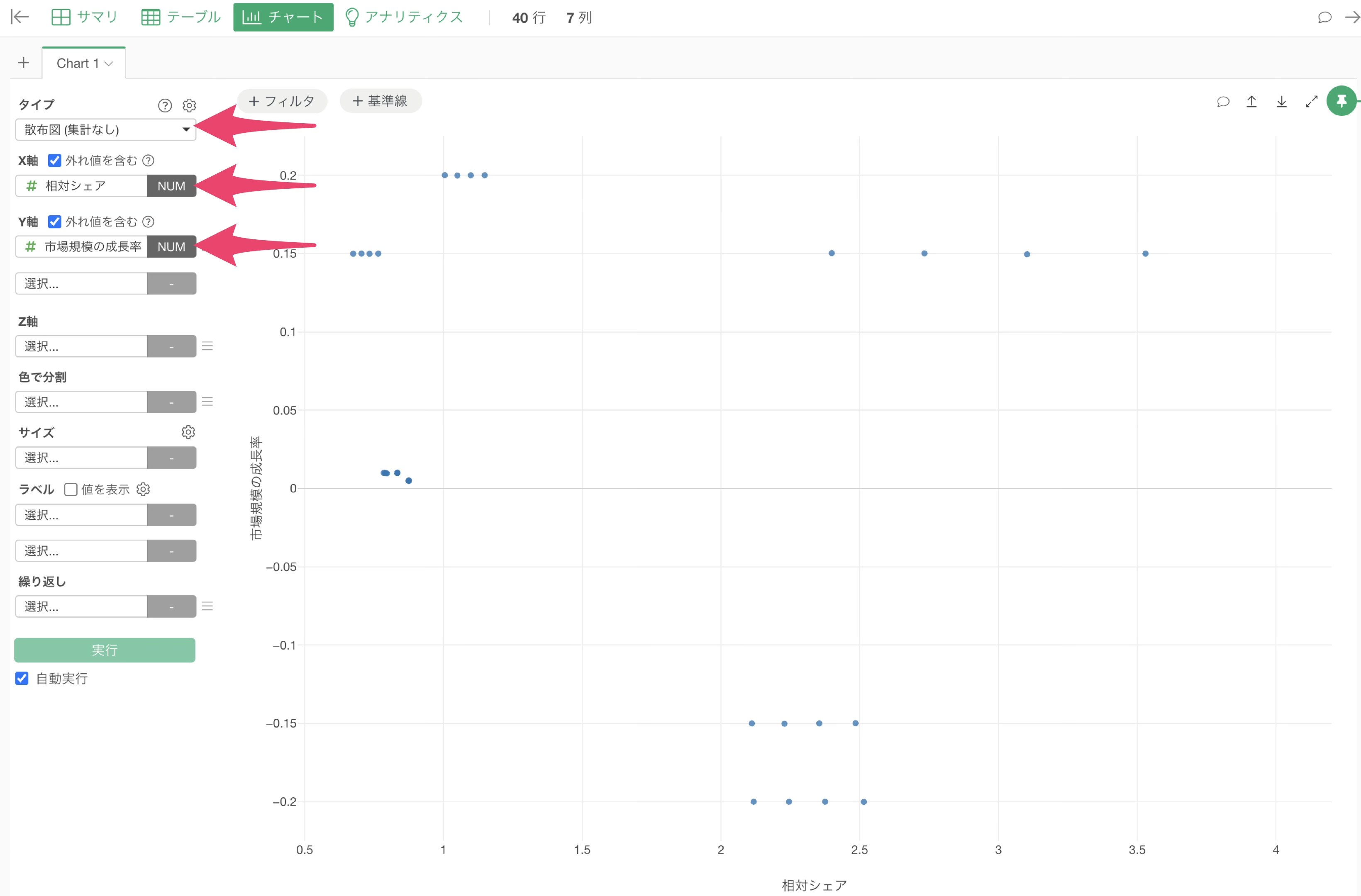 チャートビューに移動して、チャートのタイプに「散布図(集計なし)」を選択し、X軸には相対シェアを選択し、Y軸には市場規模の成長率を選択します。
