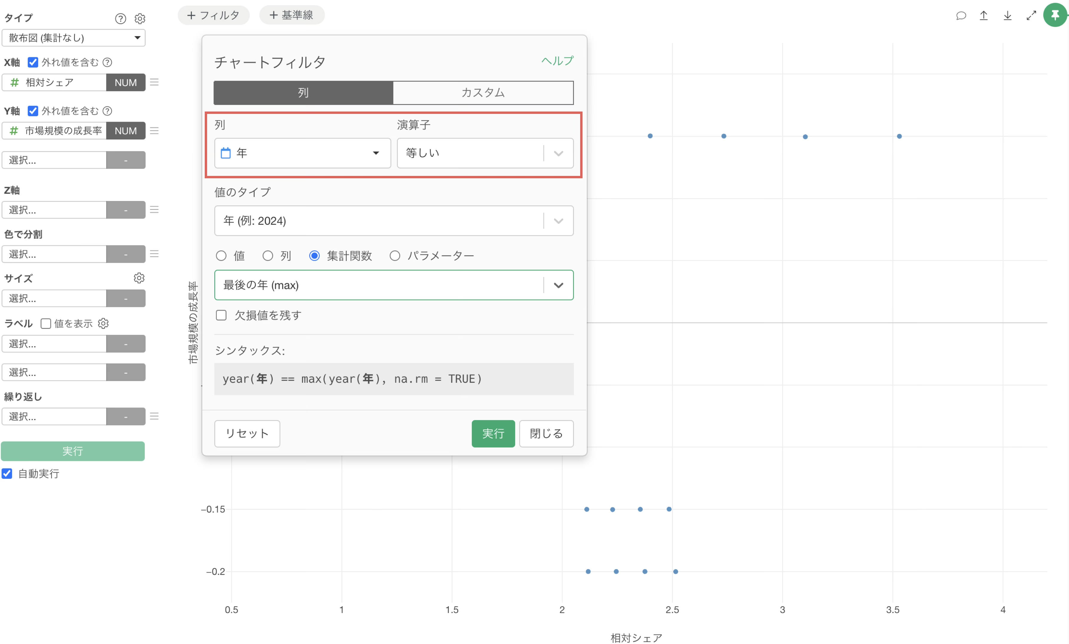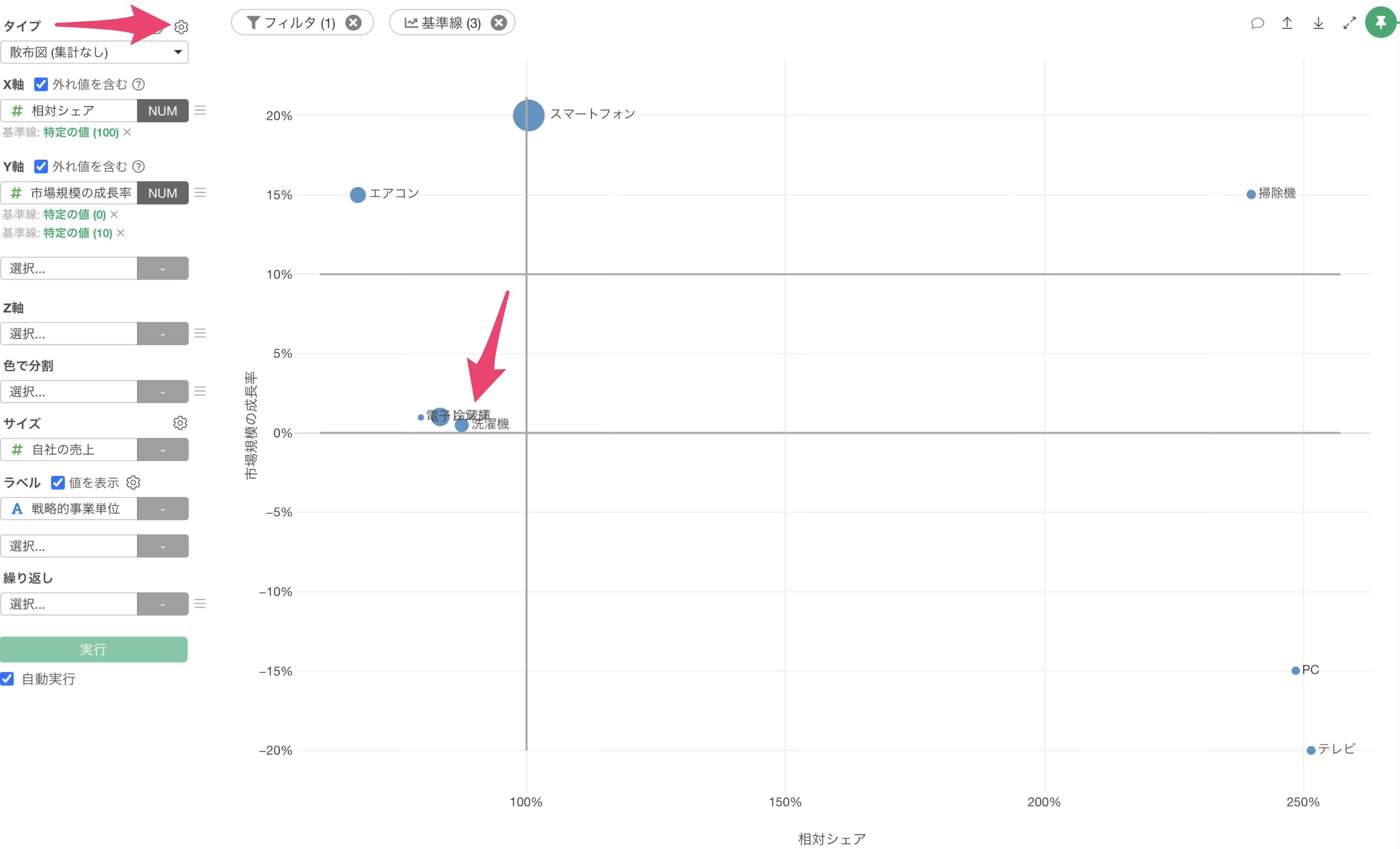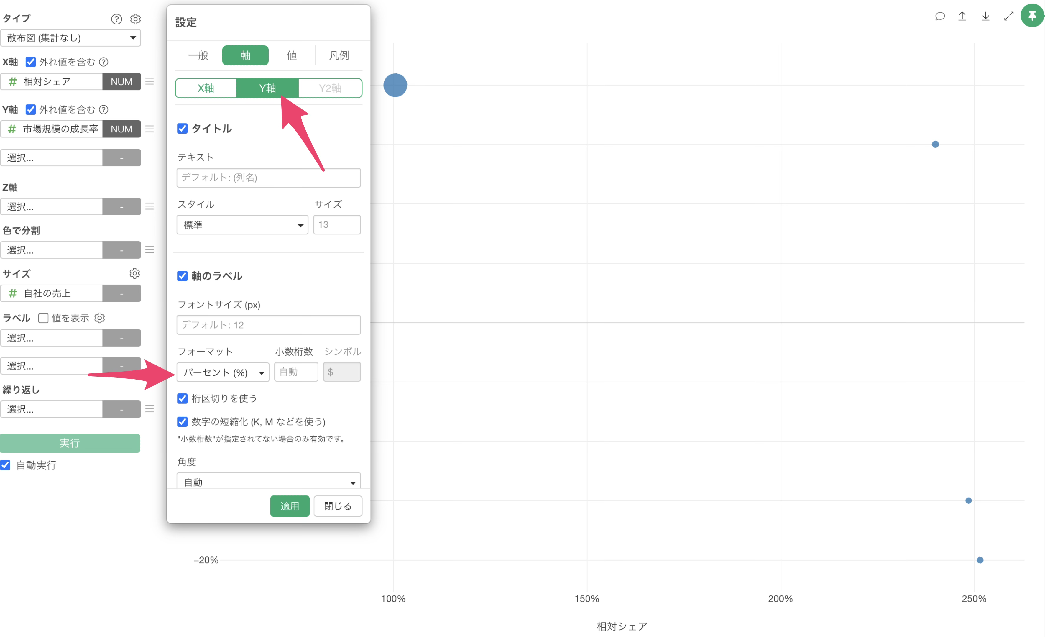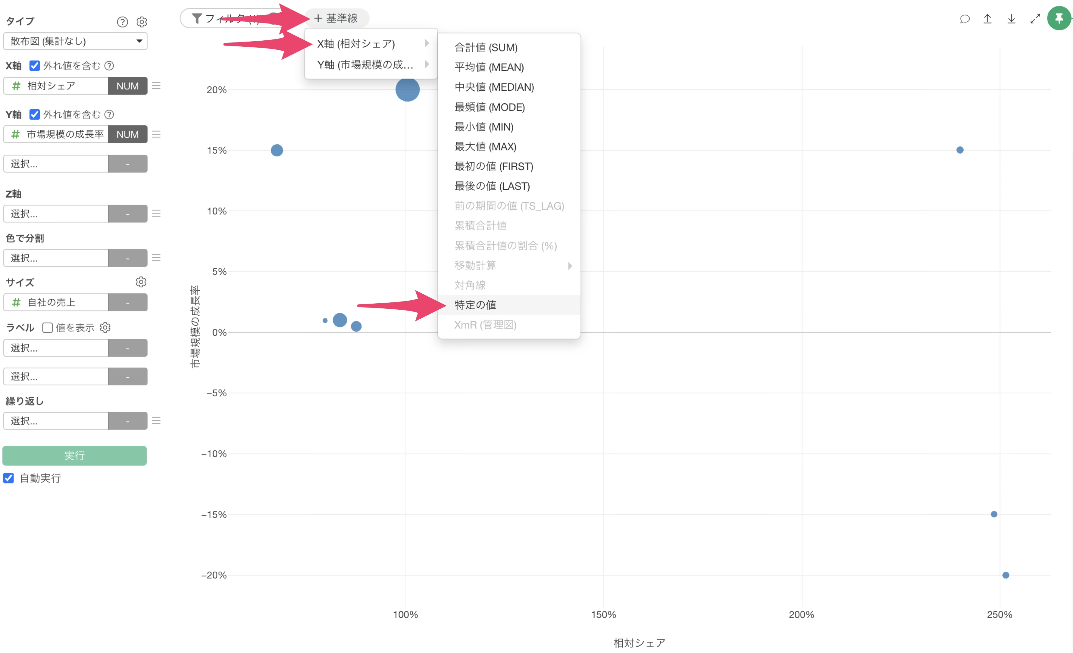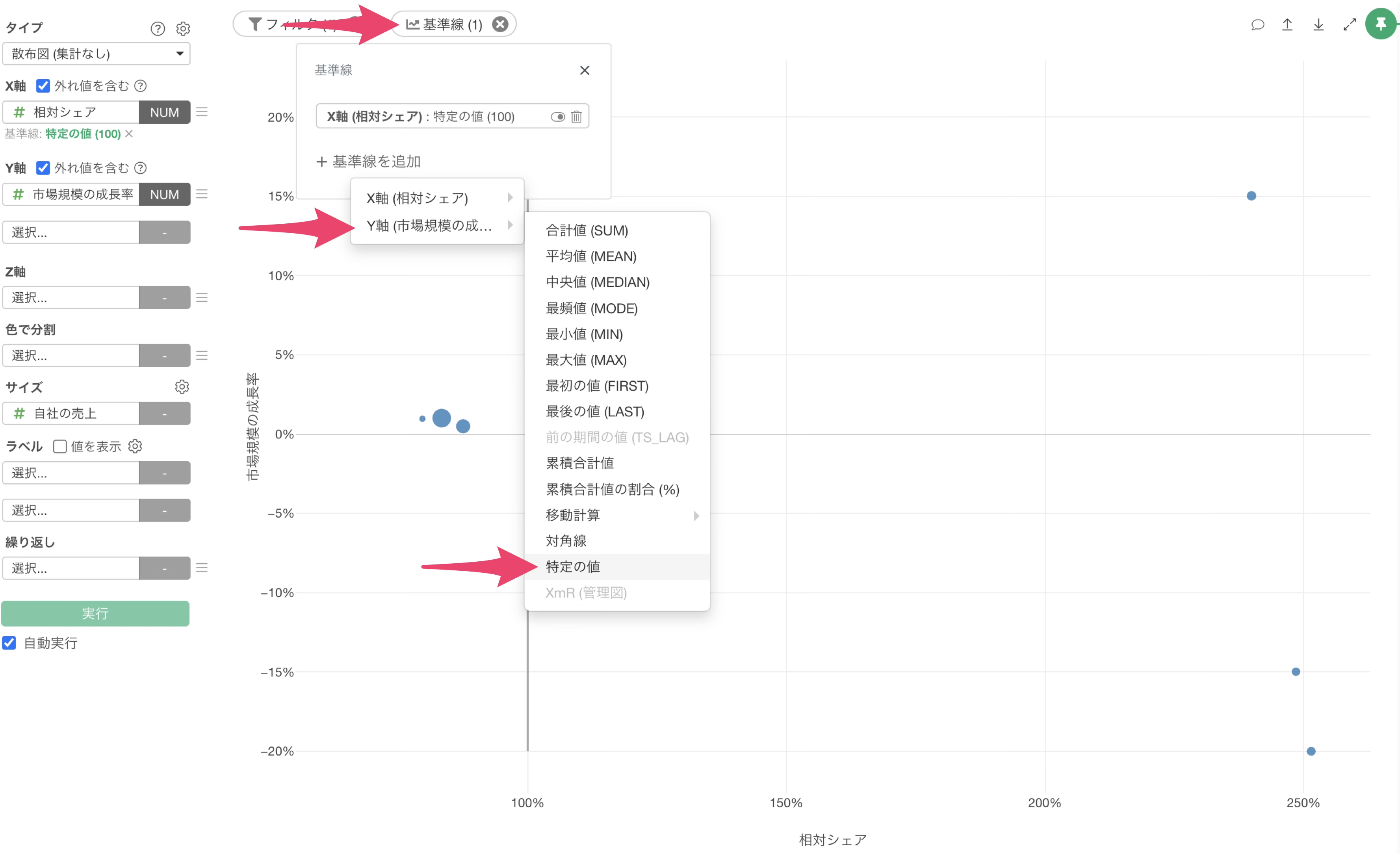 チャートビューに移動して、チャートのタイプに「散布図(集計なし)」を選択し、X軸には相対シェアを選択し、Y軸には市場規模の成長率を選択します。
