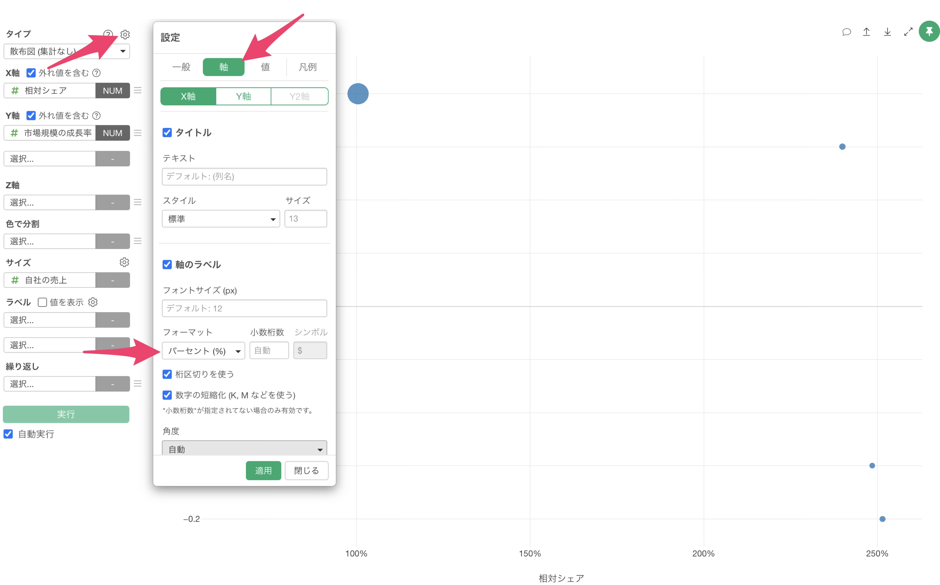 まず、X軸の単位をパーセント表記に変更するために、 チャートの設定アイコンを選択し、軸のメニューからフォーマットを「%」に変更して適用します。