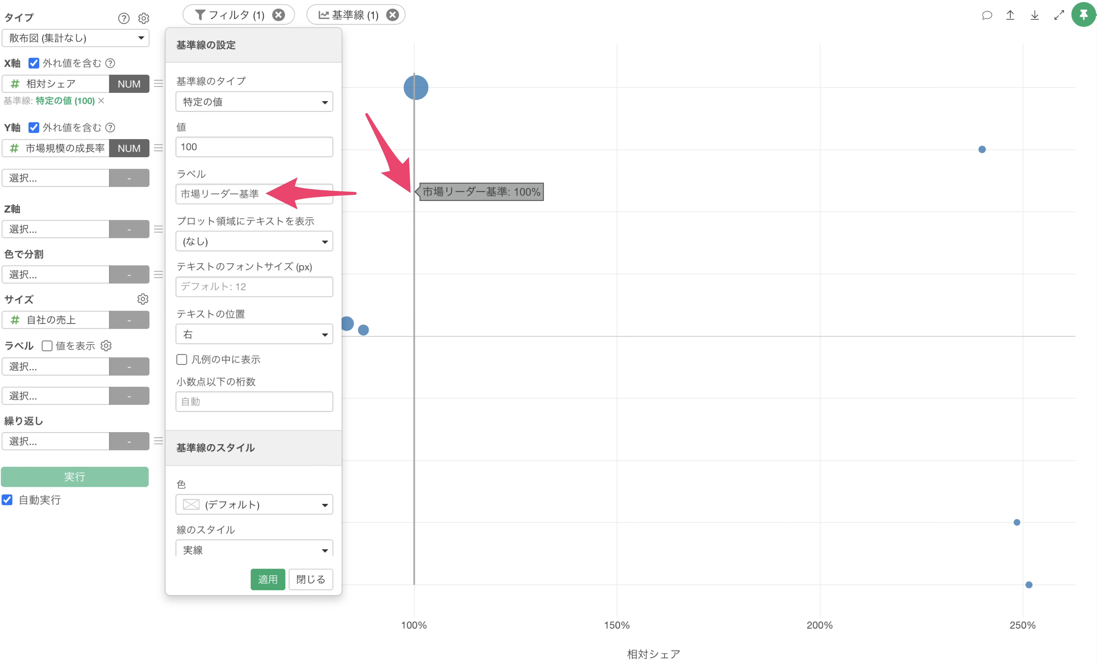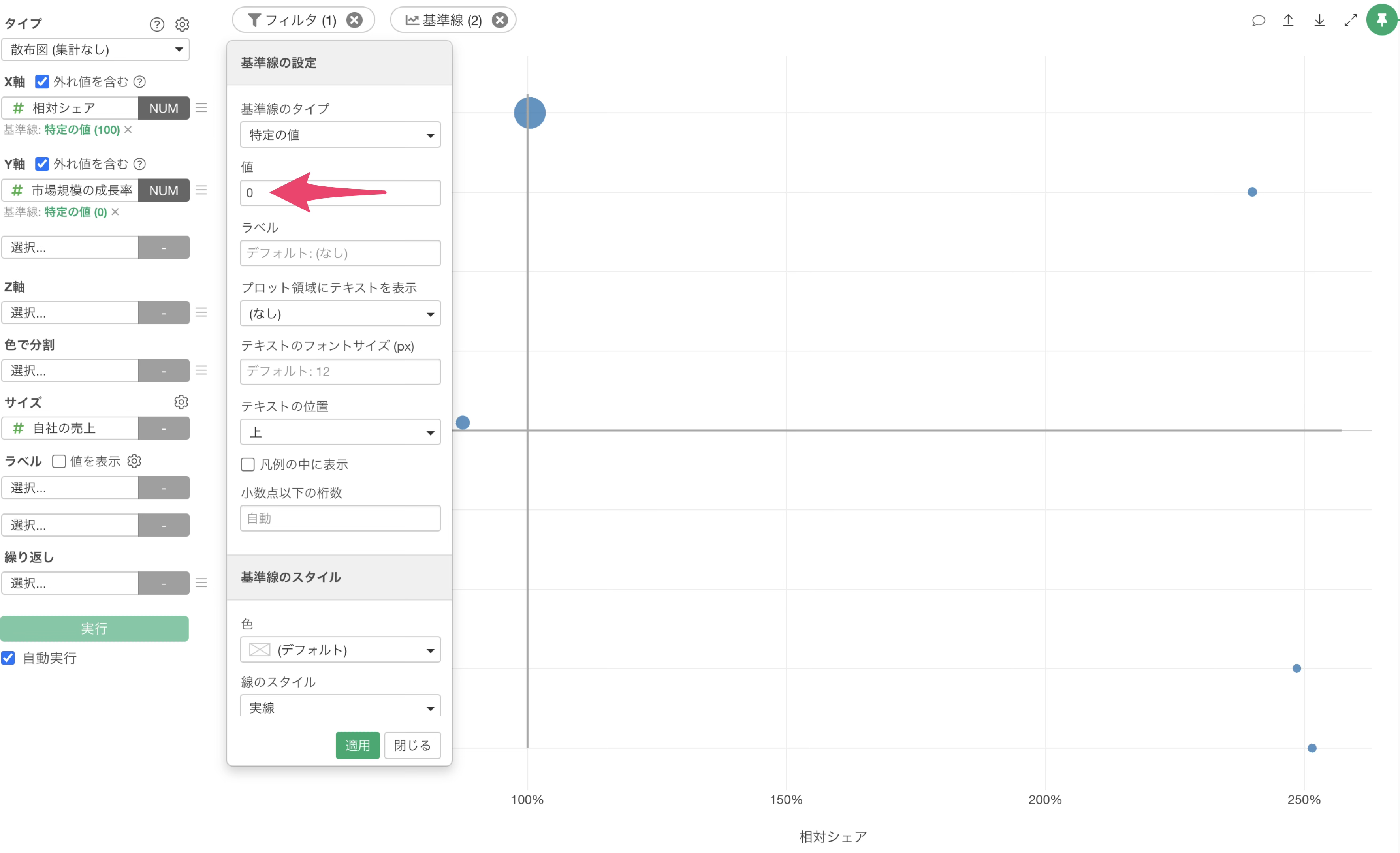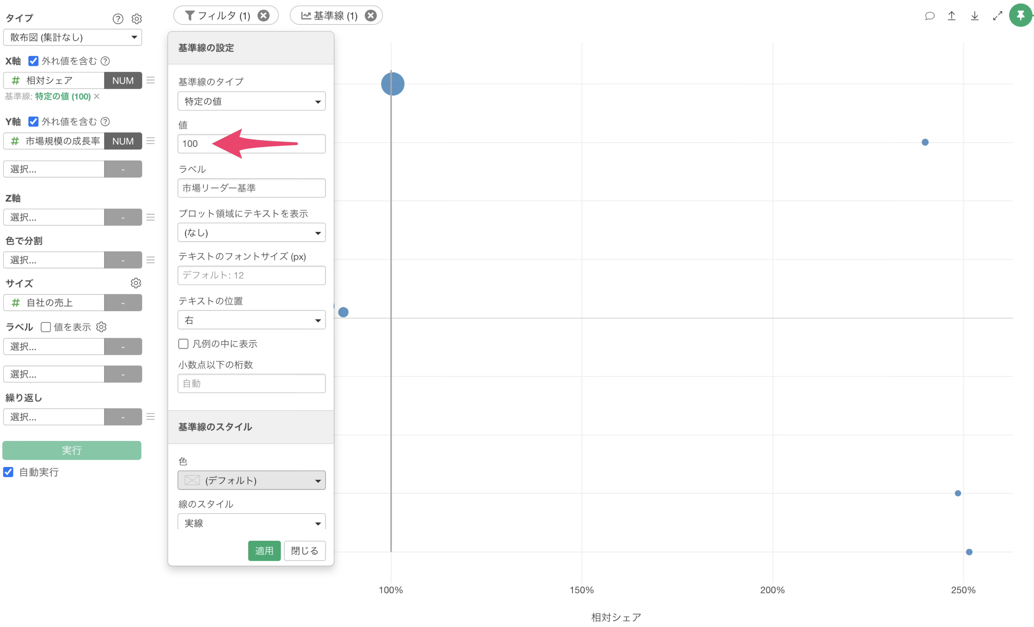 X軸の相対市場シェアのしきい値には100%に設定します。