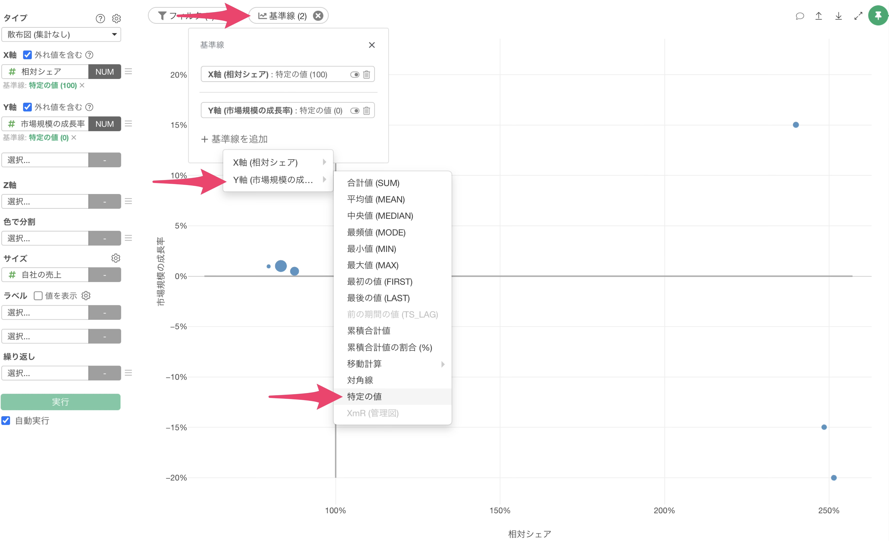 次に、Y軸の市場成長率0%の境界線を追加します。チャート上部にある基準線のボタンを再度クリックして、Y軸のメニューから「特定の値」を選択します。