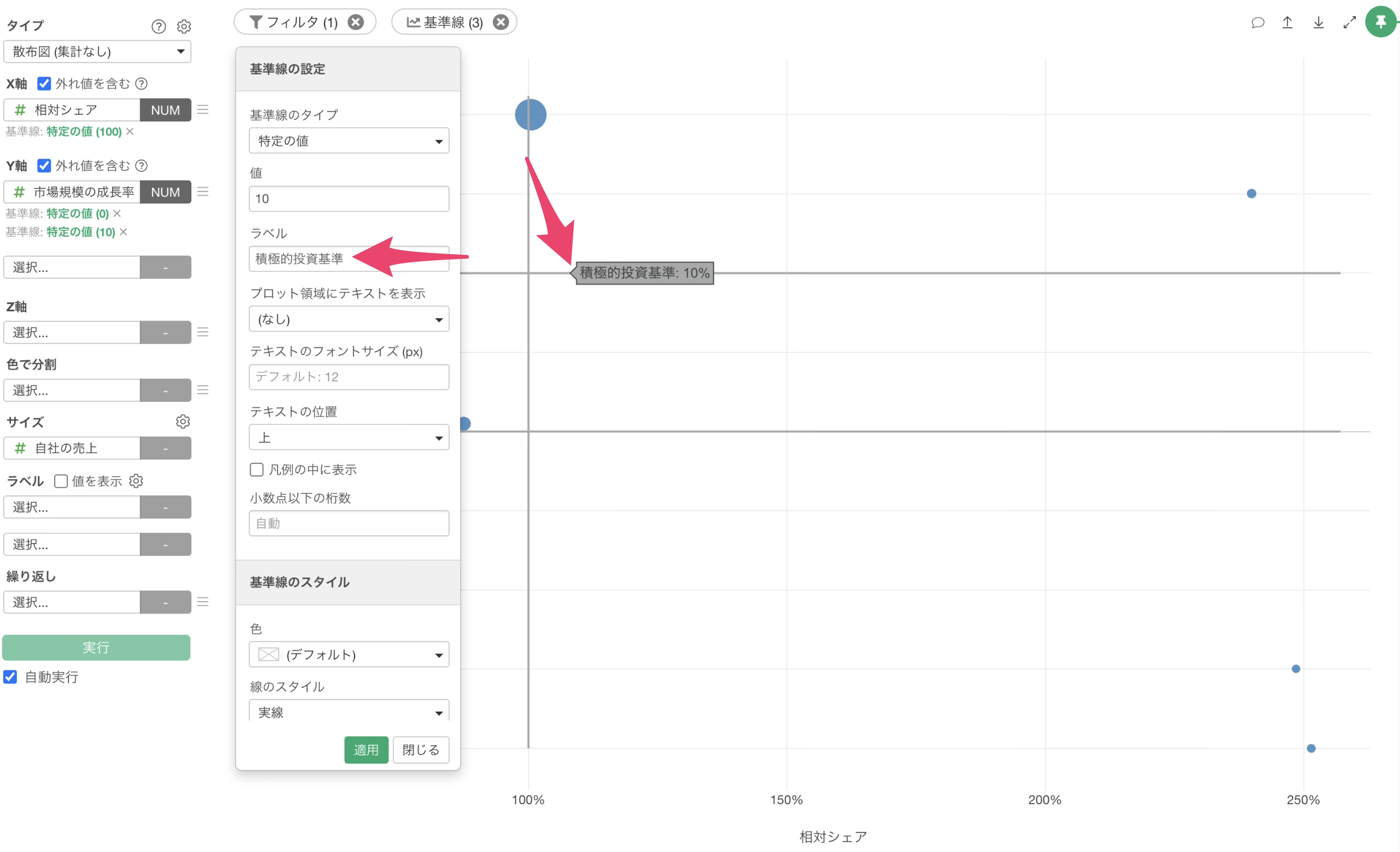 さらに、投資判断の基準となる境界線を追加します。今回は投資基準を市場成長率10%に設定するため、再度チャート上部にある基準線の追加ボタンをクリックし、Y軸のメニューから「特定の値」を選択します。