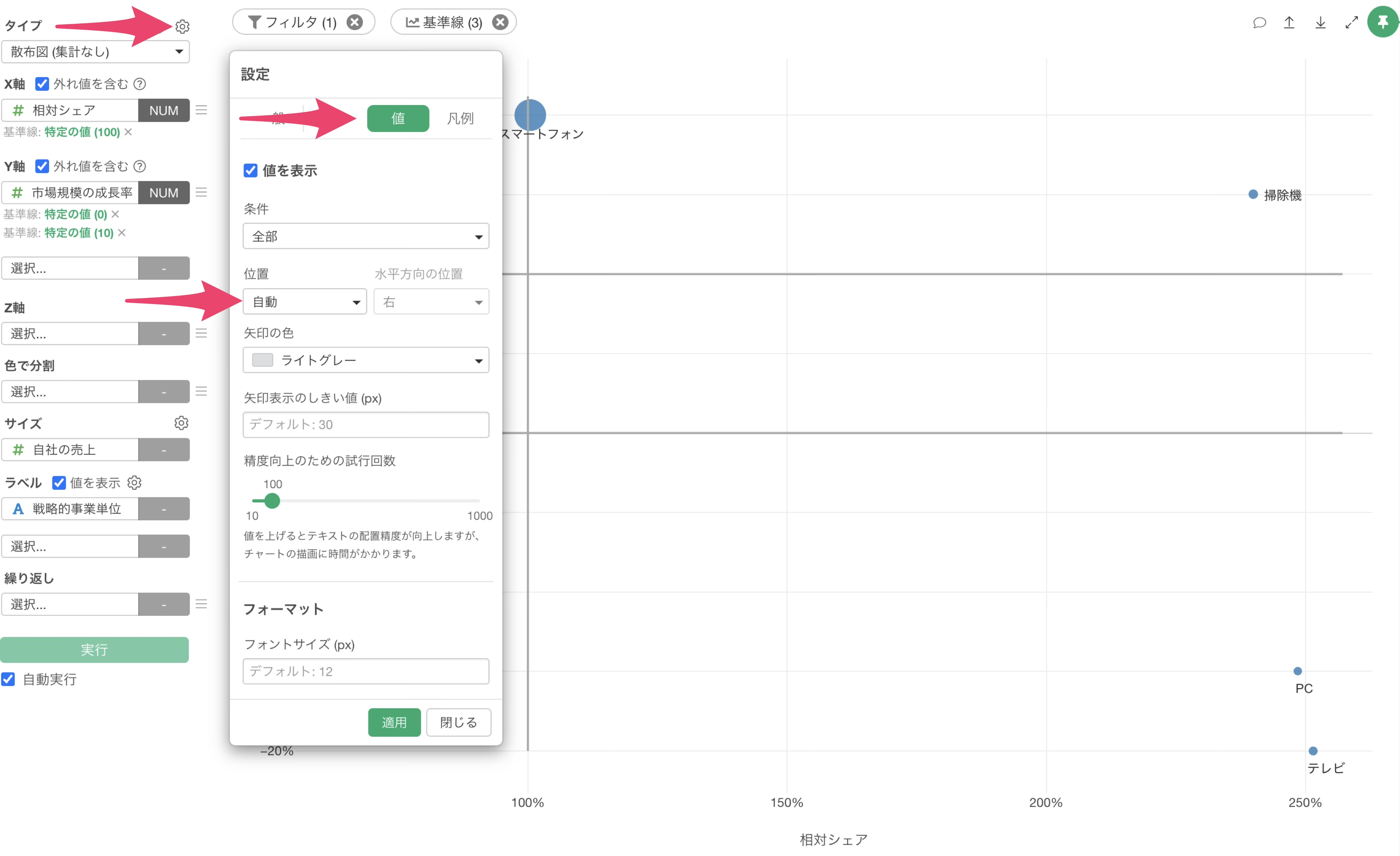 チャートの設定ダイアログが開いたら、「値」タブに移動し、「値を表示」のメニュー内の位置を「自動」に変更し、適用することで、各値の表示を整えることが可能です。