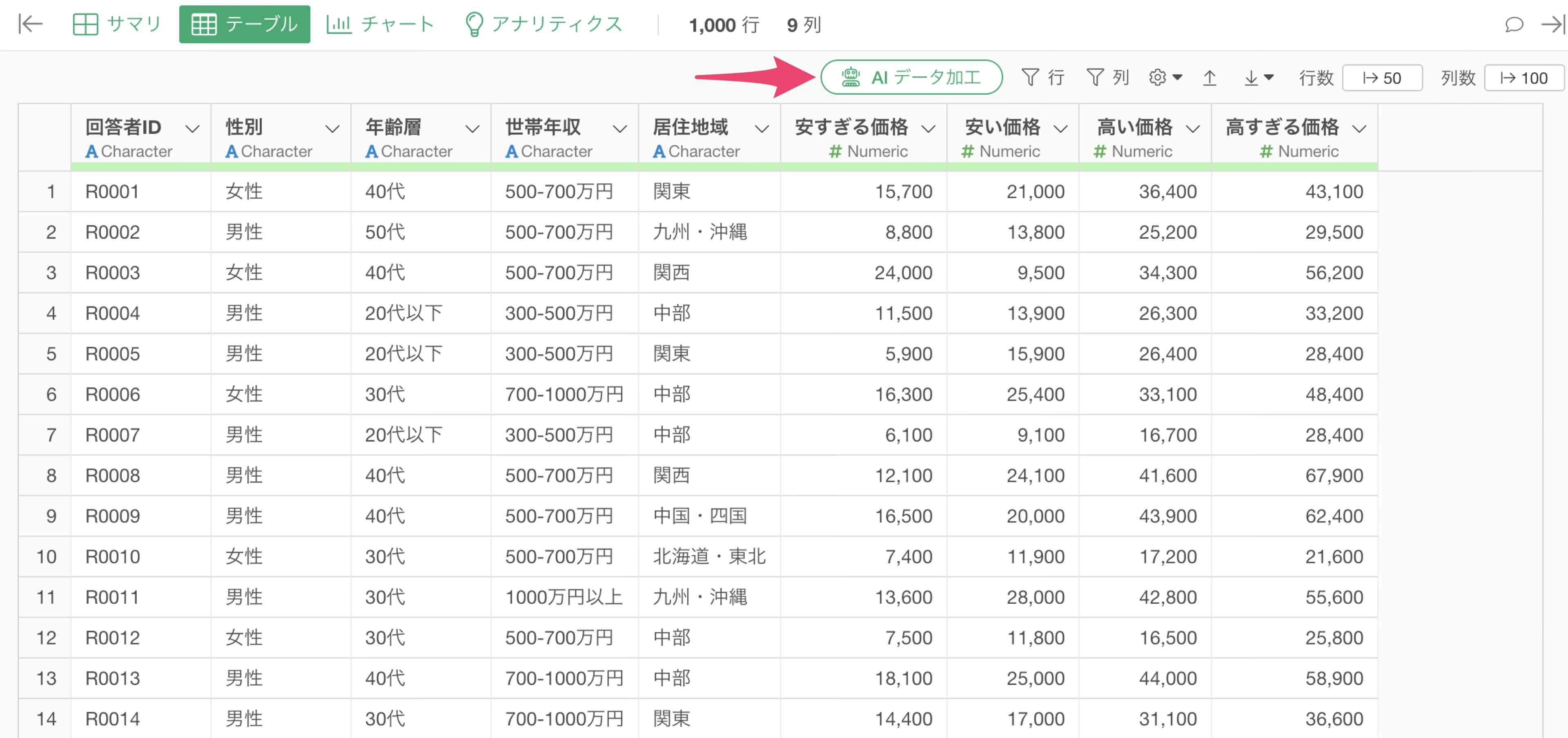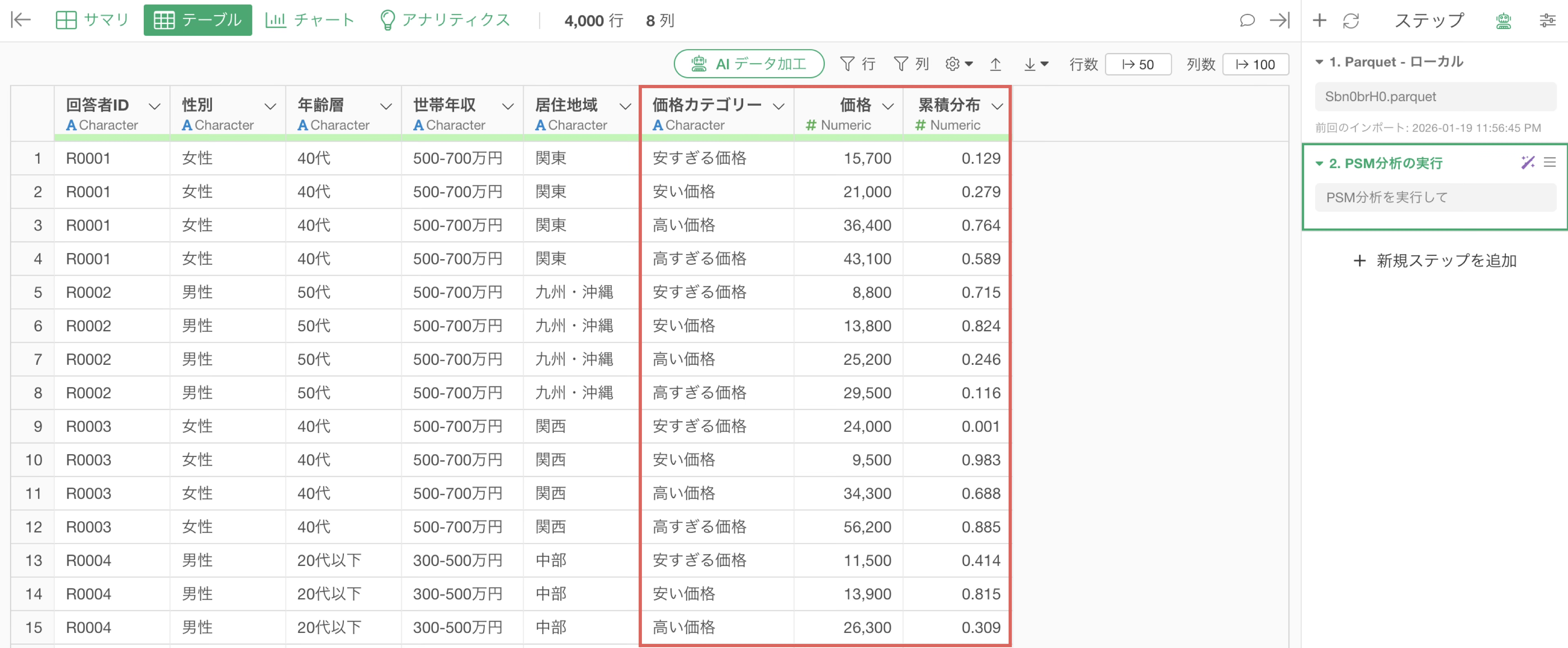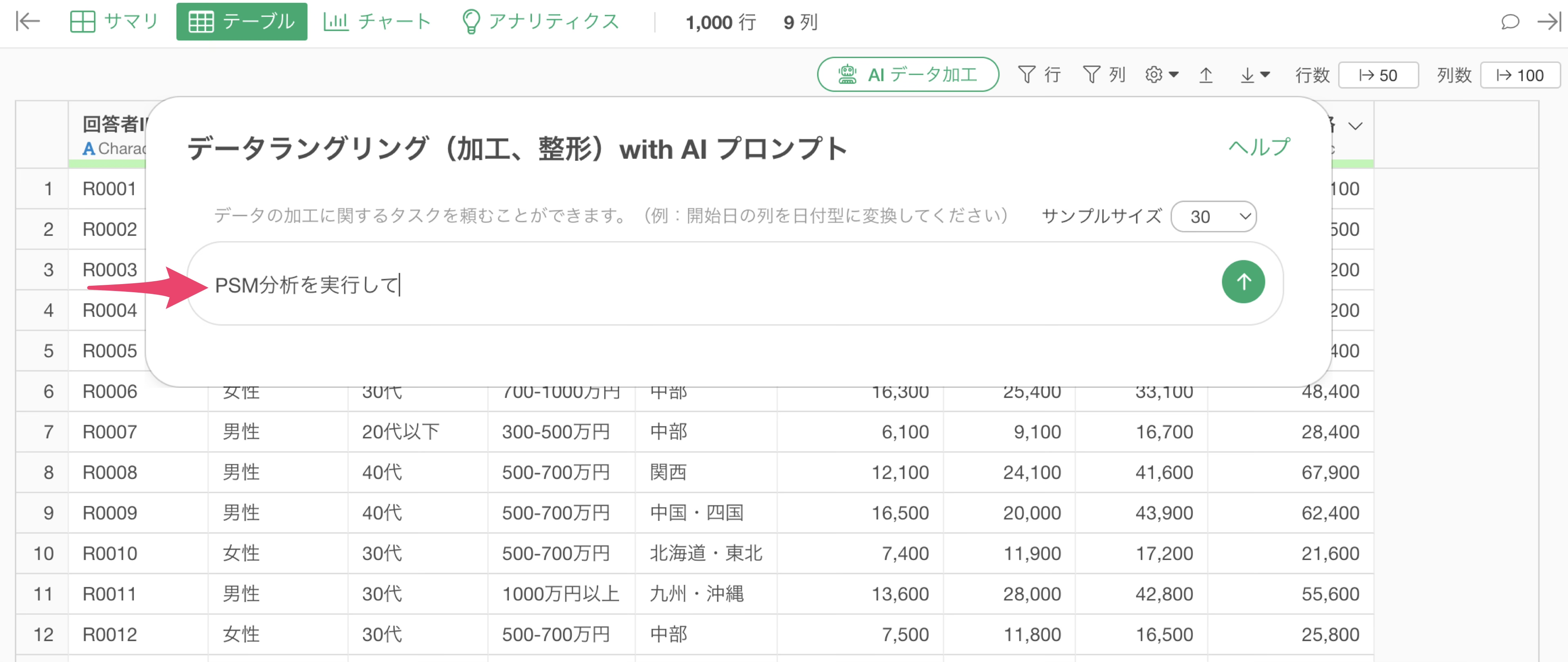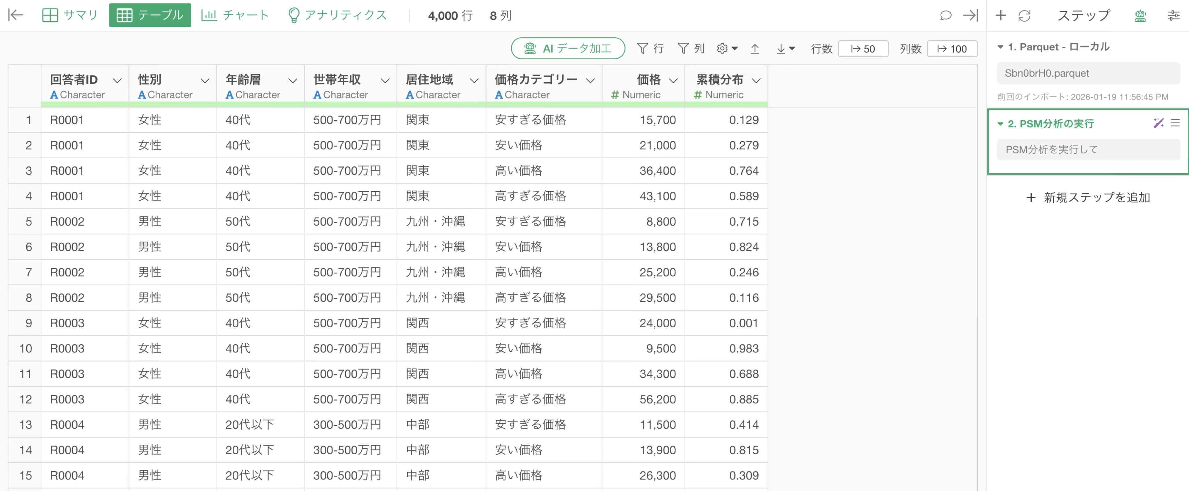 今回は、1行が1人の回答者を表すアンケートデータを使って、AI プロンプトでPSM分析を実行します。