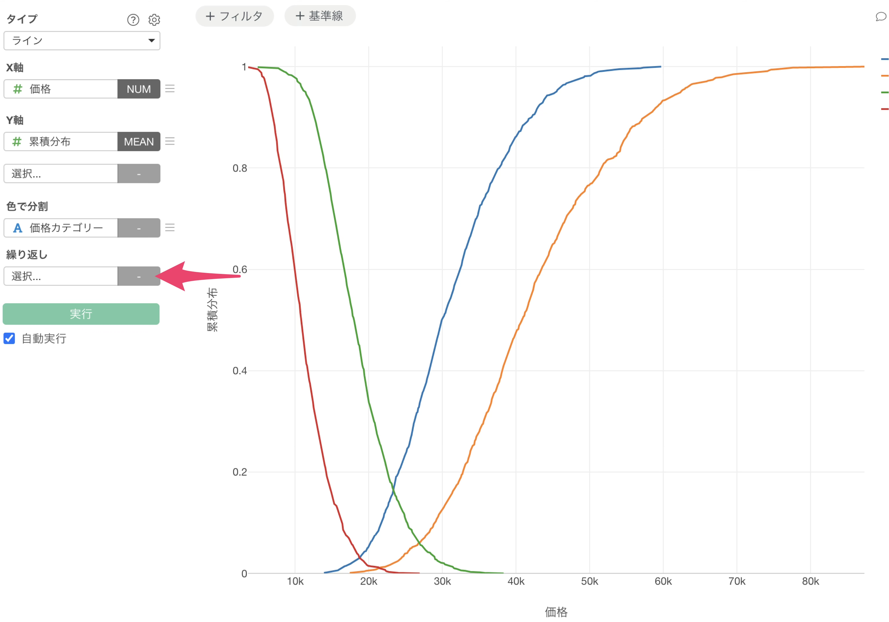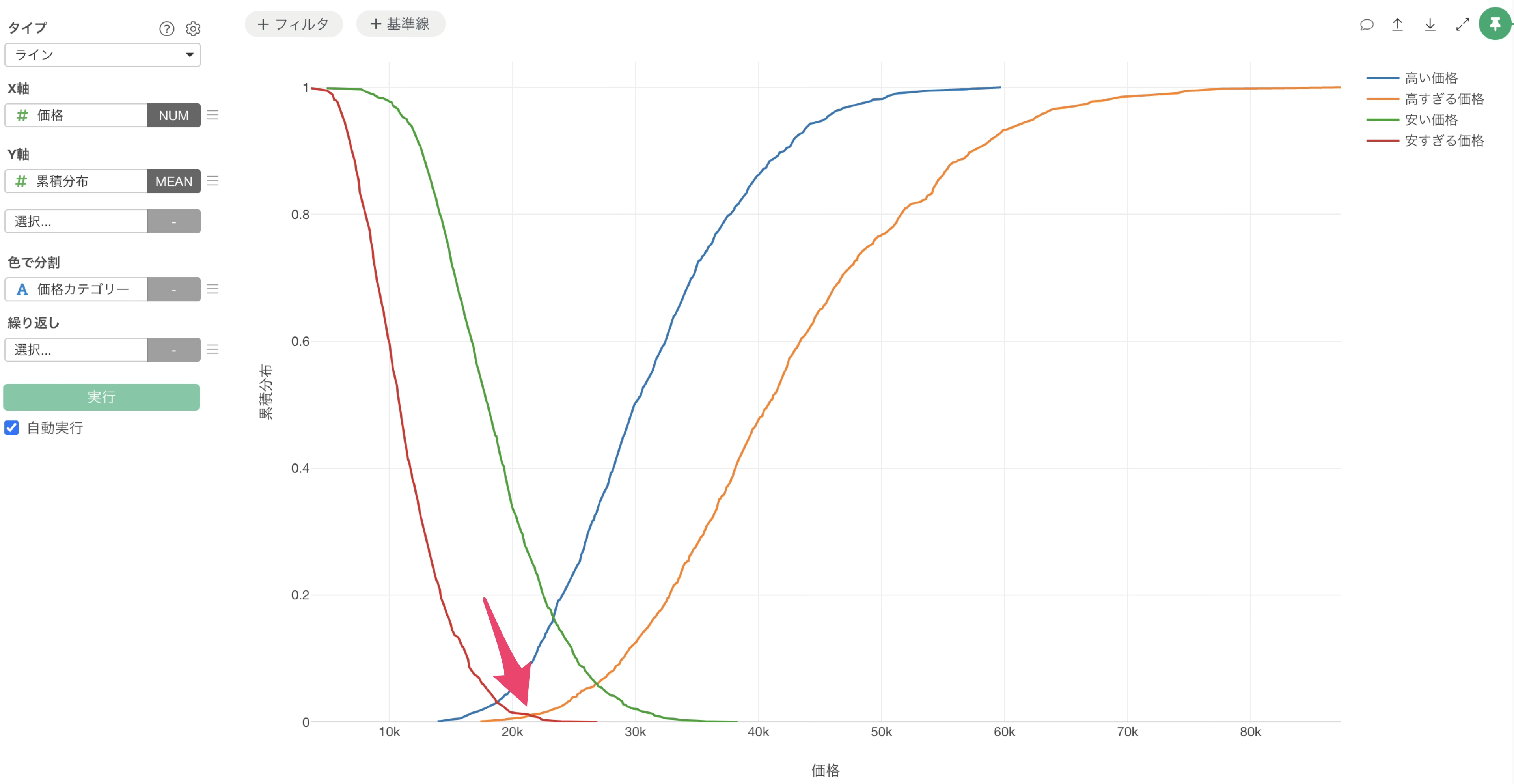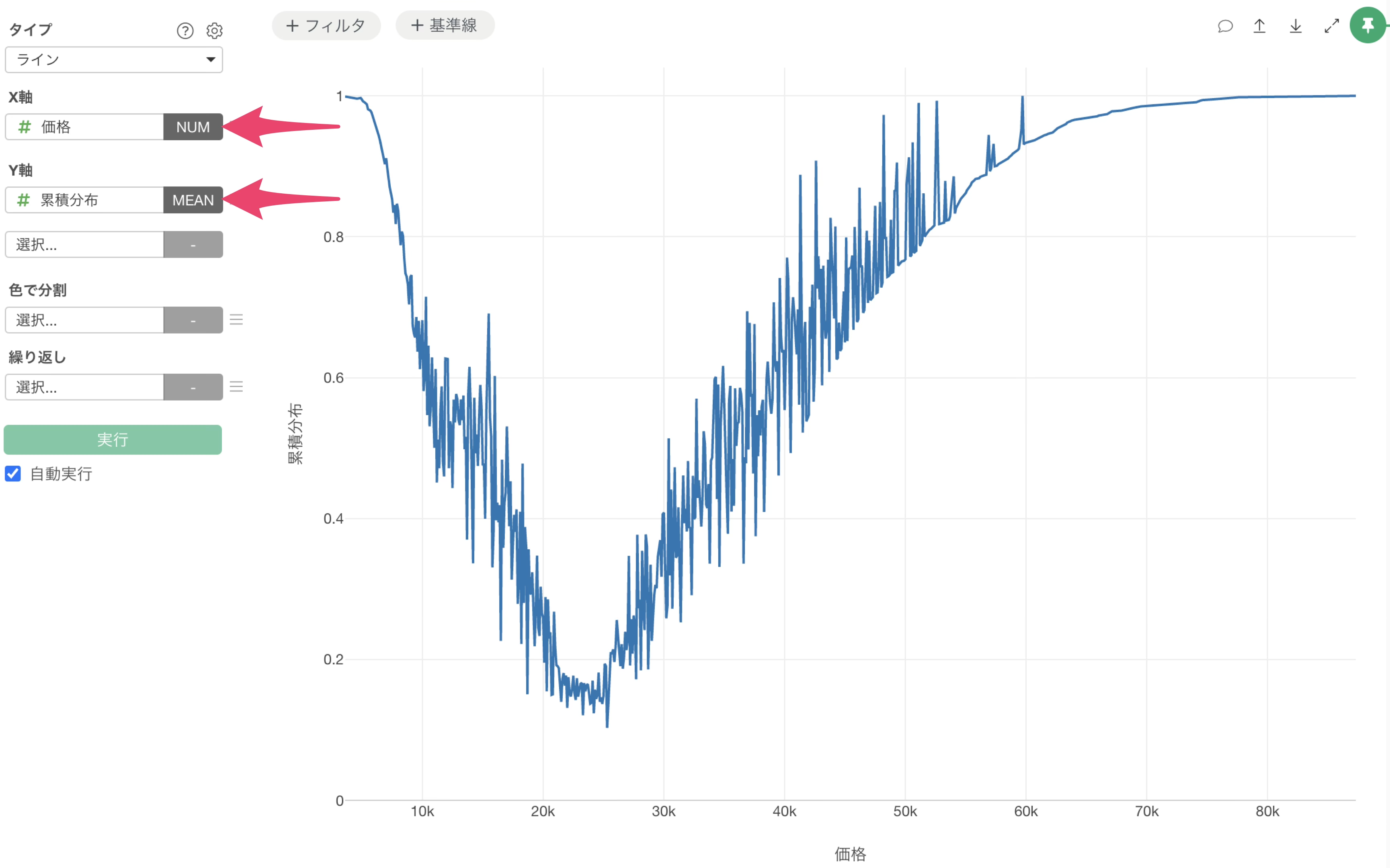 チャート・ビューに移動し、ラインチャートでX軸に「価格」、Y軸に「累積分布」を選択し、集計関数に平均値を選択します。