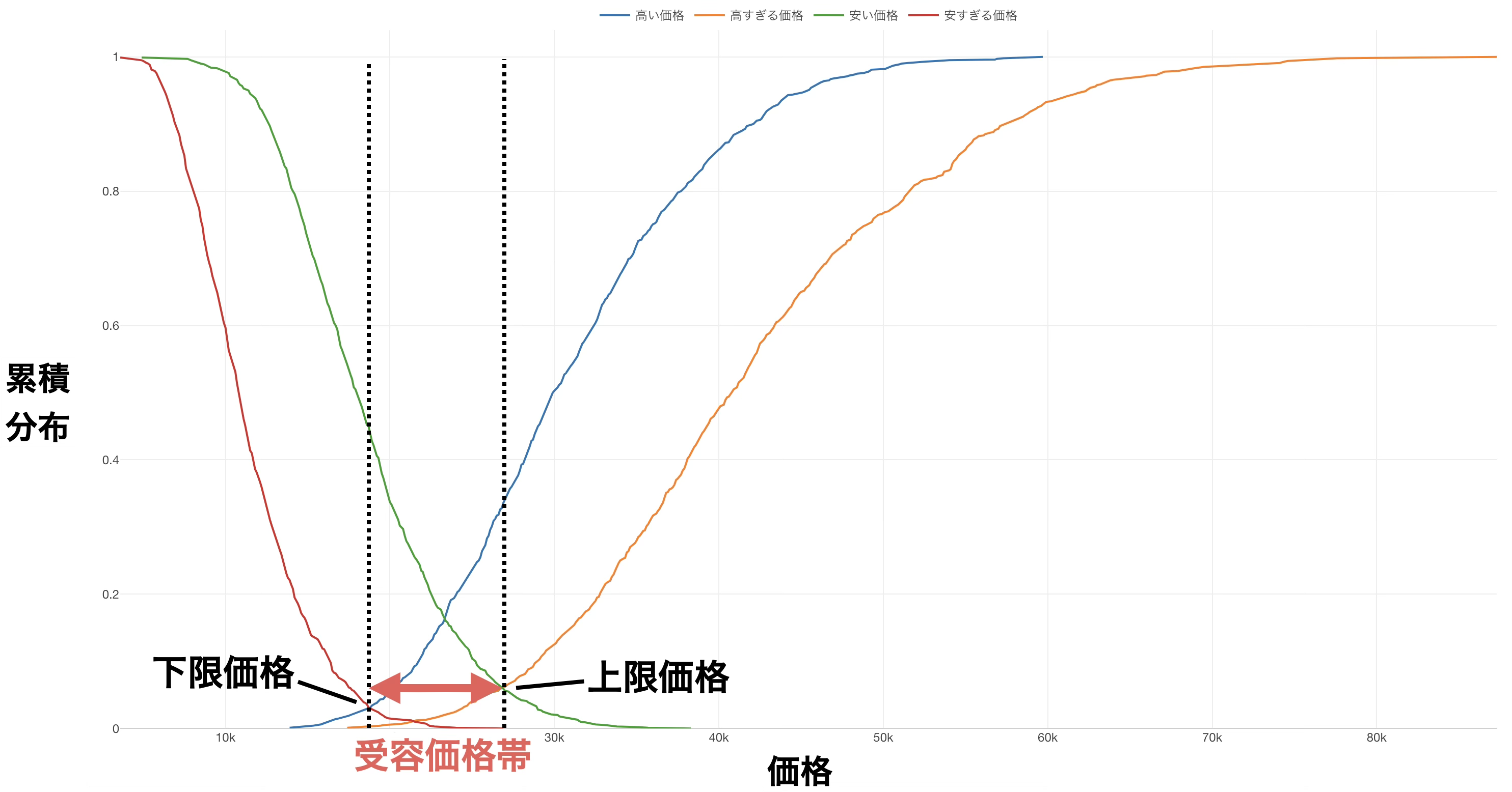 まず、「下限価格」から「上限価格」の間を、市場が受け入れる受容価格帯として定義します。