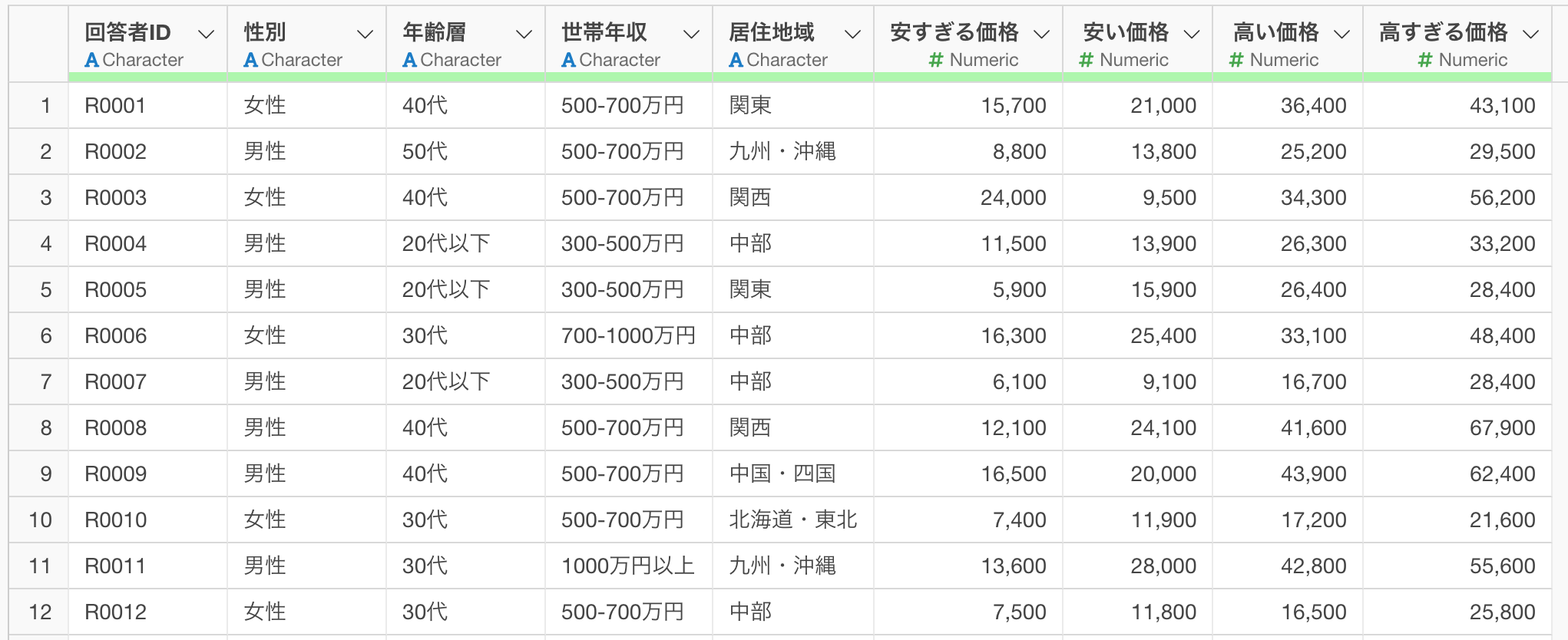 データには、回答者IDと4つの価格ポイント(安すぎる価格、安い価格、高い価格、高すぎる価格)の情報が含まれています。