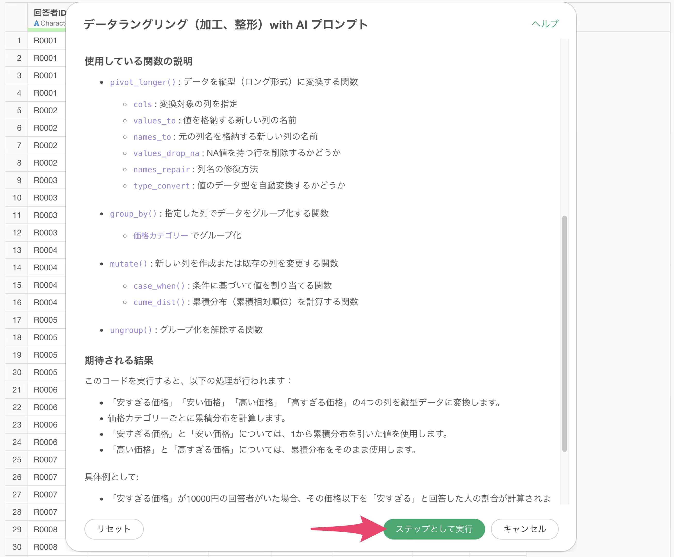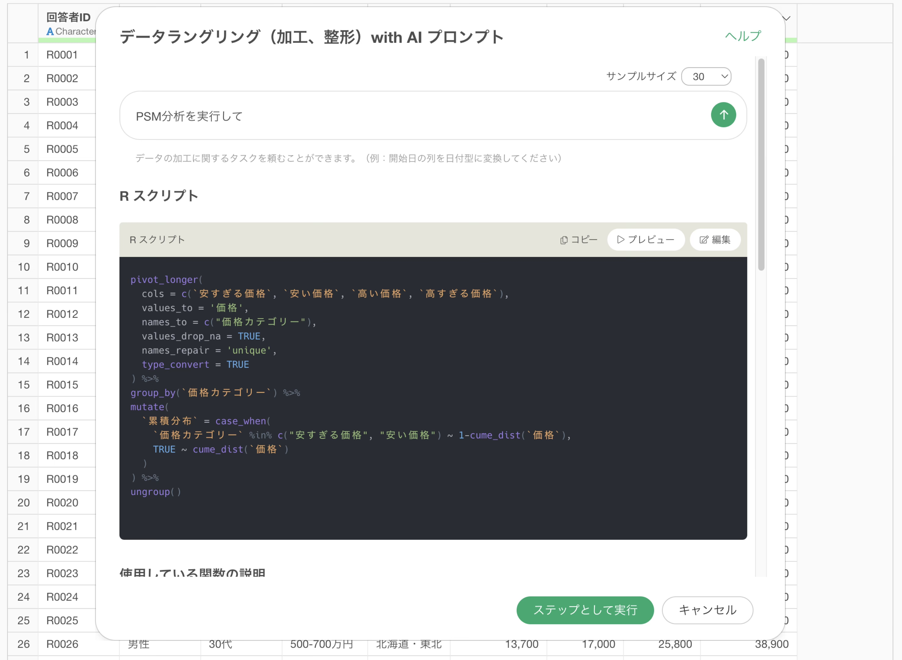 使用している関数の説明や期待される結果を確認し、PSM分析用のデータが適切に生成されることを確認し、「ステップとして実行」ボタンをクリックします。