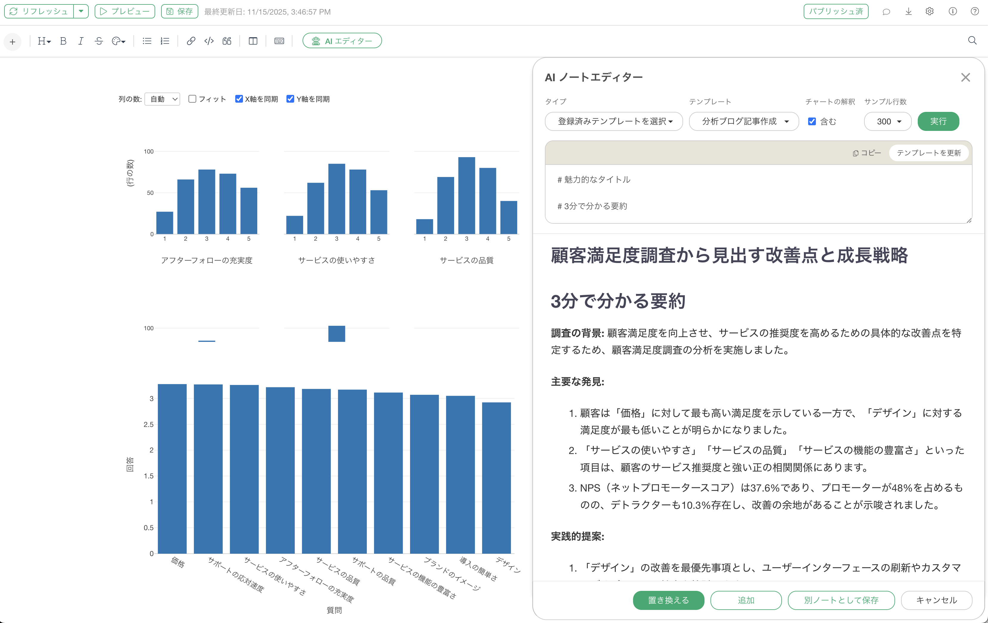 チャートの解釈機能の「含む」にチェックがついた状態で実行することで、ノート内に配置されたチャートのデータをAIが自動で深く分析し、具体的な数値や統計的根拠に基づいた専門的な解説を、指定したレポート構成の中に組み込んでくれます。