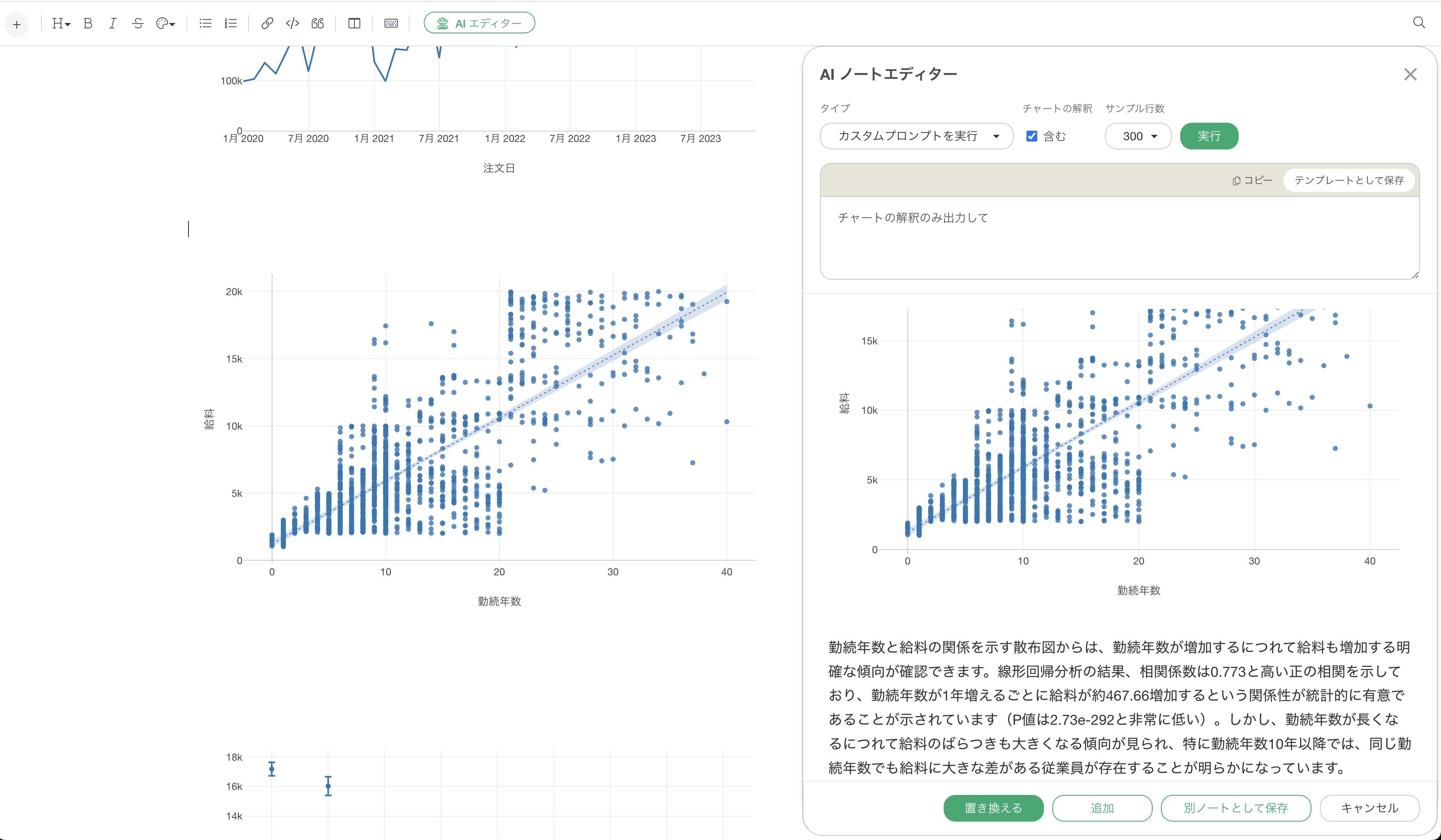 これをAI ノートエディターの「チャートの解釈」機能を使って解釈を出力します。