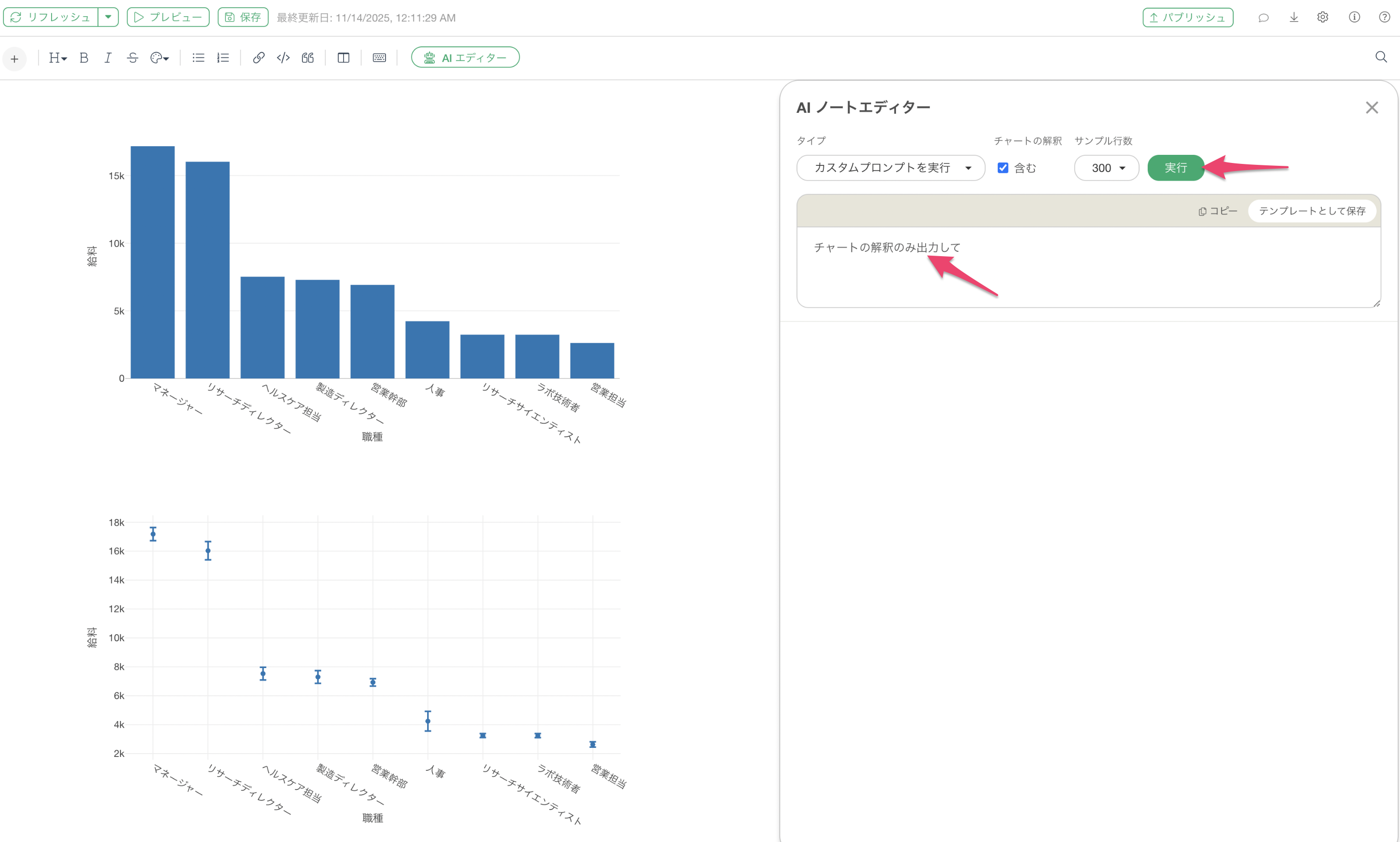 AI エディタの編集ダイアログで「カスタムプロンプトを実行」を選択し、「チャートの解釈のみ出力して」といったプロンプトを指定して実行します。