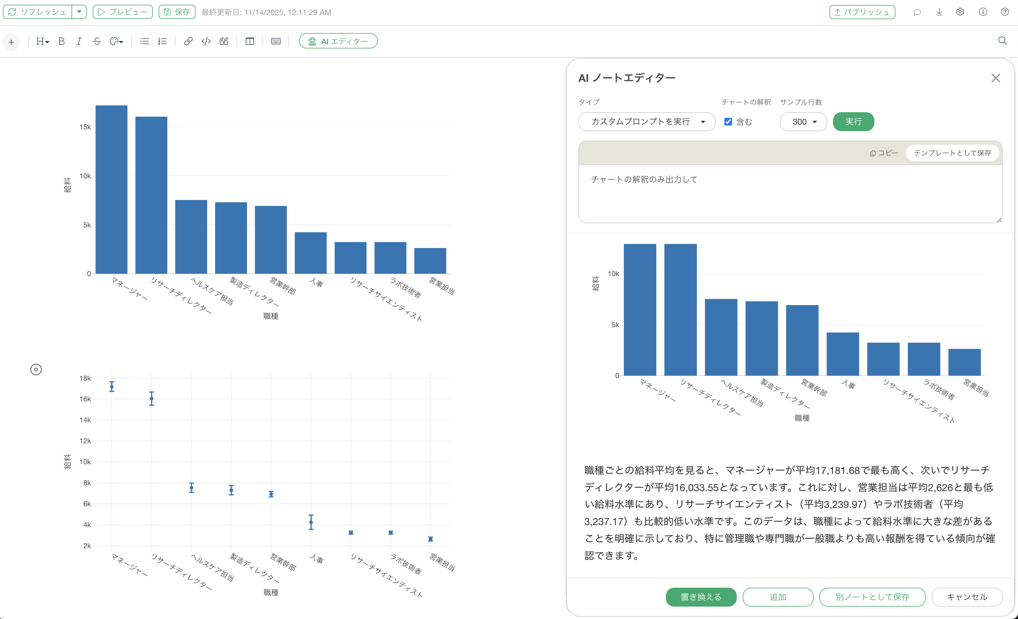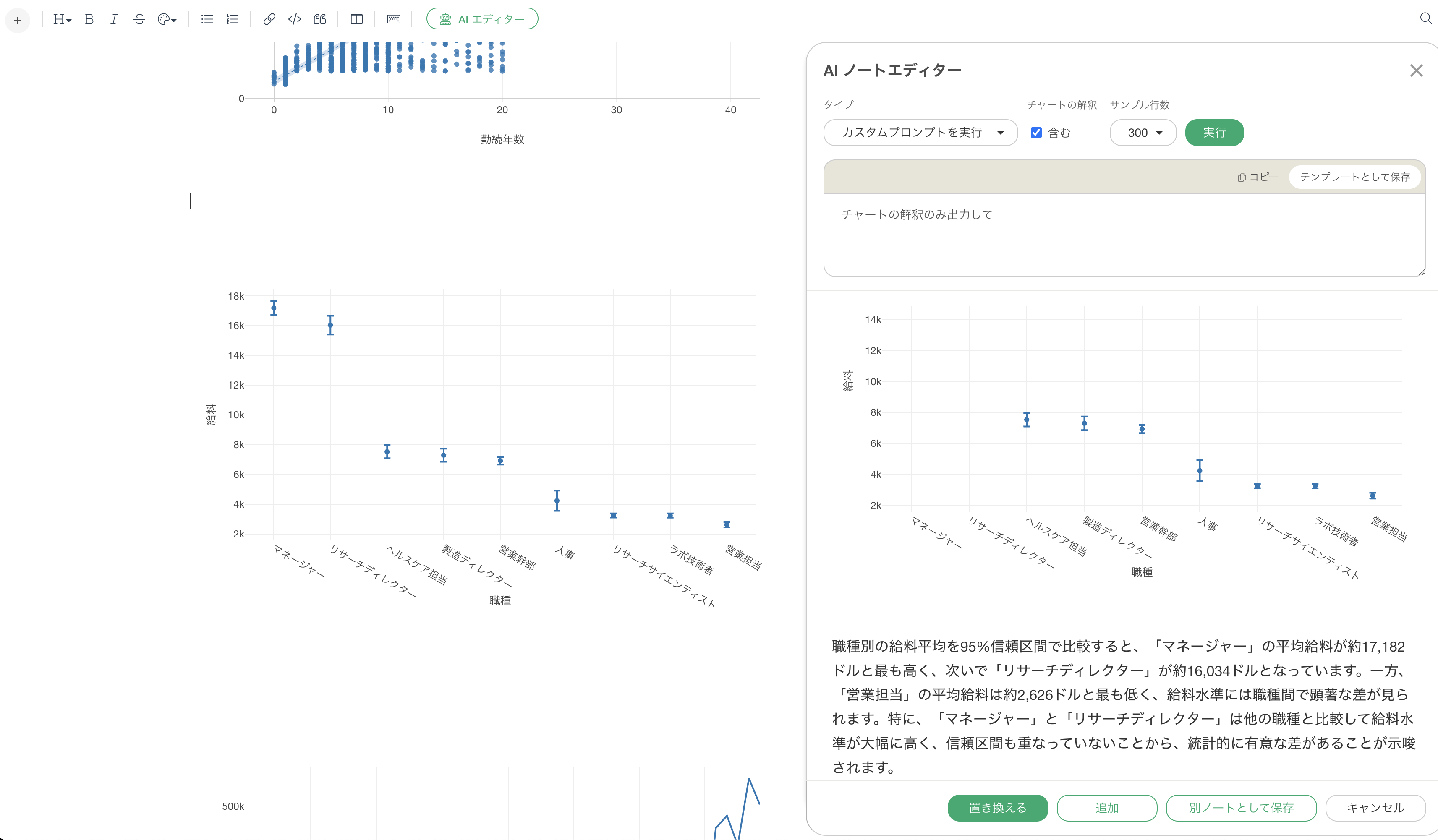AI ノート エディターのチャート解釈機能は、統計分析の専門知識を持たない方でも、統計的に妥当な解釈を得られるようにします。
