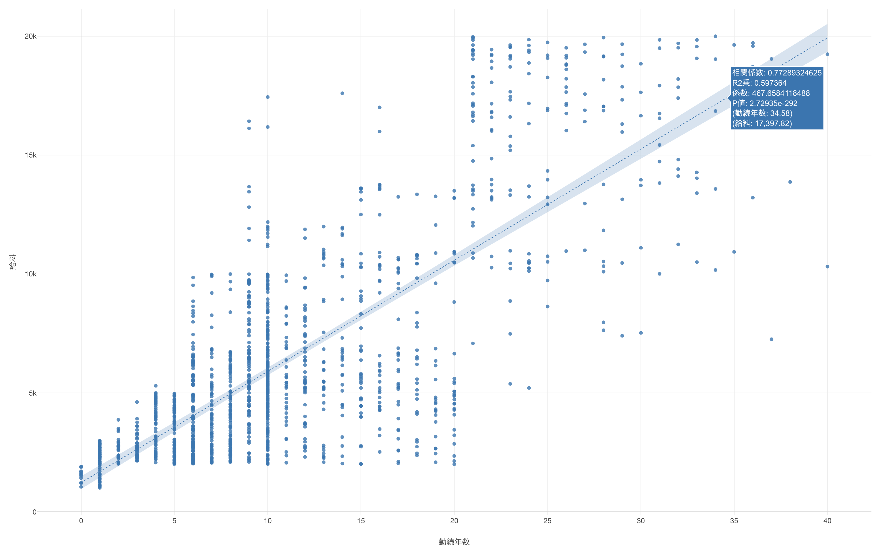 以下は勤続年数と給料の関係を表した散布図です。トレンドラインとして線形回帰の直線を引いており、相関係数やP値などの統計指標が表示されています。