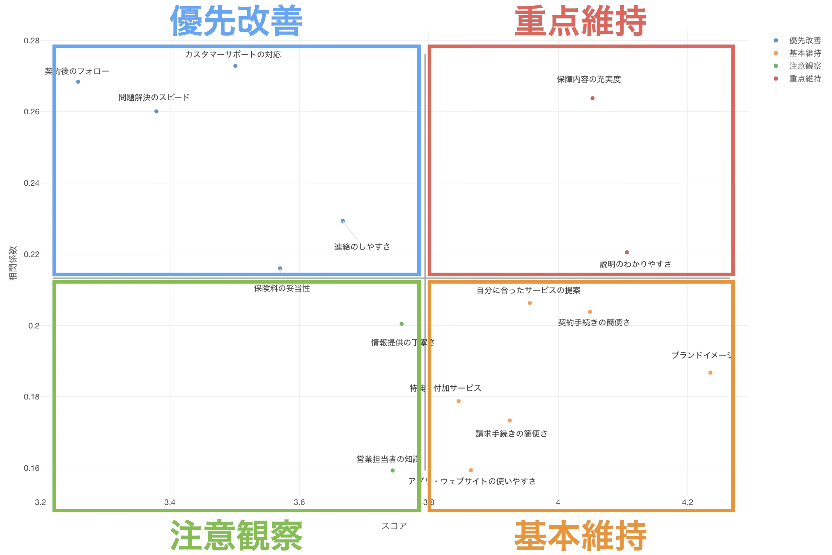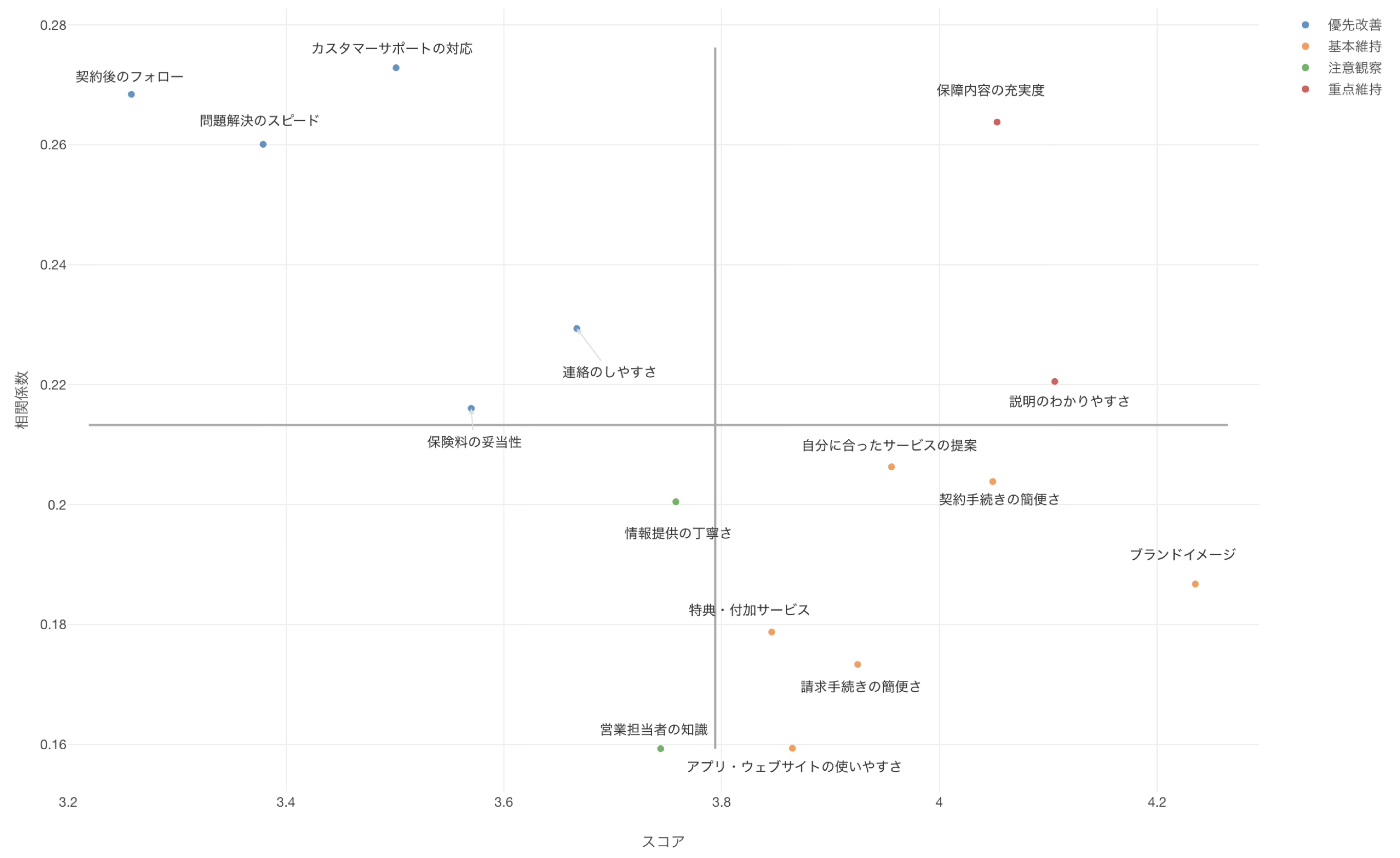 左上の「優先改善」エリアにある項目は、相関は強いもののスコアが低いため、最優先で改善に取り組むべき領域となります。