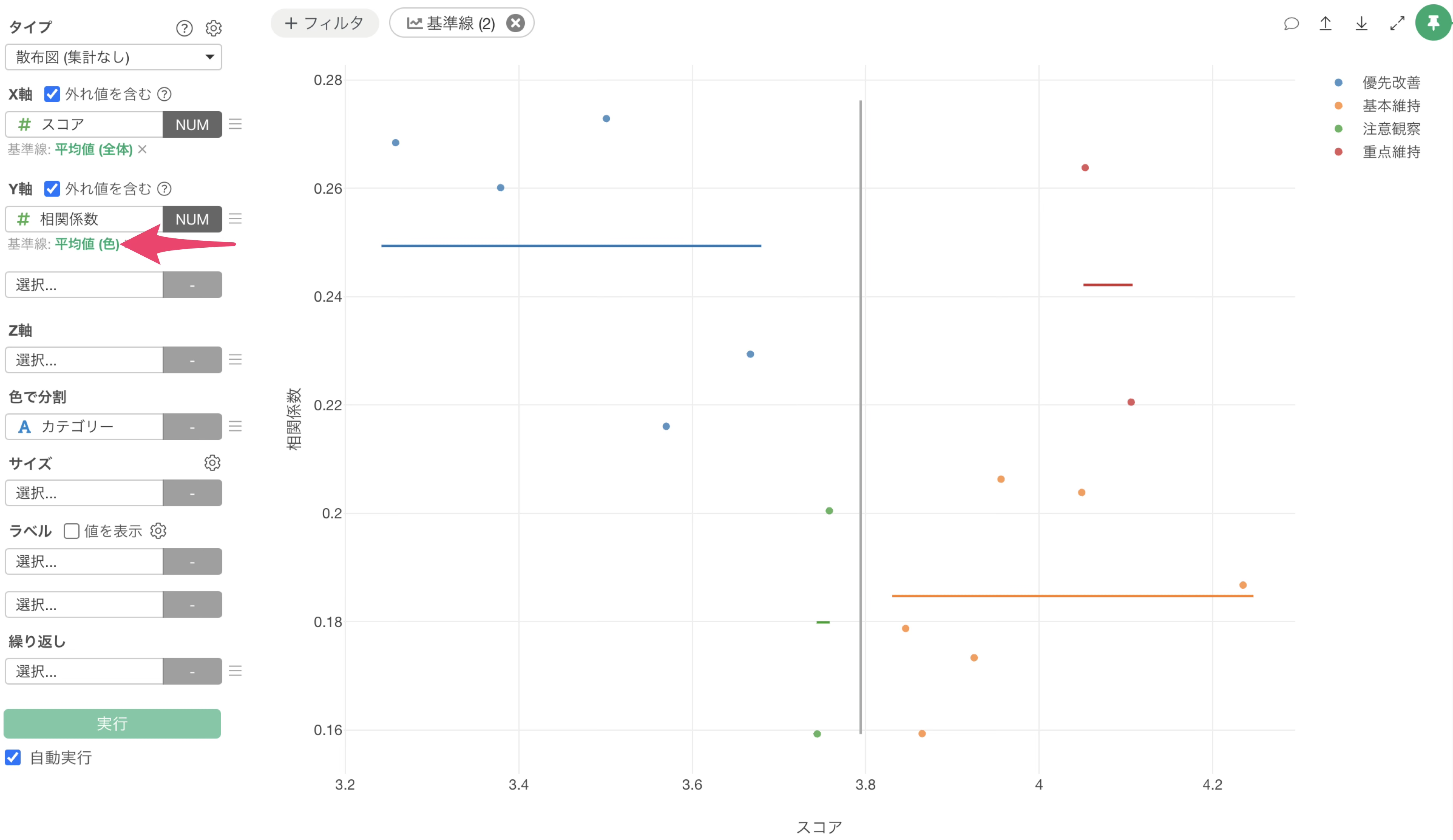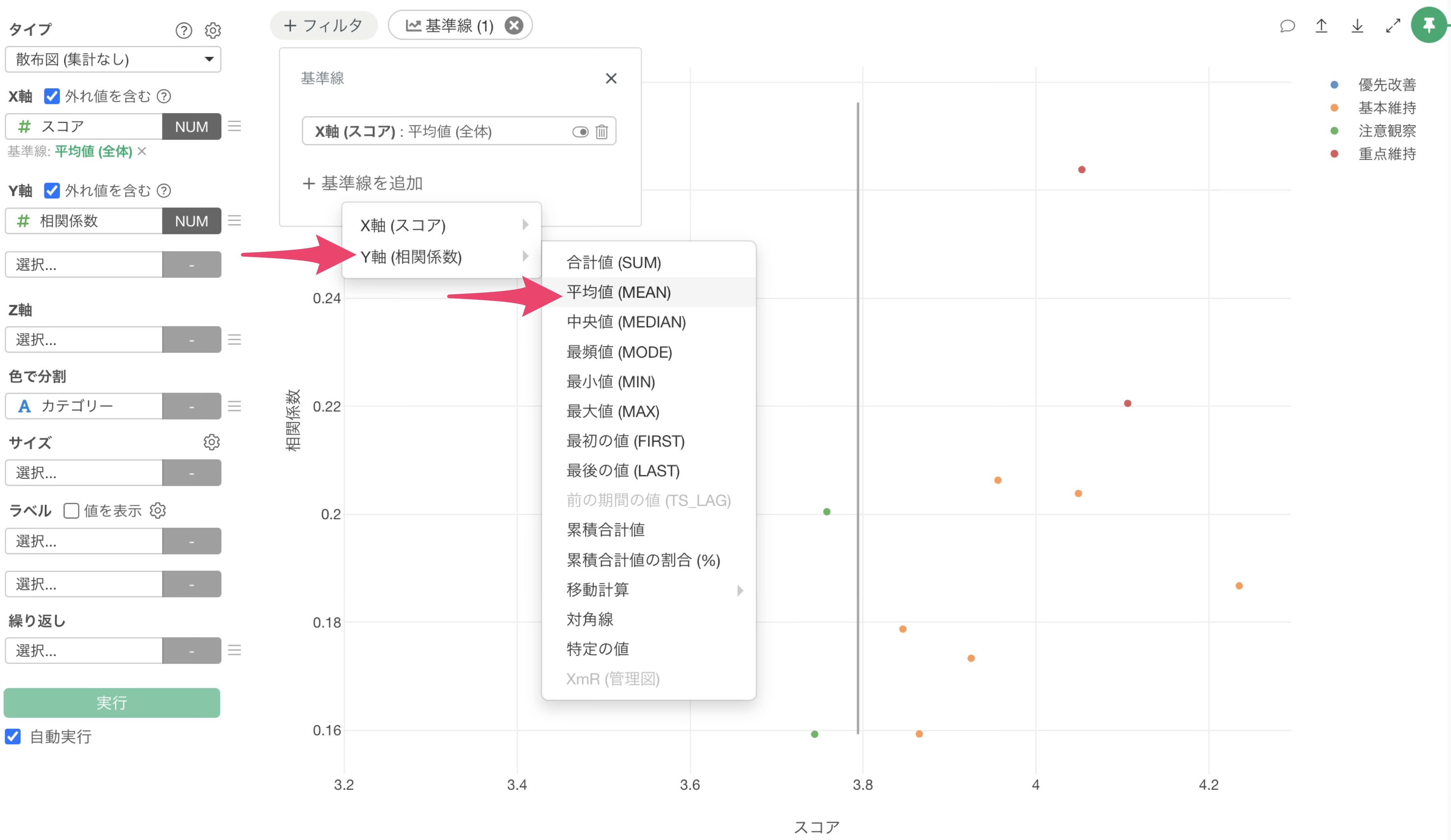4つのカテゴリーに分類するためにしきい値をリファレンスラインとして表示させたい場合は、チャート上部の基準線のプラスボタンをクリックして、X軸の平均値を選択します。