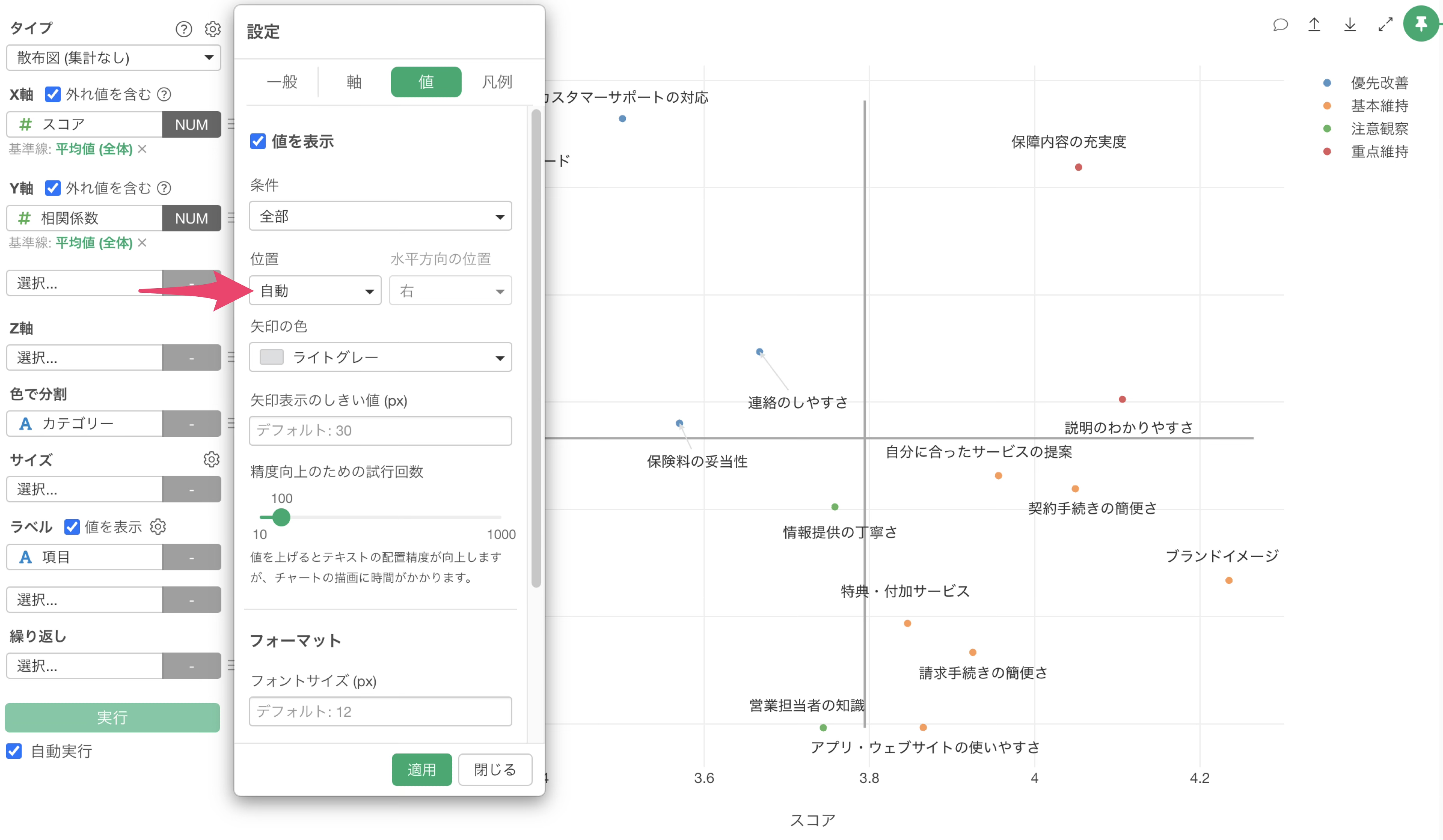 各評価項目の平均スコアと目標指標との相関関係を散布図上で可視化することで、重点的に改善すべき項目や維持すべき項目を特定できます。