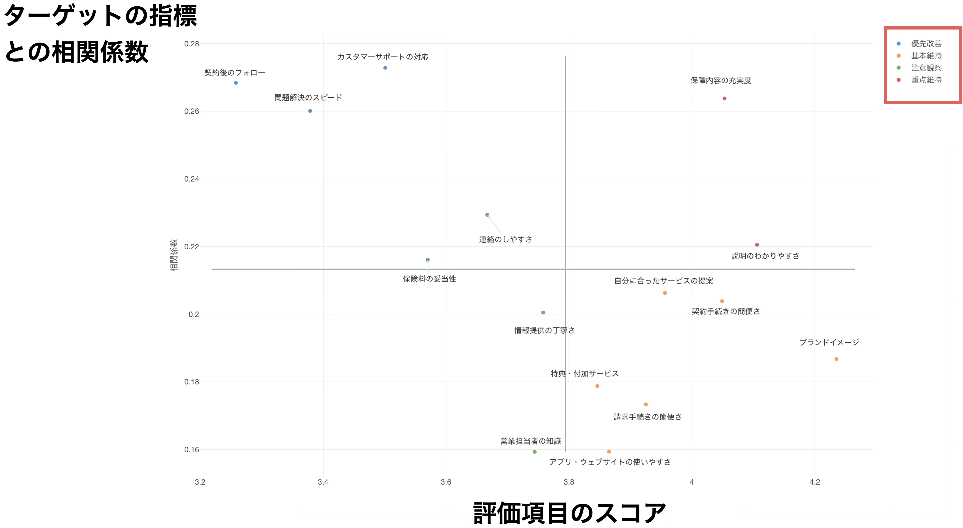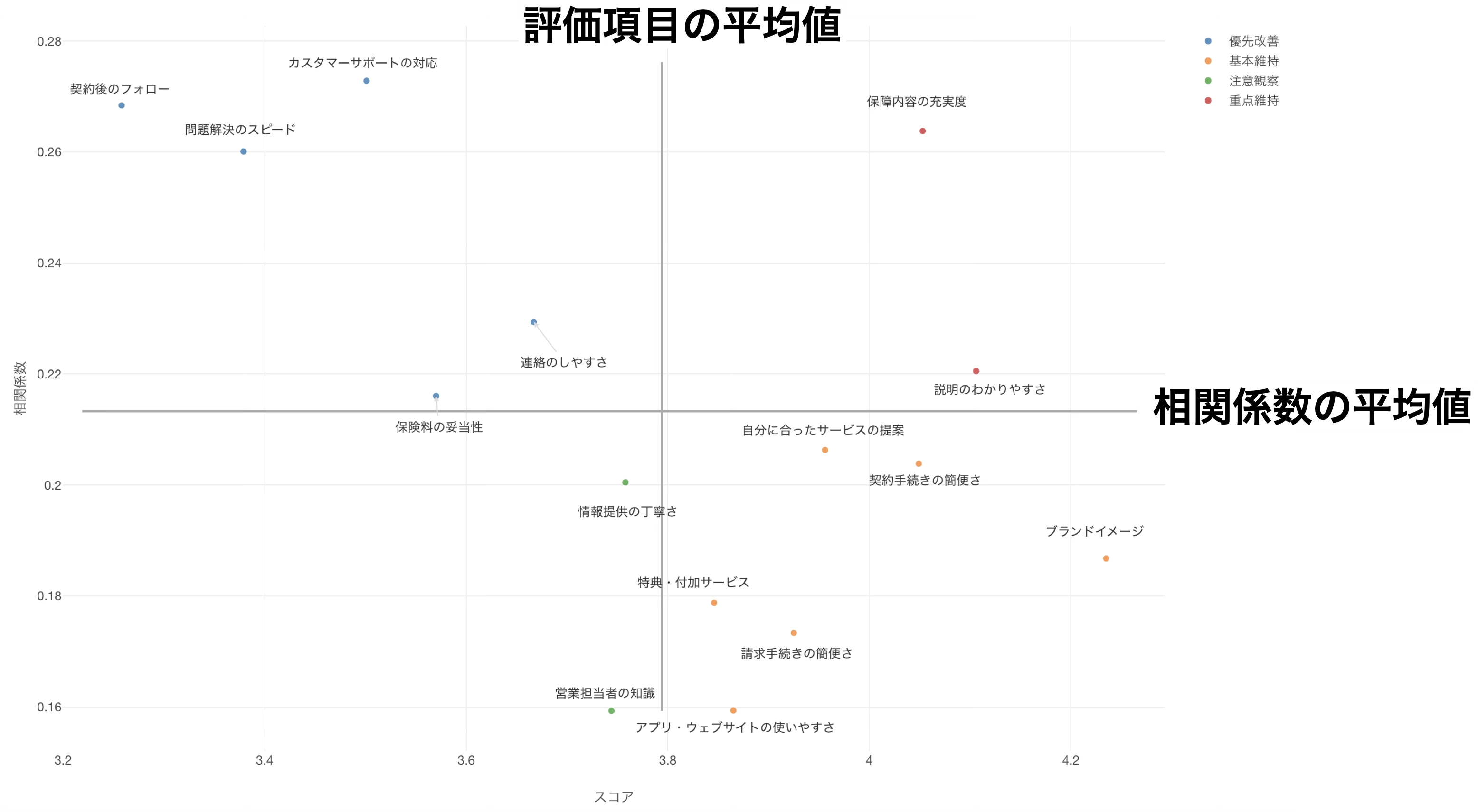 前述したように、評価項目は、評価項目の平均値とターゲットとなる指標に対する相関係数の平均値をしきい値として、4つのカテゴリーに分けられます。