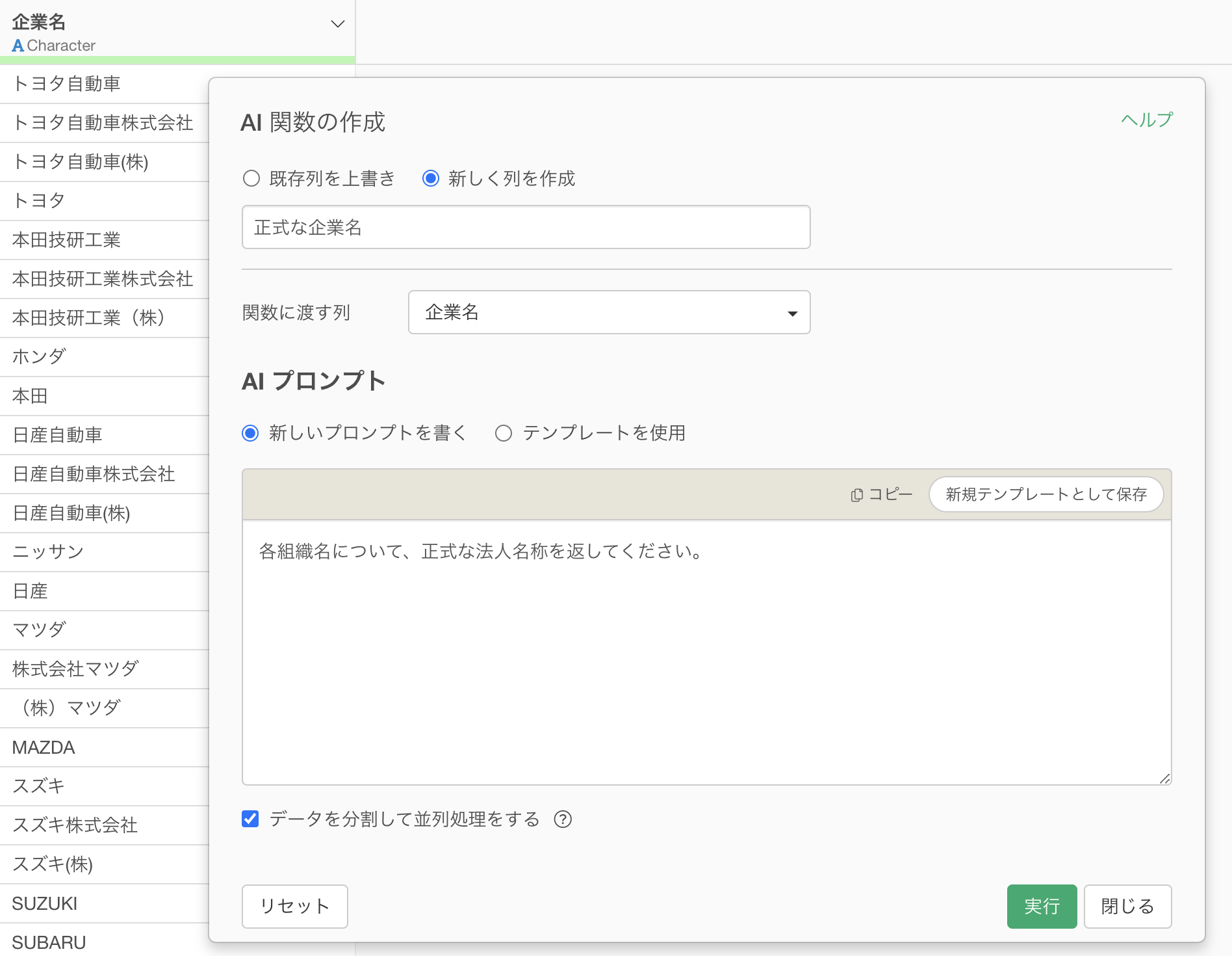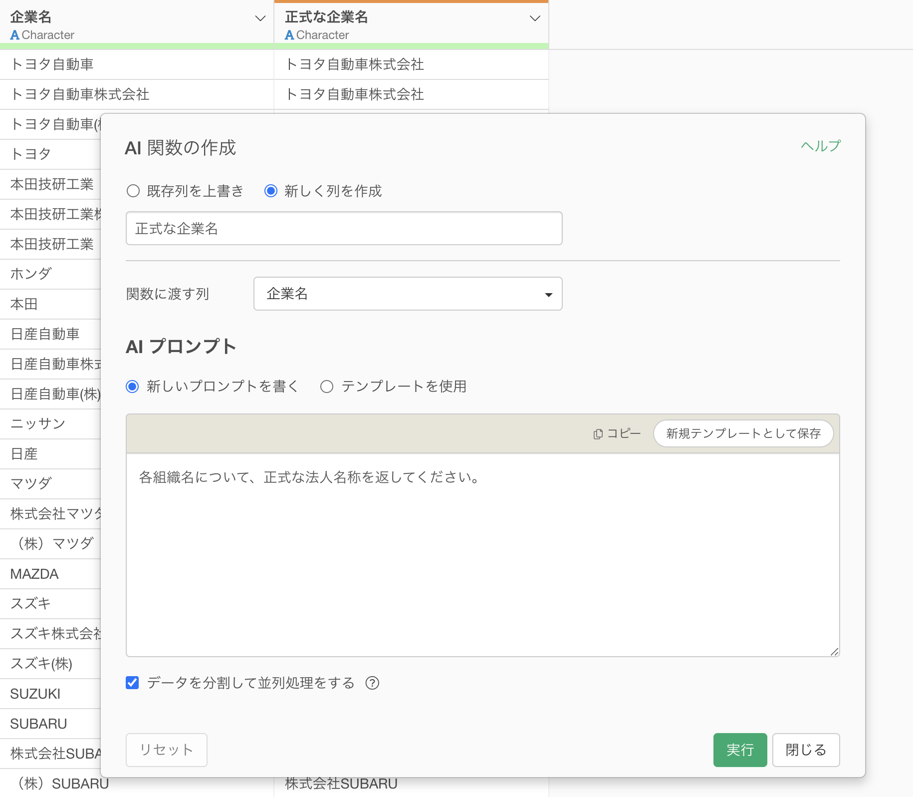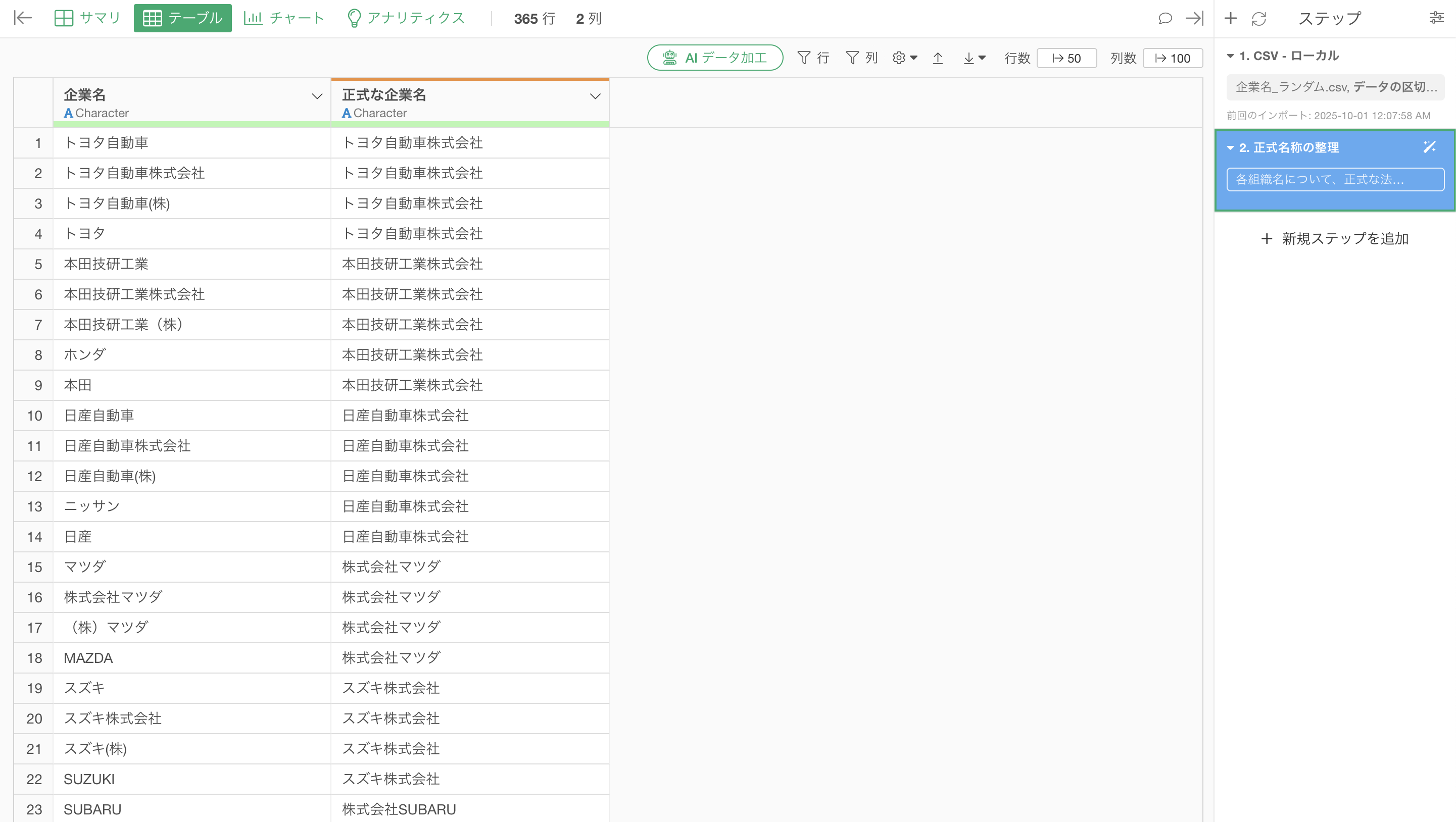 実行すると、AIによって出力された正式な企業名の新しい列が作成されます。