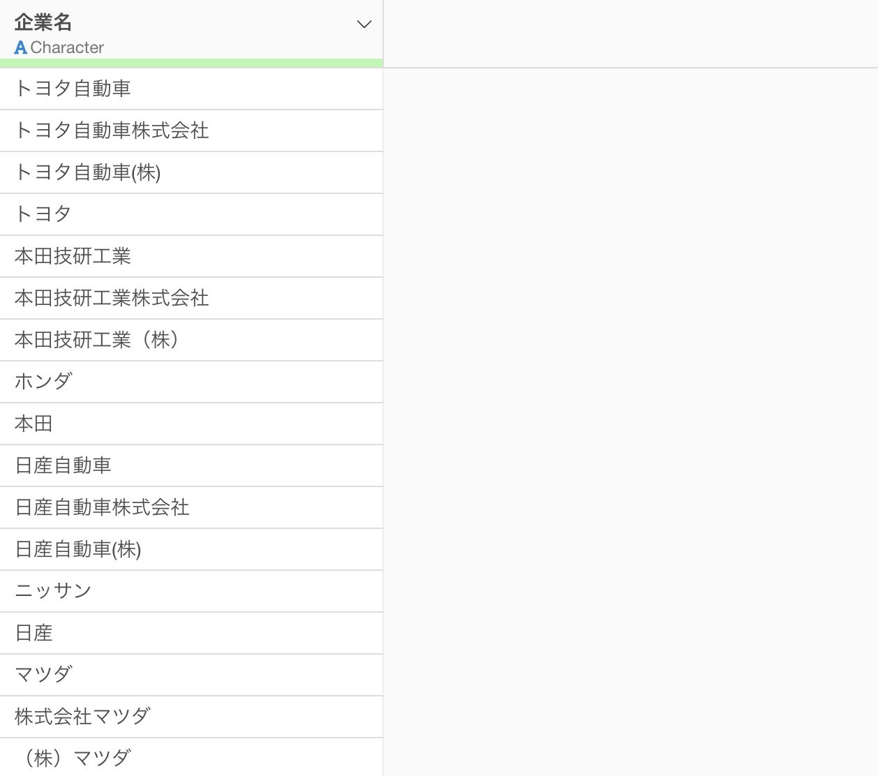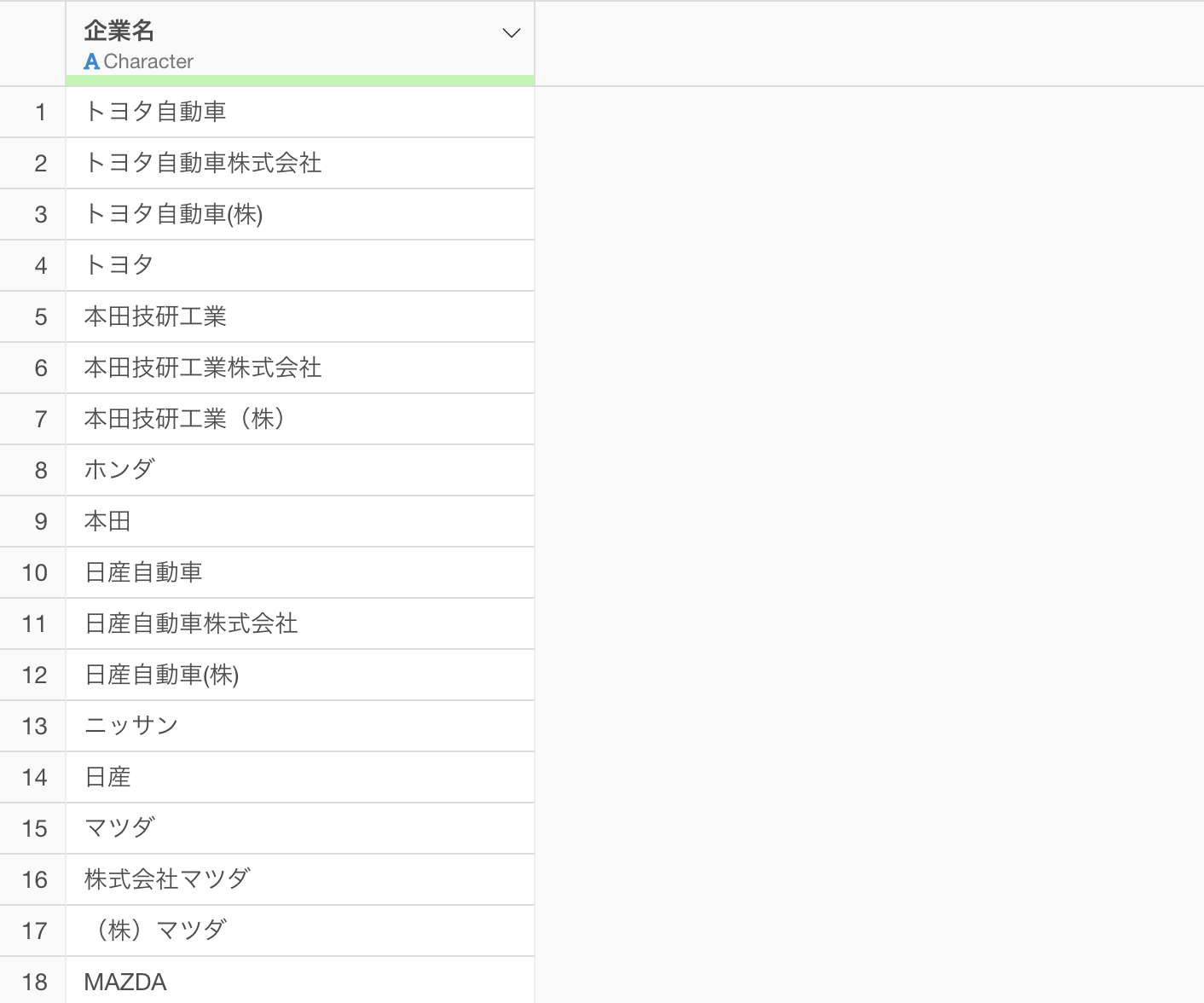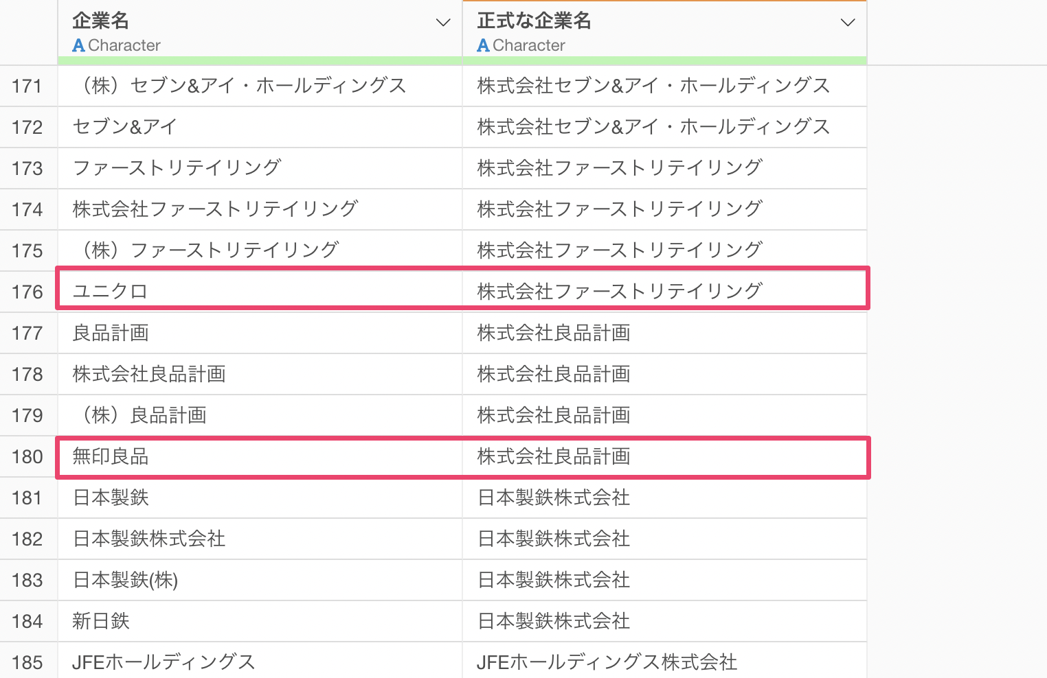 この結果を見ると、「株式会社」の有無や前株・後株の違い、さらには略称など、様々な表記揺れが統一された結果が得られていることがわかります。