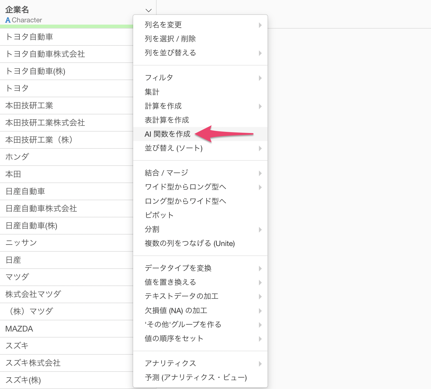 まず、表記揺れを修正したい列のヘッダメニューから、「AI 関数」を選択します。
