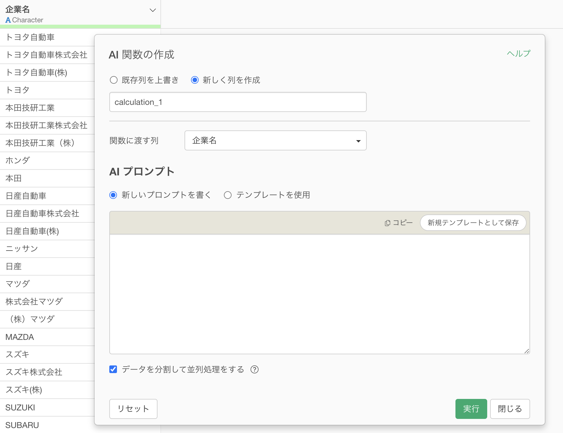 これにより、AI 関数のダイアログが表示されます。このダイアログで、AIに実行させたいタスクを自然言語で記述します。