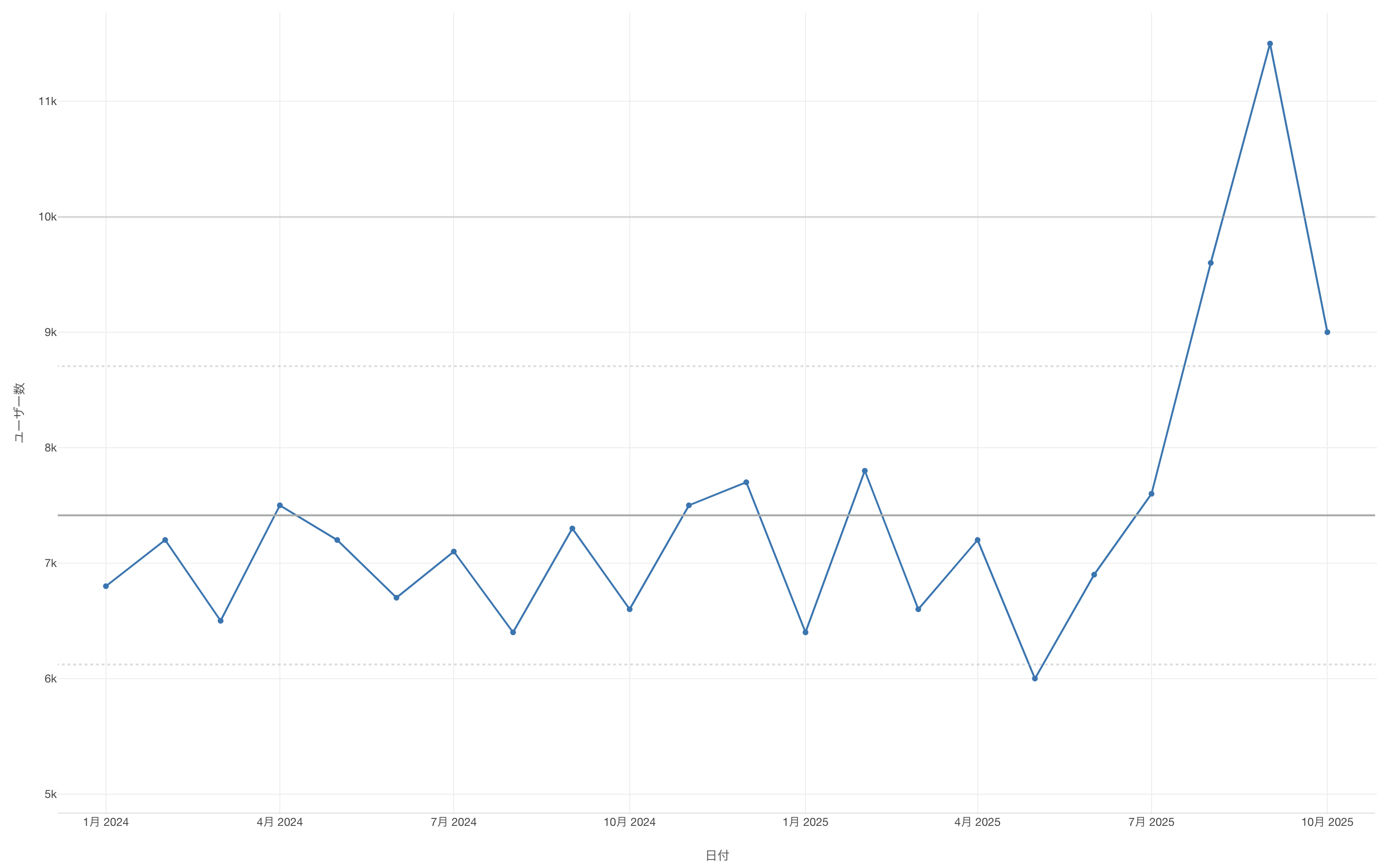 今回のデータでは、2025年9月にユーザー数が11,500人に達し、管理限界の上限である9,997.636を大きく超えたため、シグナルが検出されました。これは、データポイントが通常のばらつきの範囲を大きく超えている状態で、異常な変動や特別な出来事があったことを示します。この急増は、特定のプロモーション活動や外部要因によるものと考えられ、詳細な分析が必要です。