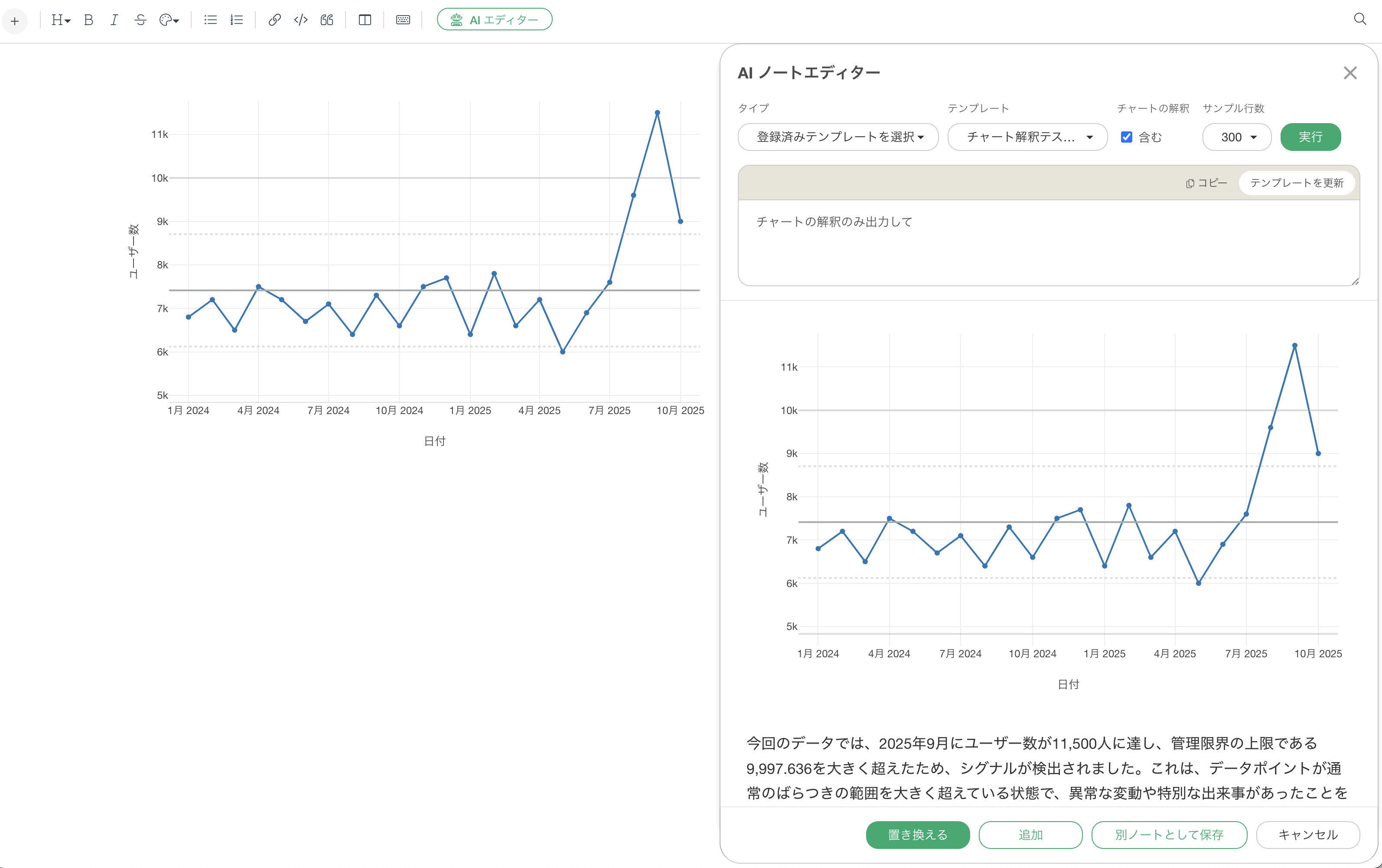Exploratoryの「AI ノート エディター」のチャート解釈機能は、こうした時系列データの分析結果を自動的に解釈し、トレンドの変化、予測との比較、異常値検知を含む詳細な説明文を生成します。