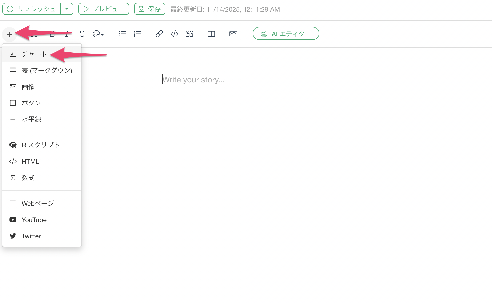 AI エディタの編集ダイアログで「カスタムプロンプトを実行」を選択し、「チャートの解釈のみ出力して」といったプロンプトを指定して実行します。