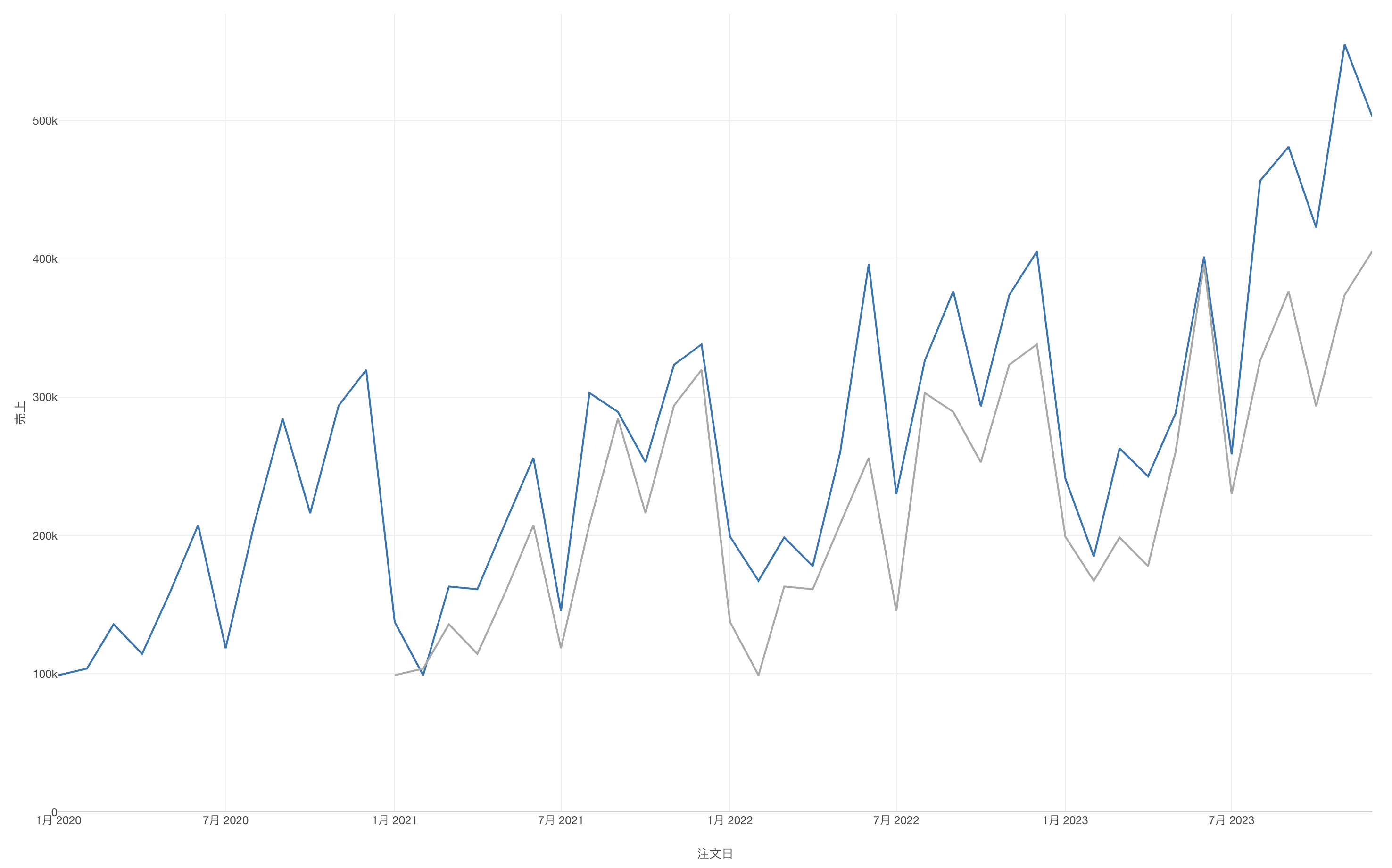 以下は月毎の売上合計と合わせて、基準線を使って前年同月の値を可視化したラインチャートです。