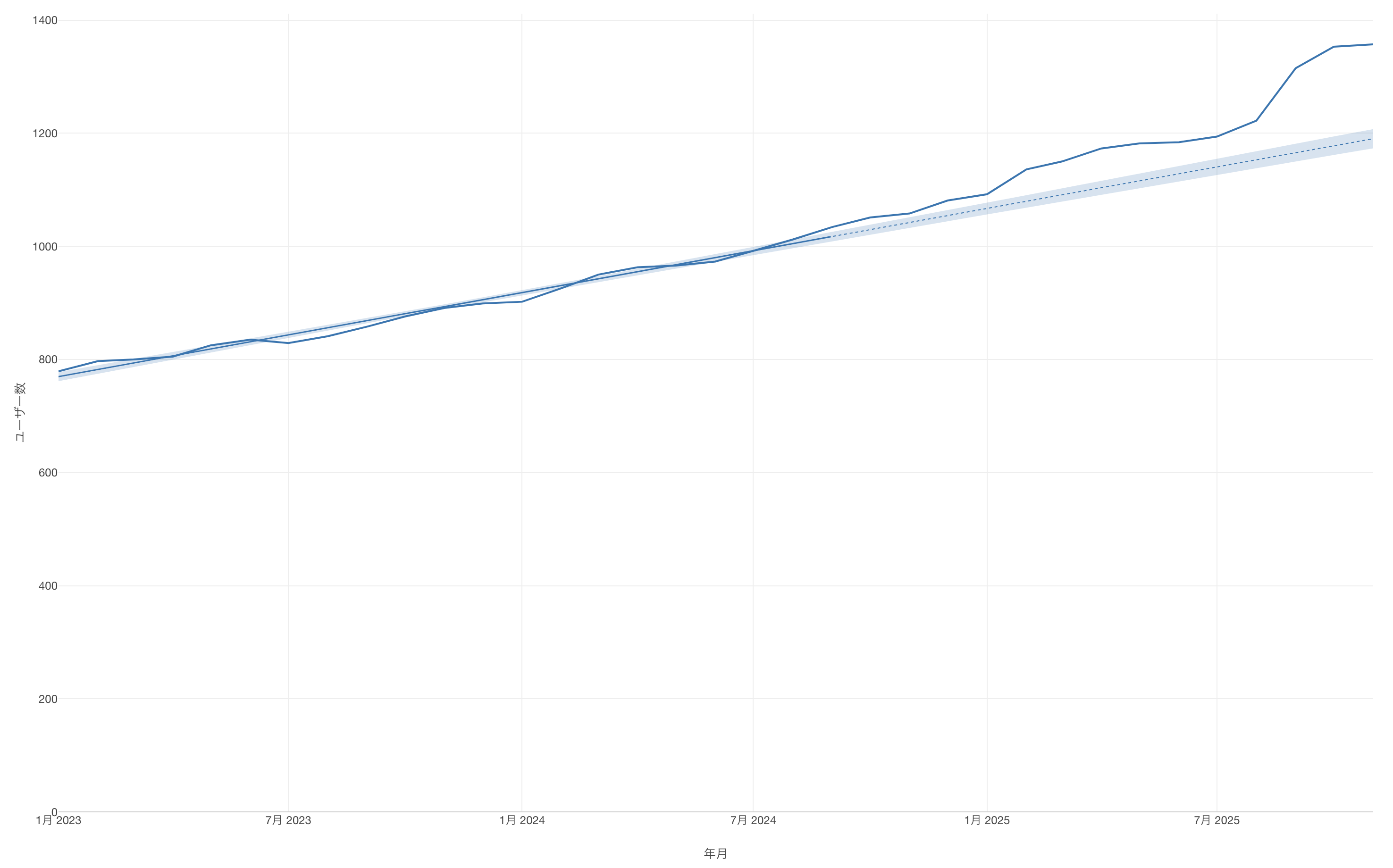 ユーザー数は2023年1月から2025年11月にかけて一貫して増加傾向にあり、特に2024年10月以降は予測値を上回る成長を示しています。2025年9月には1,315ユーザー、10月には1,353ユーザー、11月には1,357ユーザーと、予測値と比較してそれぞれ149.58、175.39、166.79ユーザーの増加を記録しており、これは線形回帰モデルが示す傾向よりも実際のユーザー獲得が加速していることを示唆しています。このデータは、ユーザー獲得戦略が成功している可能性が高いことを示しており、今後のさらなる成長が期待されます。