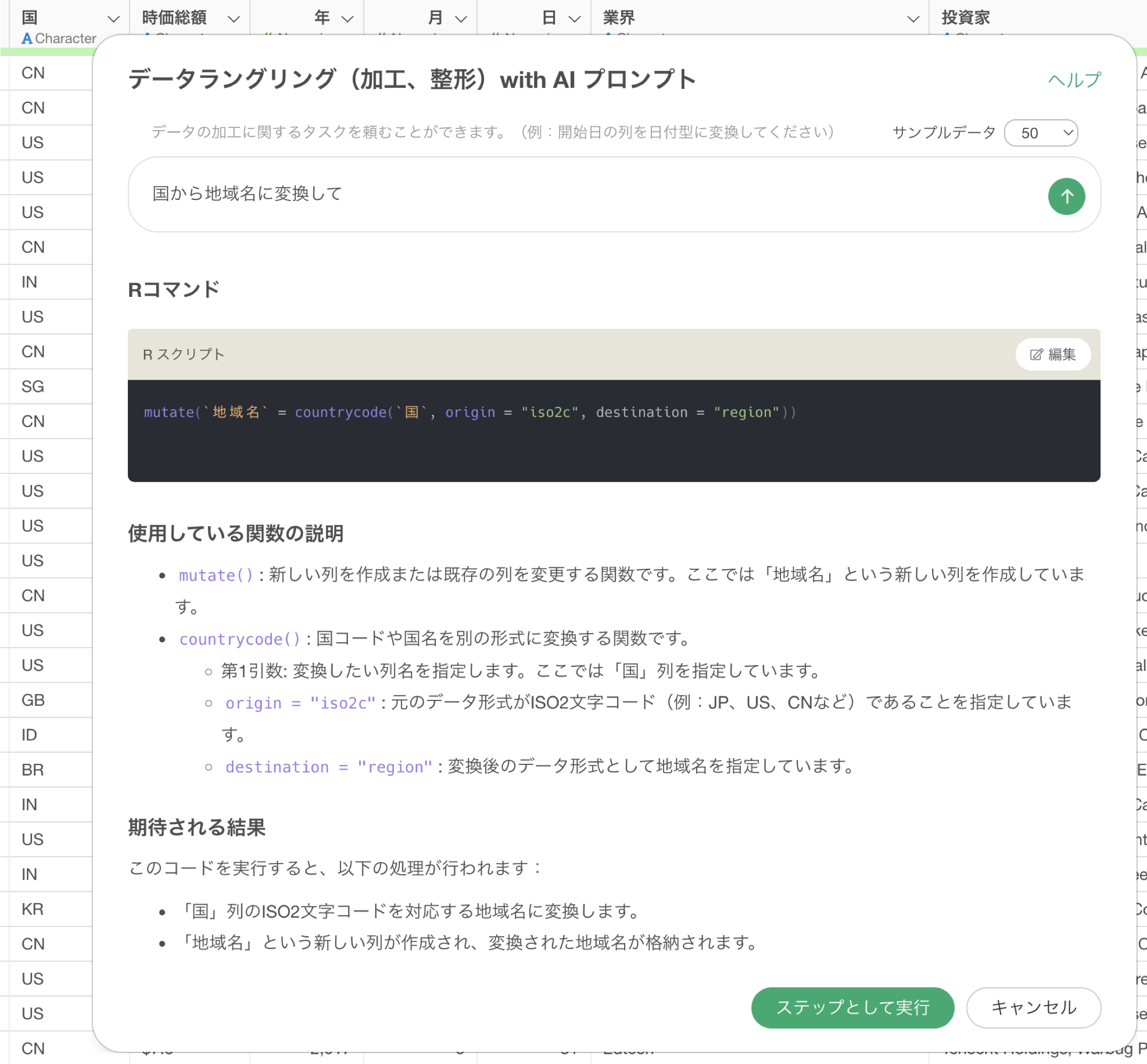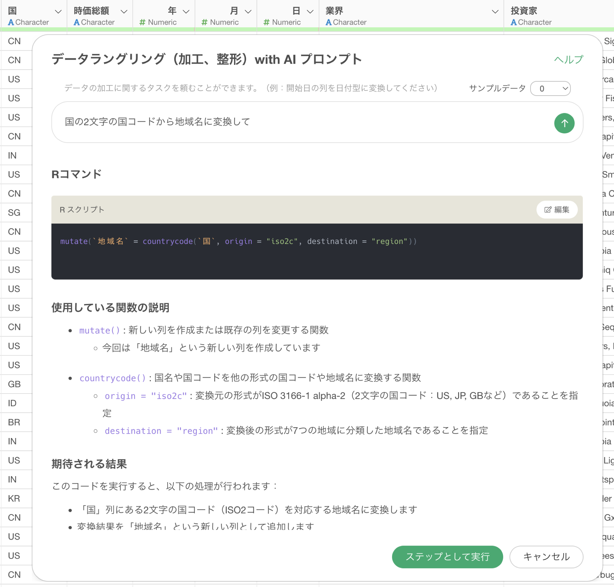 これで実行をした時に、「2文字の国コード」ではなく、「国名」から「地域名」に変換するためのRコマンドが結果として返っています。