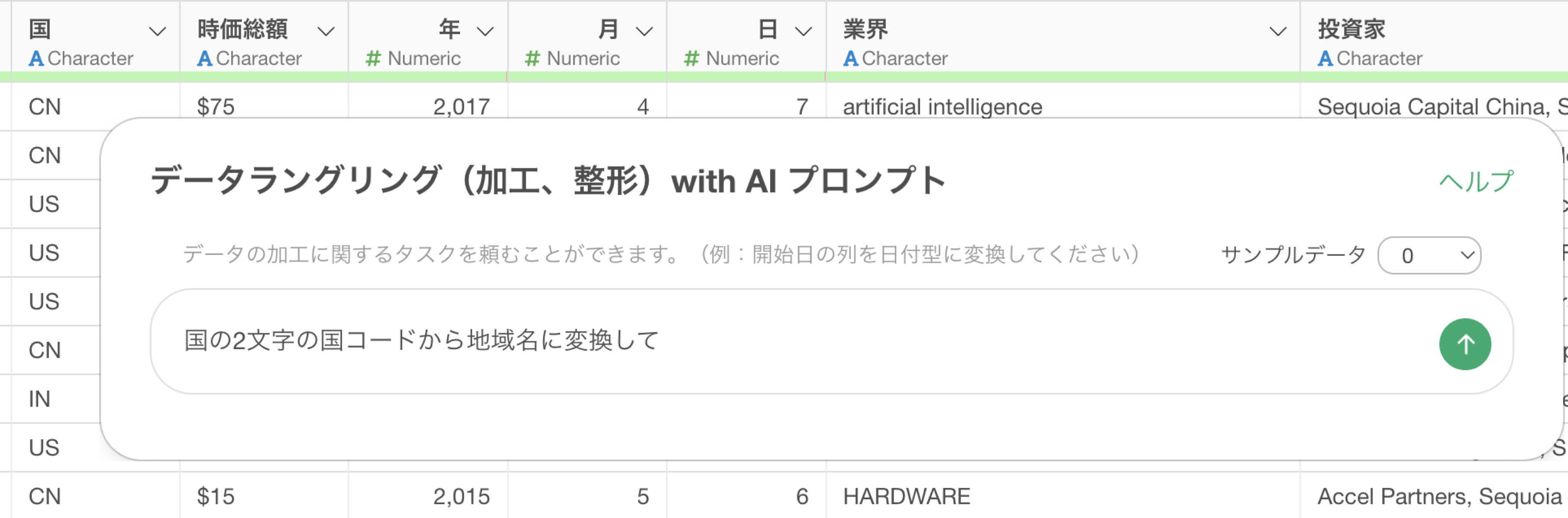1行が1ユニコーン企業のデータで「国」といった列があります。この国の列は2文字の国コードを値として持っています。今回はこの国の列から地域名の列を作成していきたいです。