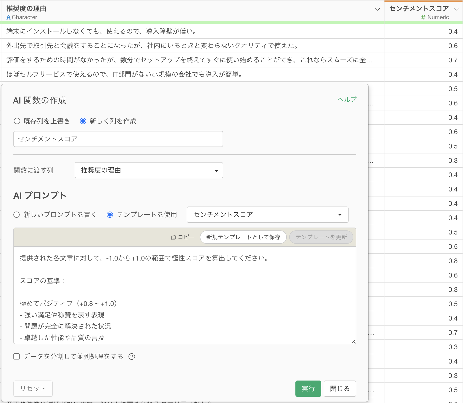 文章から感情を読み取ってスコア化する処理も、AI 関数の得意分野です。